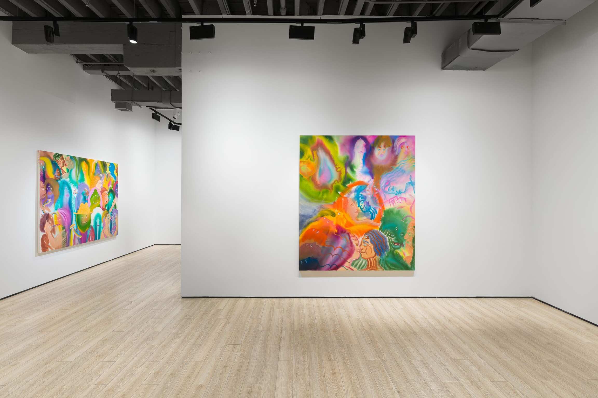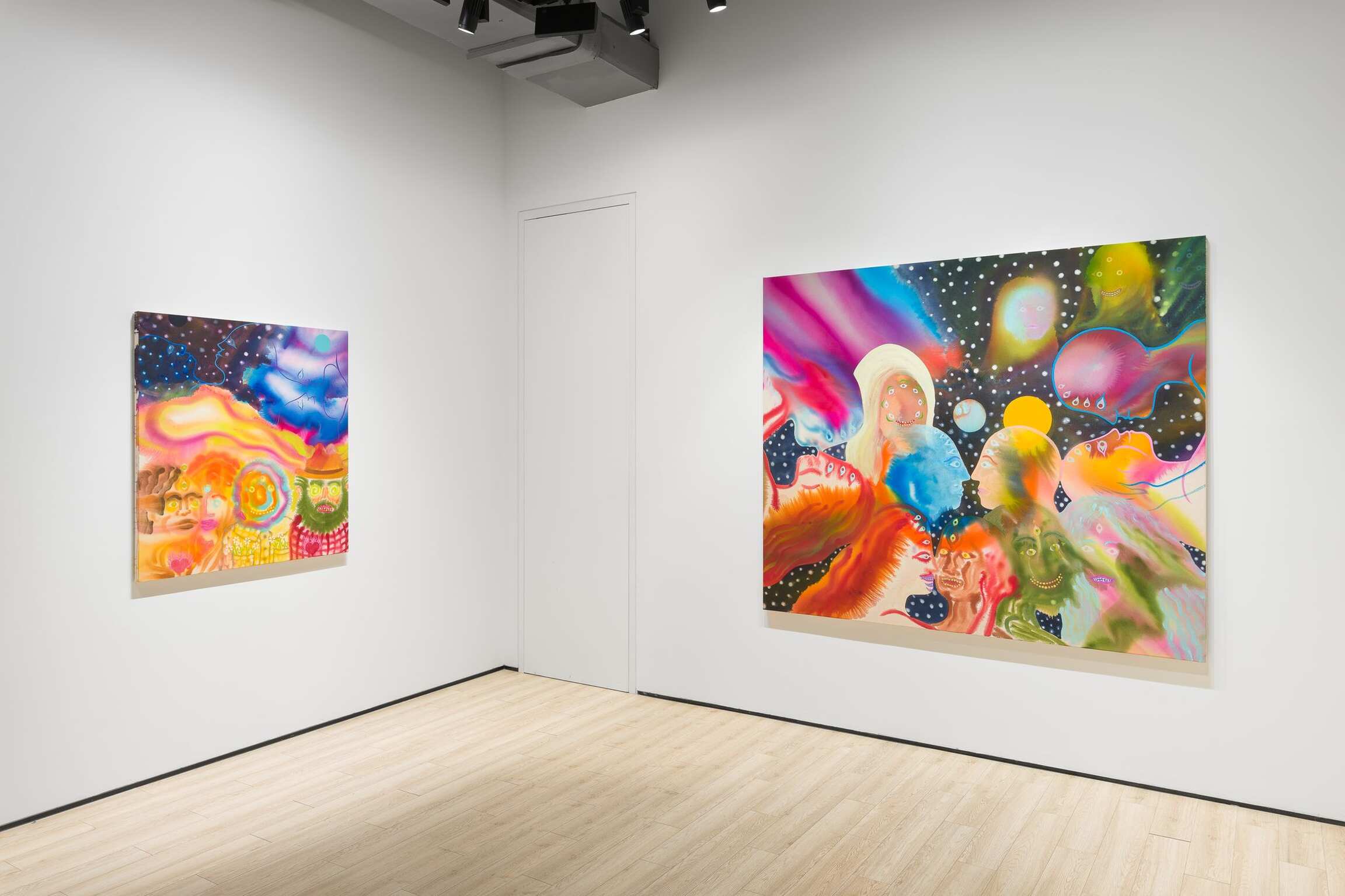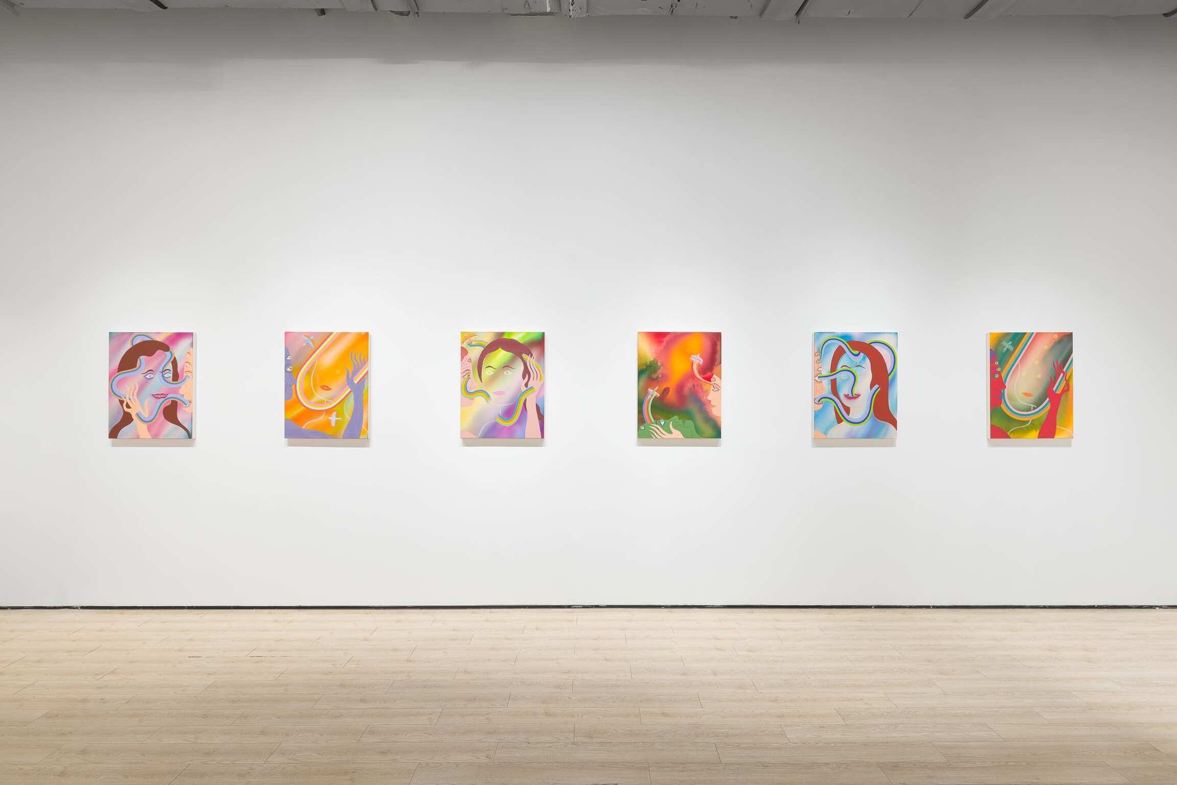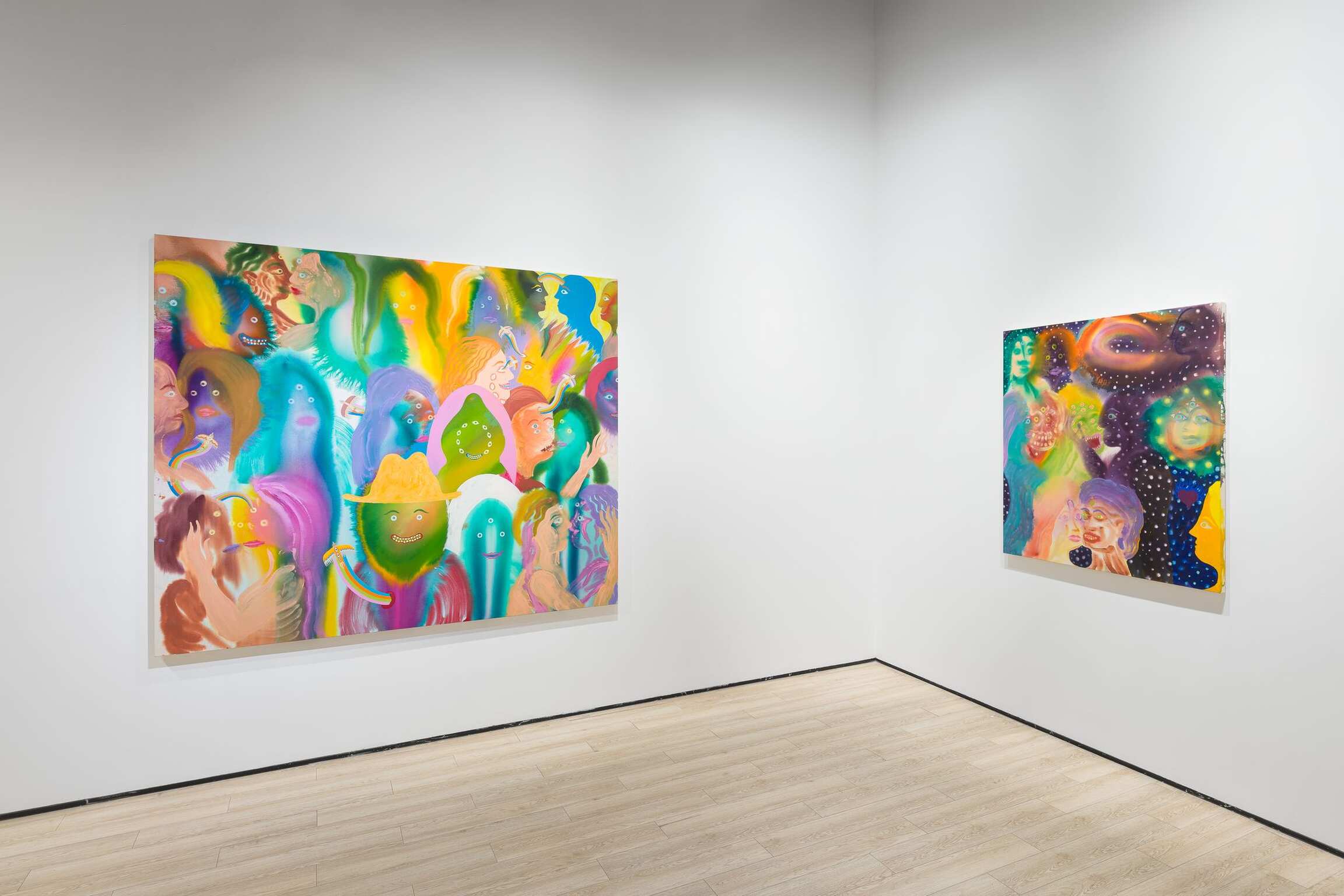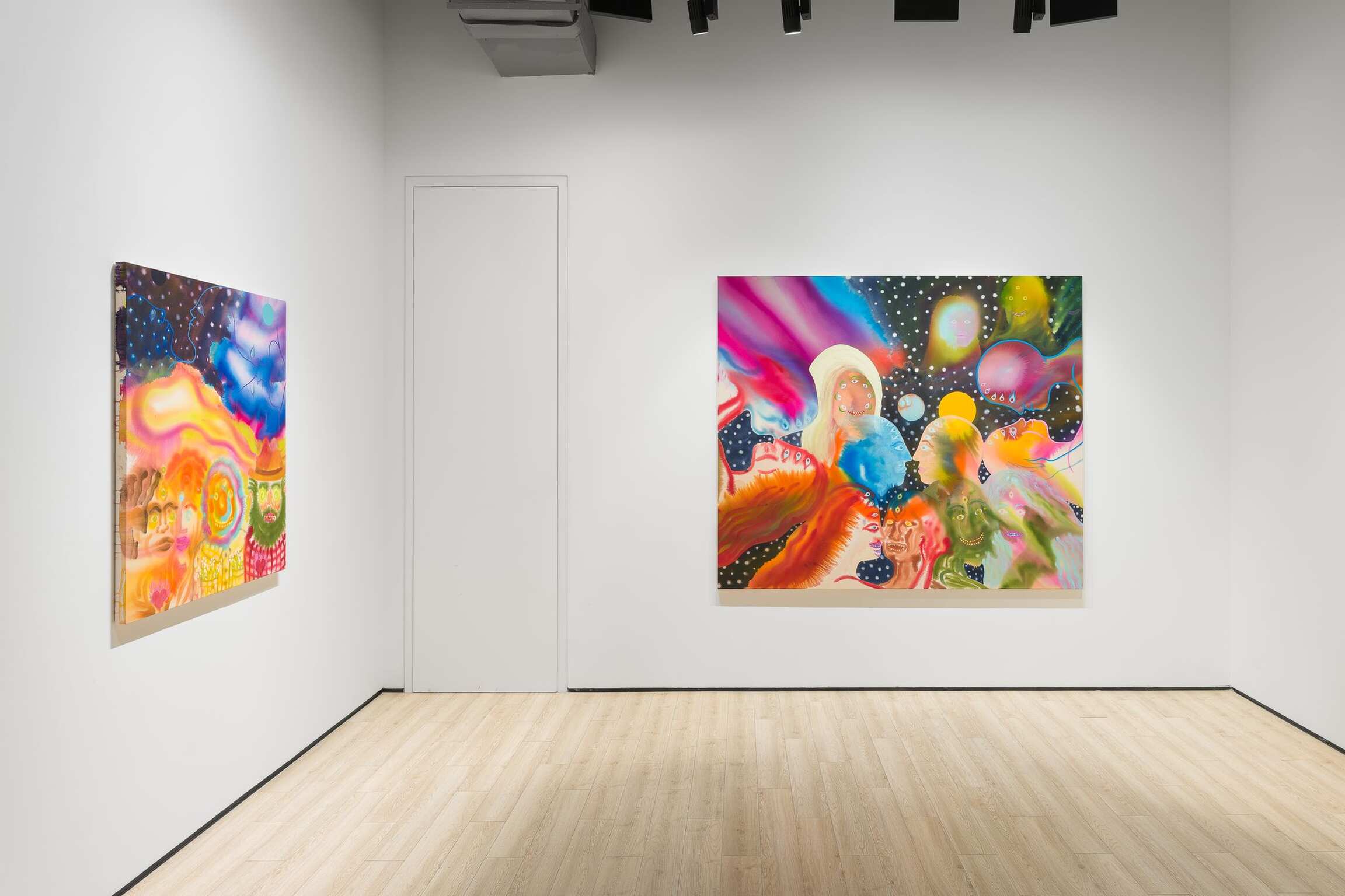 Aaron Johnson's early interest in the creative risks of experimentation, the delicate balance between control and lack of it, is pivotal to his choices of alternative approaches to painting. In his new series of figurative color field paintings, the NYC-based artist is invested in harnessing the tension between unpredictability and mastership with fluid imagery created using a stain painting technique. Gradually, this opposition between two aspects of something evolved from being the backbone of his technical approach into becoming the conceptual core of the work comprising Day is Night. In this exhibition, Johnson’s psychedelically colorful paintings reveal ethereal figures dissolving into hazes of disembodied color, as otherworldly fluid visualizations of the cosmic interconnectedness of all things.