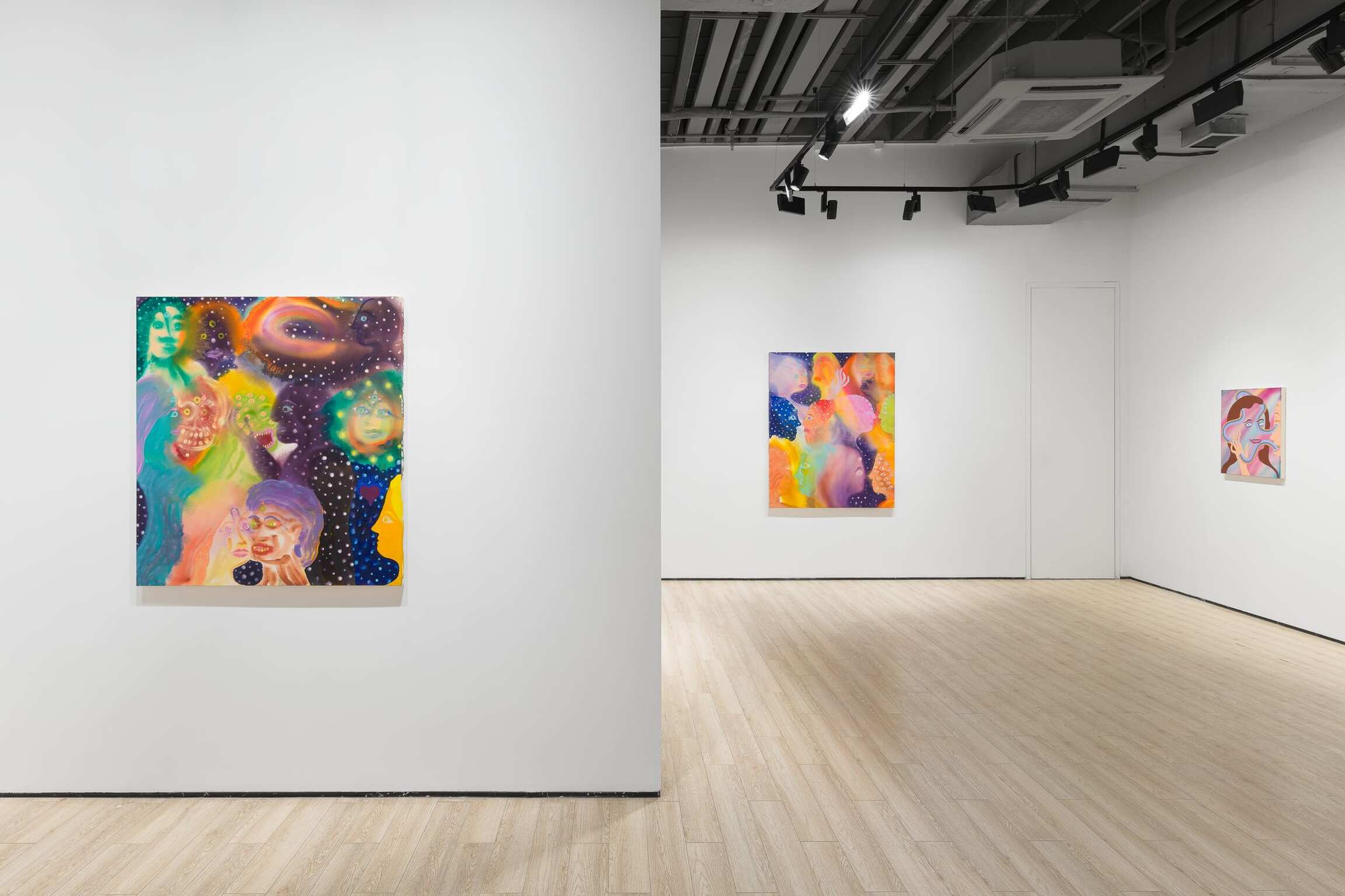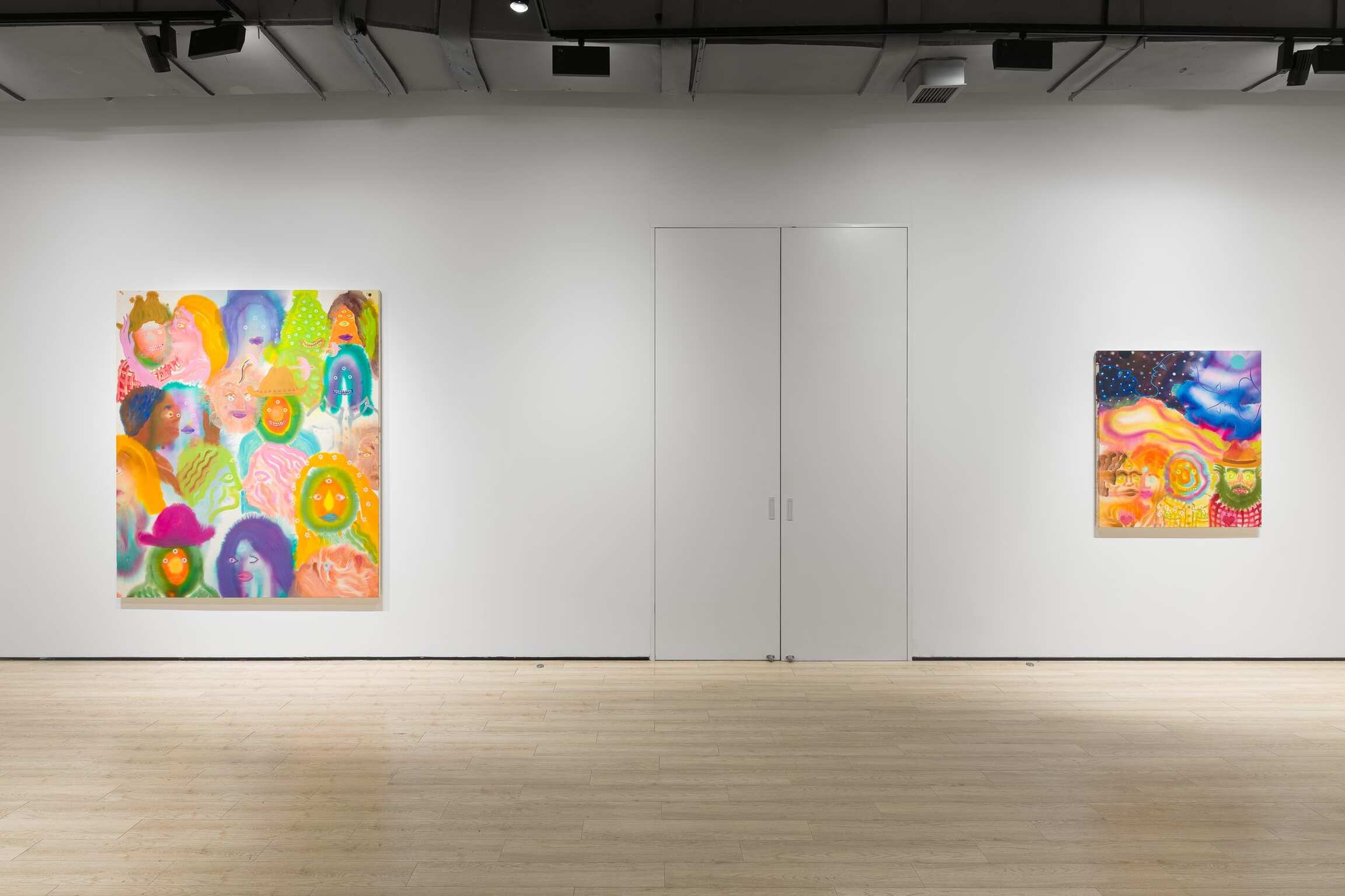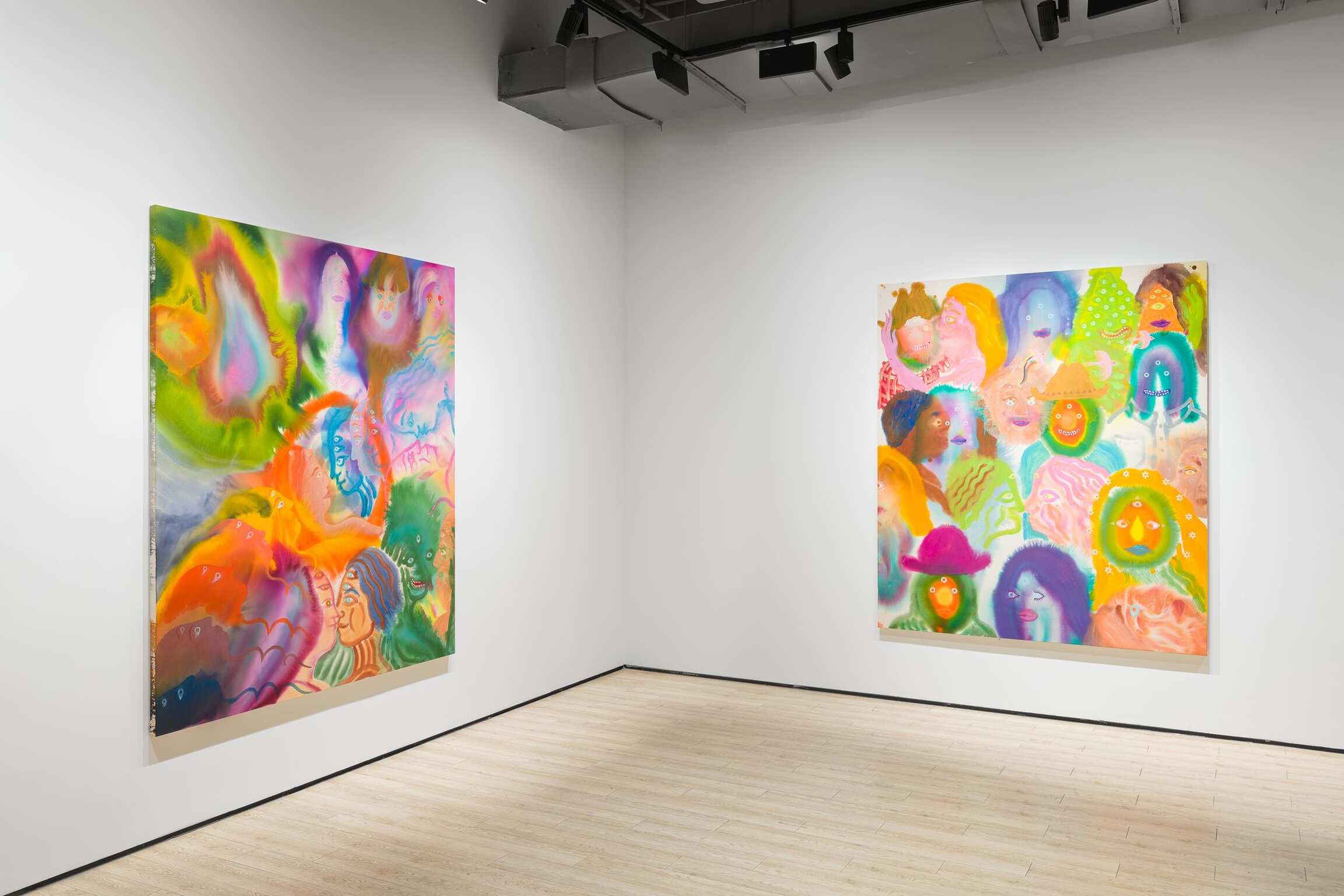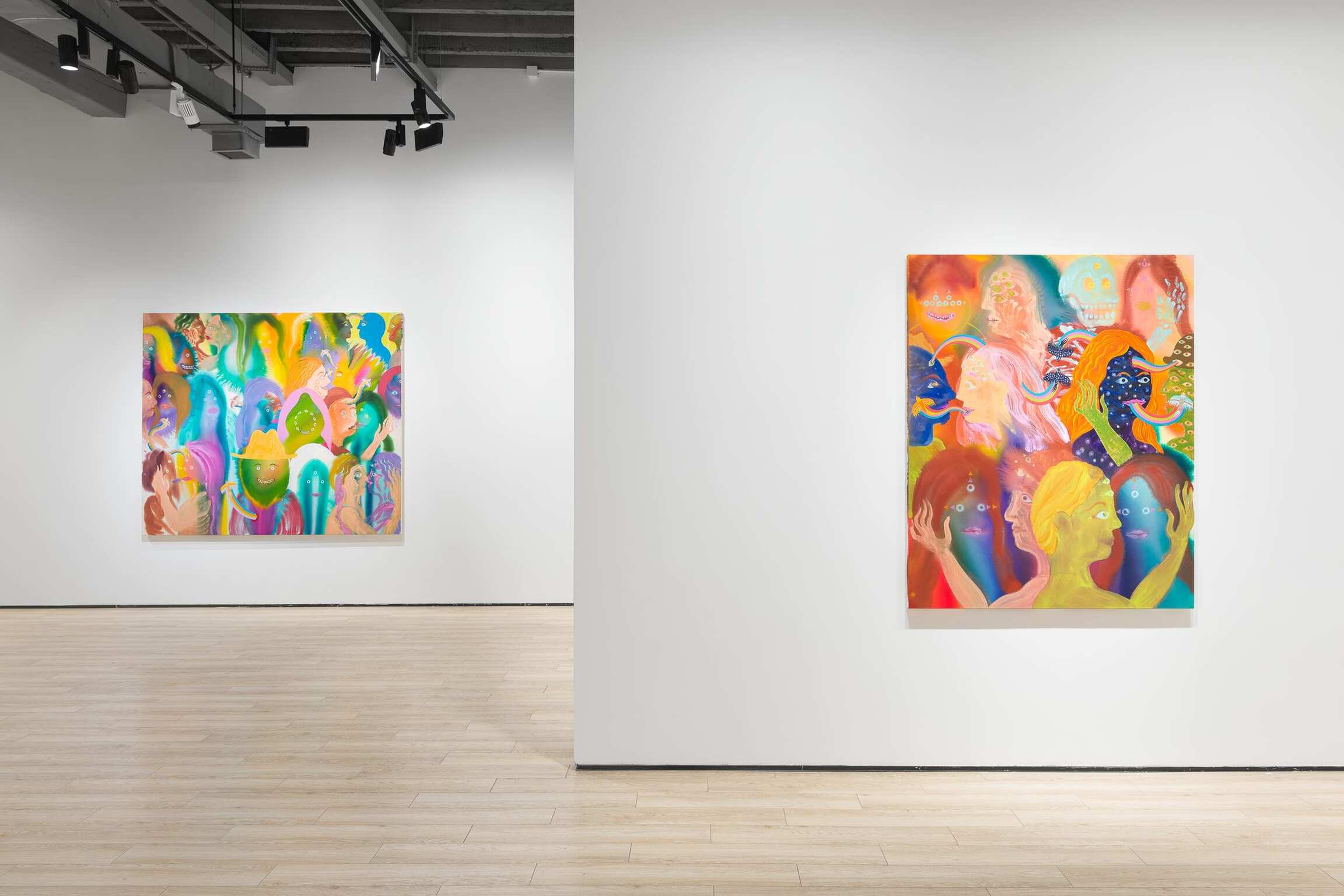 Aaron Johnson's early interest in the creative risks of experimentation, the delicate balance between control and lack of it, is pivotal to his choices of alternative approaches to painting. In his new series of figurative color field paintings, the NYC-based artist is invested in harnessing the tension between unpredictability and mastership with fluid imagery created using a stain painting technique. Gradually, this opposition between two aspects of something evolved from being the backbone of his technical approach into becoming the conceptual core of the work comprising Day is Night. In this exhibition, Johnson’s psychedelically colorful paintings reveal ethereal figures dissolving into hazes of disembodied color, as otherworldly fluid visualizations of the cosmic interconnectedness of all things.