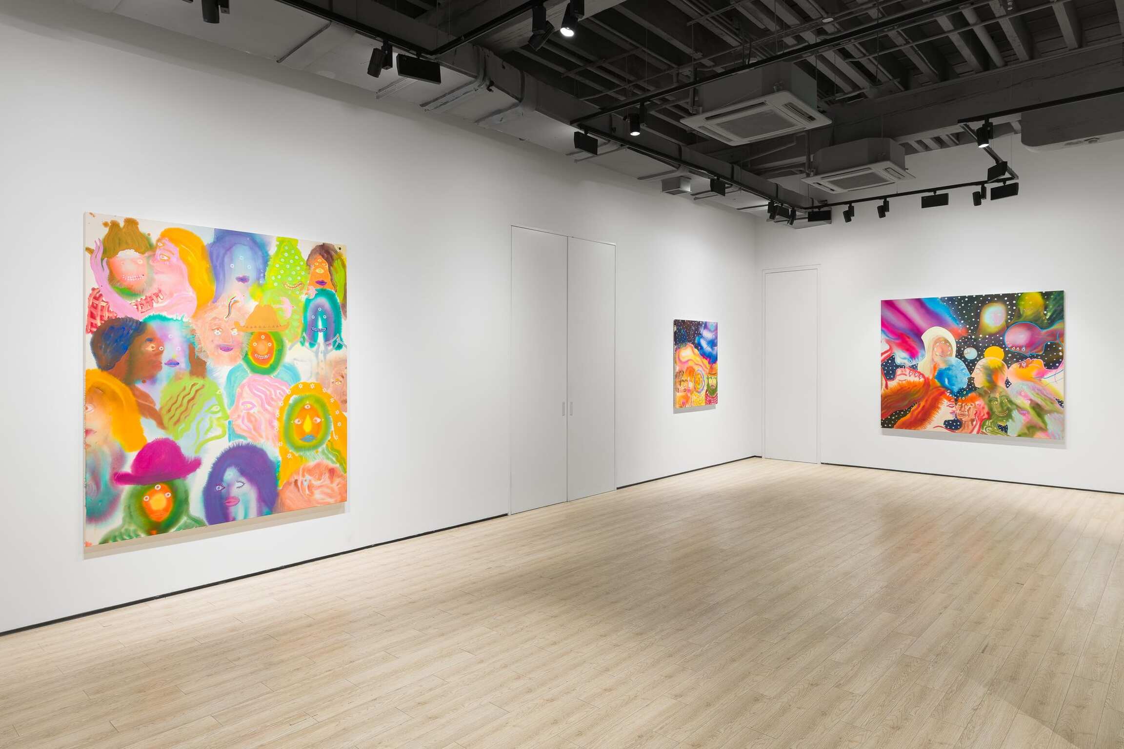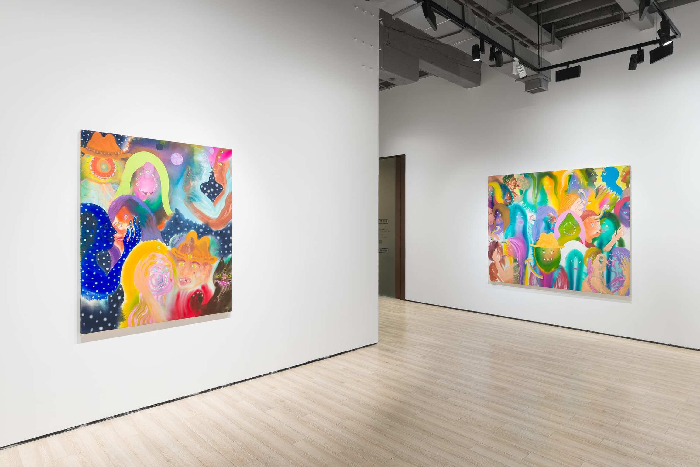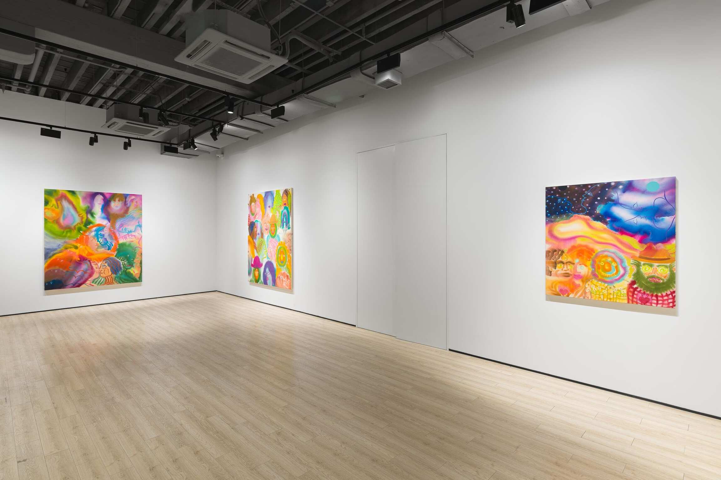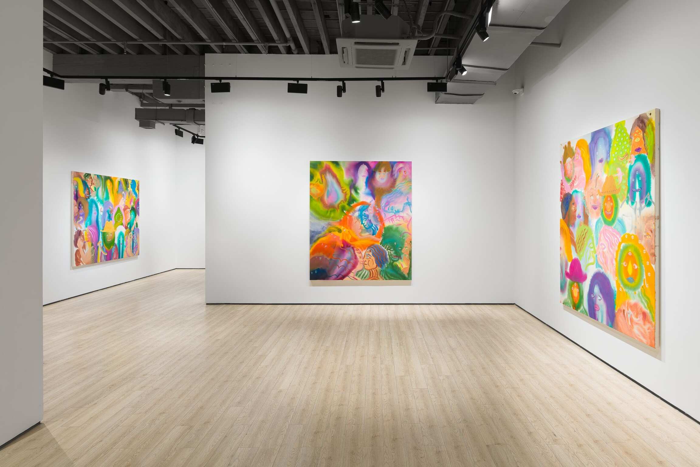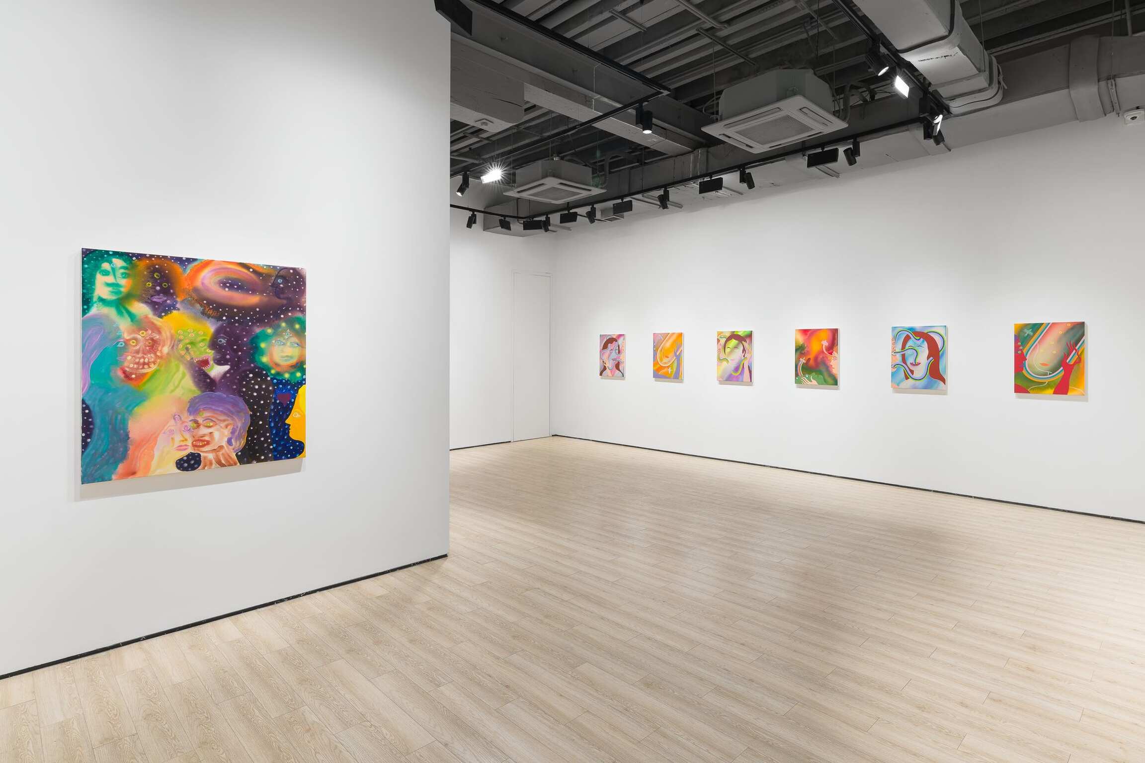 Aaron Johnson's early interest in the creative risks of experimentation, the delicate balance between control and lack of it, is pivotal to his choices of alternative approaches to painting. In his new series of figurative color field paintings, the NYC-based artist is invested in harnessing the tension between unpredictability and mastership with fluid imagery created using a stain painting technique. Gradually, this opposition between two aspects of something evolved from being the backbone of his technical approach into becoming the conceptual core of the work comprising Day is Night. In this exhibition, Johnson’s psychedelically colorful paintings reveal ethereal figures dissolving into hazes of disembodied color, as otherworldly fluid visualizations of the cosmic interconnectedness of all things.