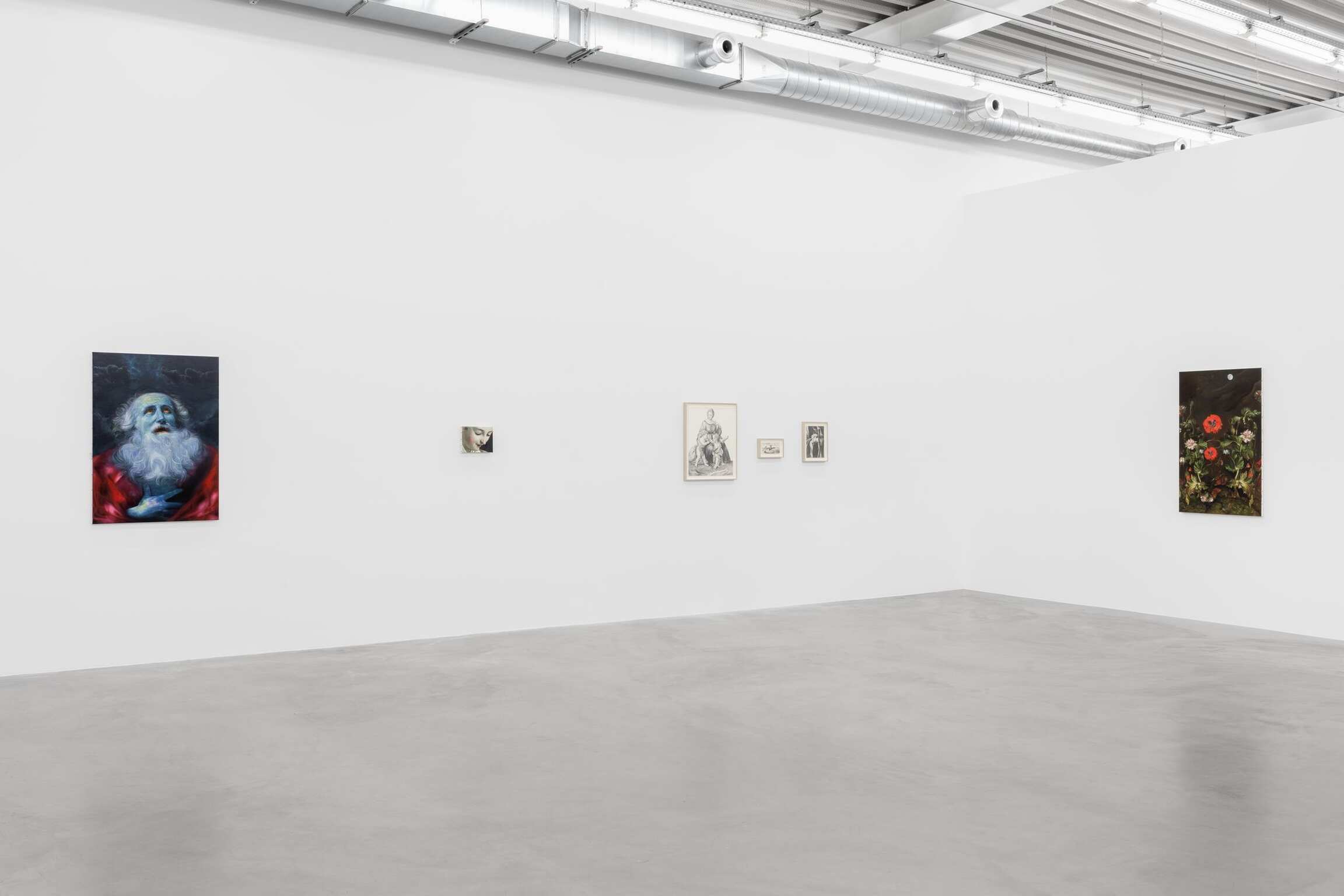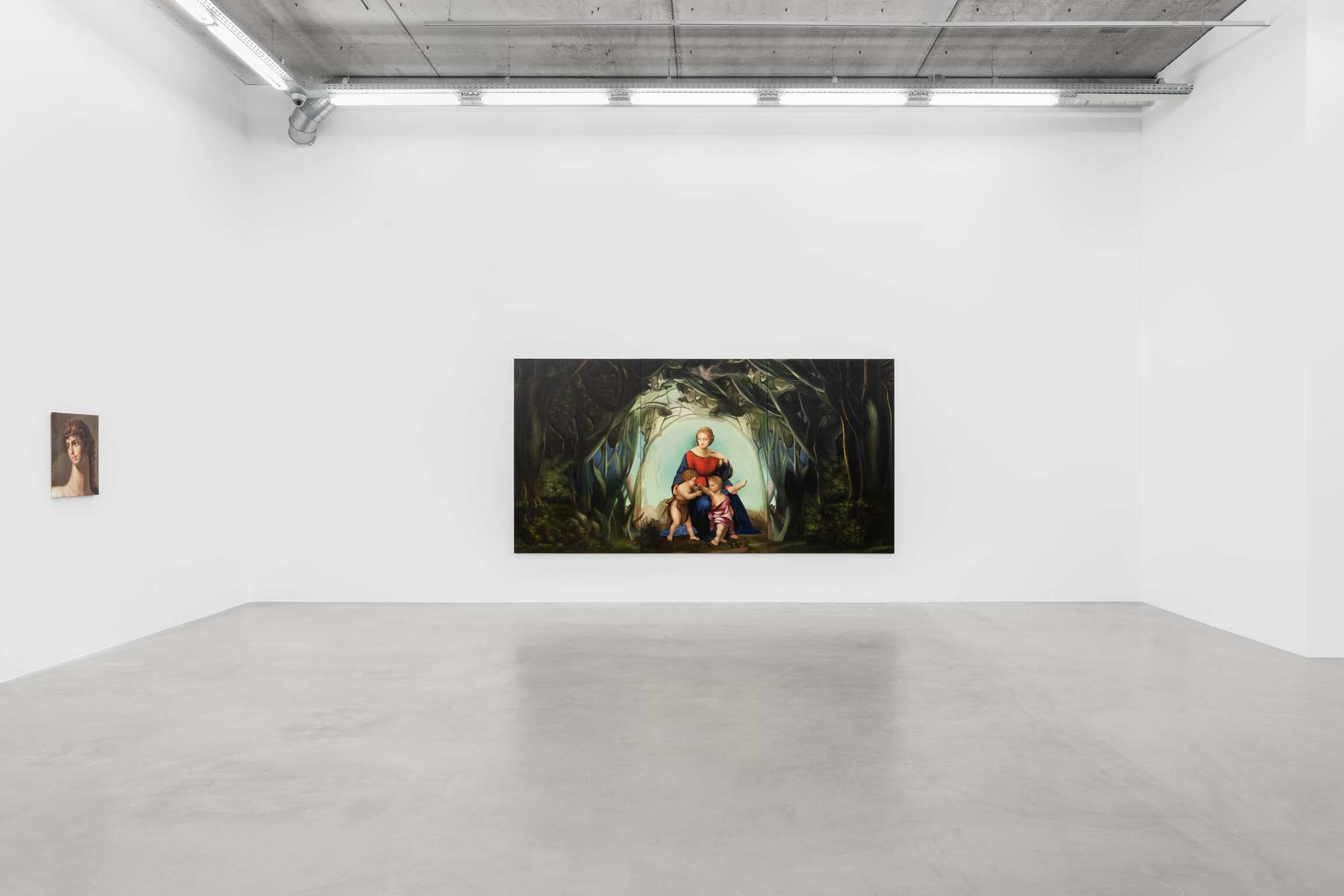 These diverse reference points are at times easier to recognise than others. The starting point for this show was the triptych, in which the Madonna and Child Pim paints are a direct quotation from Raphael’s c.1506 painting of Mary, Christ and the infant John the Baptist, known as the Madonna of the Goldfinch (because John the Baptist holds and shows the little bird to Jesus, who touches it gently). Pim was raised Catholic, in Belfast. Though he is no longer religious, the images he saw in church in his childhood have fed into and inspired his artwork: ‘I'm still fascinated by the extravagance of it all, the gold, the Baroque paintings, the feeling of awe when you enter a grand chapel’. Raphael’s numerous representations of the Madonna are some of the most iconic imagery created in the religion.