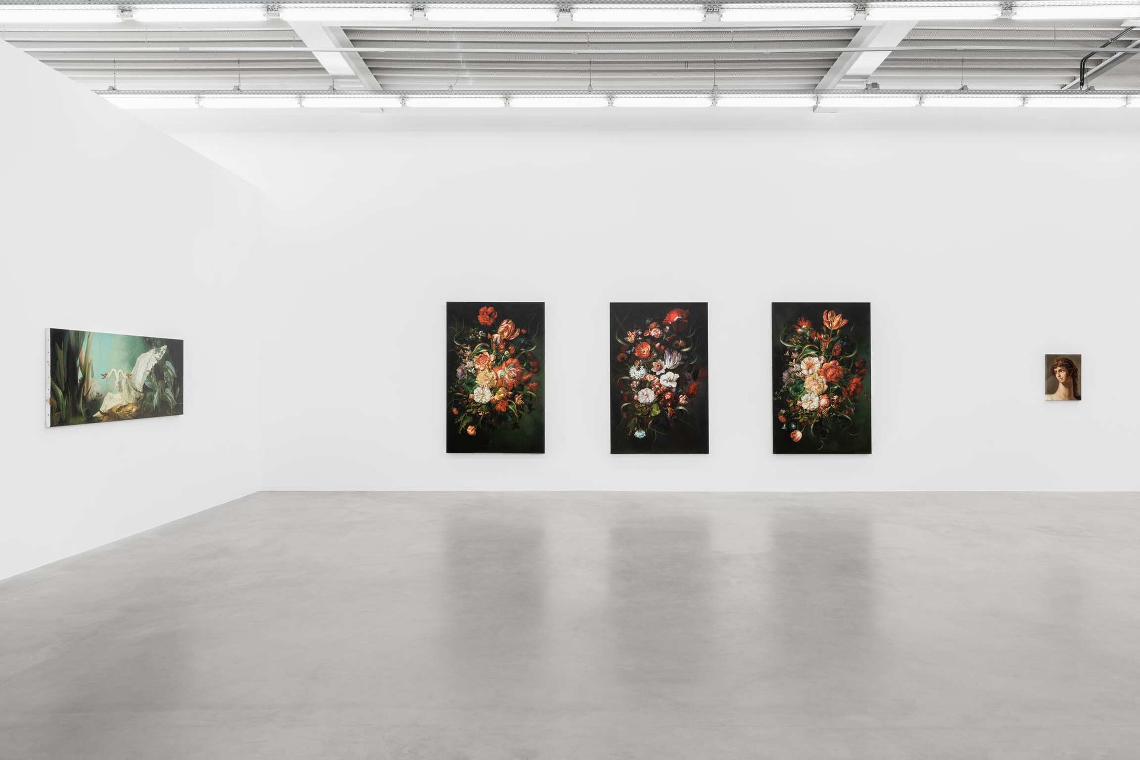 Of course, Pim’s paintings are inspired by the old masters. In his studio, printed images of Dutch seventeenth century and Italian Renaissance paintings, among others, are tacked to the walls next to the canvases he is working on. Each painting can have a number of sources, so a floral work could be inspired by a Dutch Golden Age canvas and a dress from a contemporary fashion shoot can end up as the garb of one of Pim’s figures, looking contemporary and Renaissance at once. This mix of high art and mass produced imagery is in keeping with Pim’s work, where references, direct quotations, source imagery, stories and personal associations meet. He builds singular paintings from multiple art historical sources, and the result is a personal vision, where, Pim says, he constructs his own reality.
