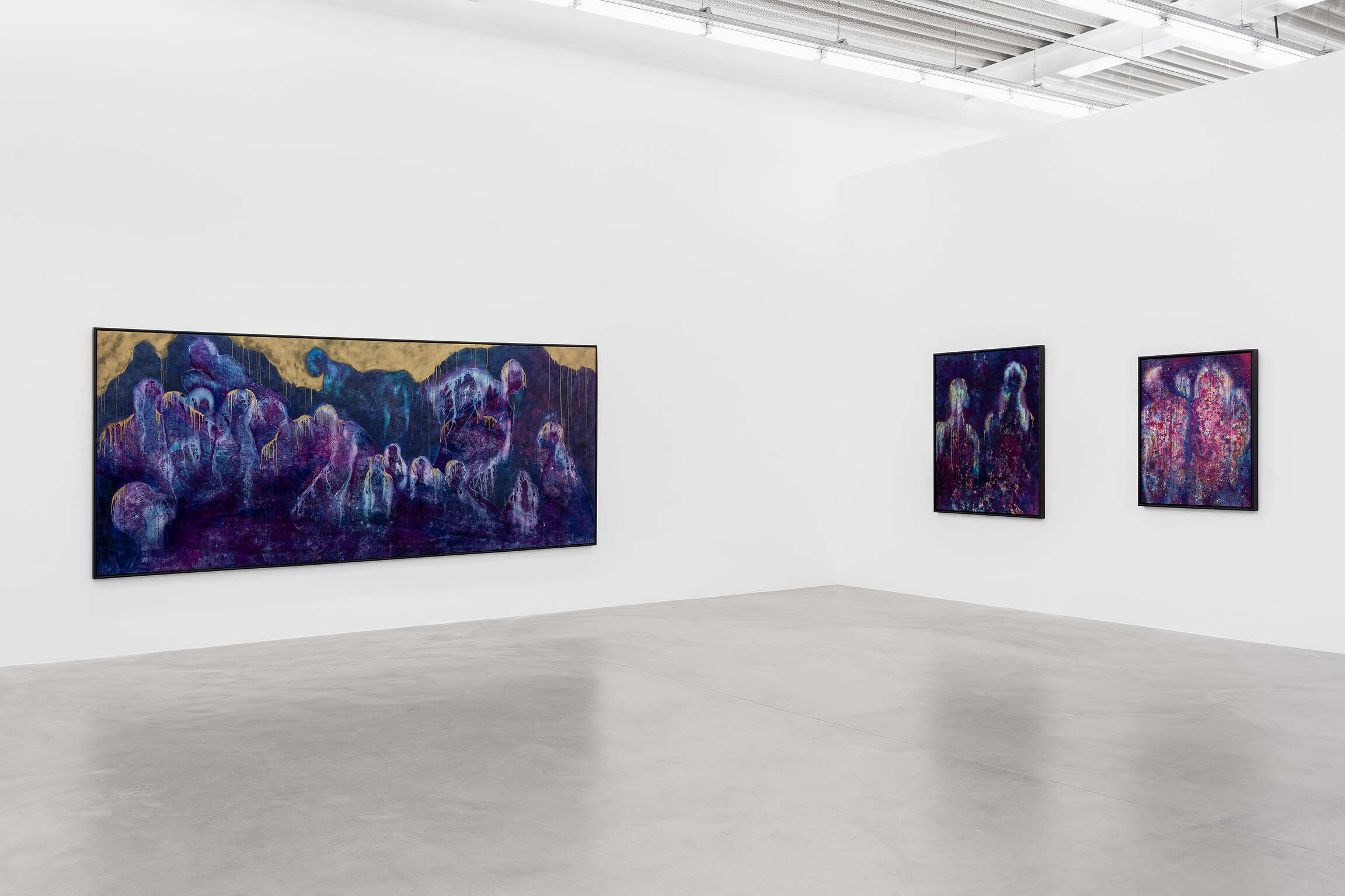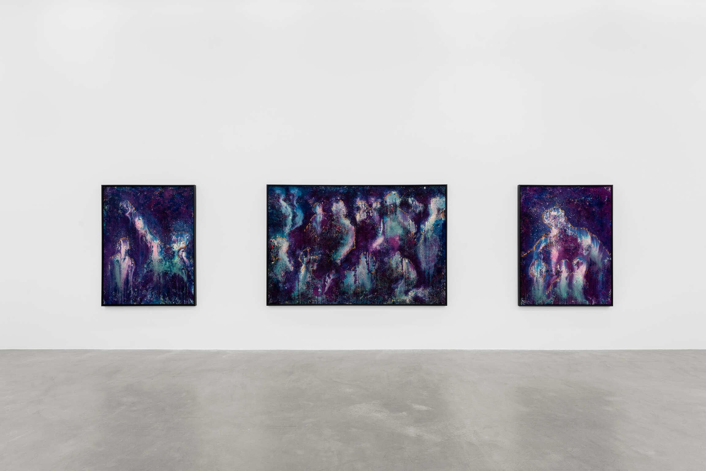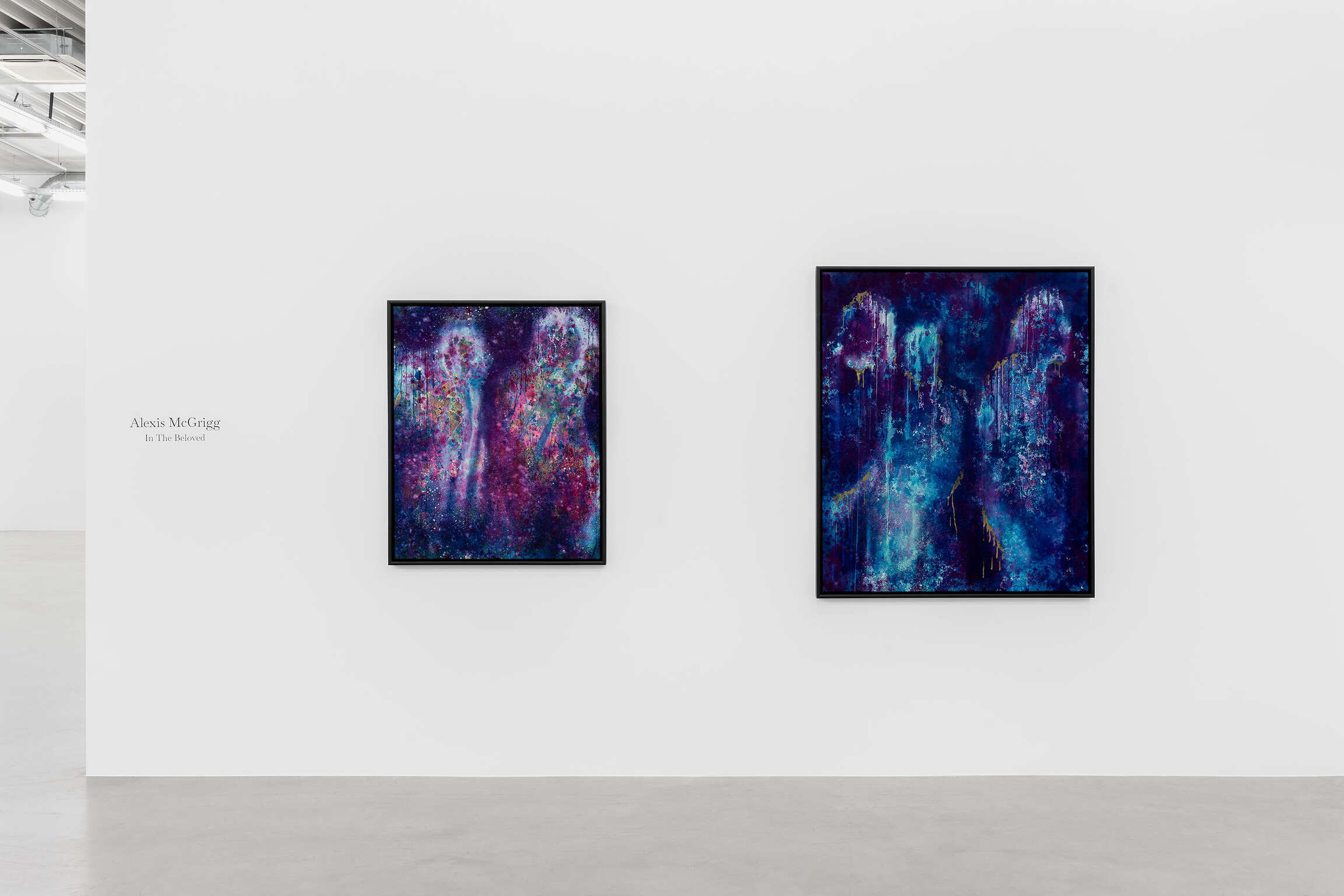 De wolkachtige silhouetten in deze schilderijen zijn inderdaad voorgevormd door de ruimte om hen heen, gecreëerd door een combinatie van toeval en intentie. De techniek van McGrigg laat een zekere mate van onvoorspelbaarheid toe, en de figuren worden bepaald door de plaats waar zij ze onthuld ziet worden via de aanvankelijke gelaagdheid van gevlekte, wervelende kleuren. De vermenging van binnen en buiten, die fundamenteel is voor haar conceptualisatie van ‘The Beloved’, wordt ook visueel weergegeven door de poreusheid tussen de figuren en wat hen omringt. De daaruit voortvloeiende uitwisselbaarheid van materialen toont dat ze niet simpelweg van vergelijkbare, maar van dezelfde materie zijn. De schilderijen maken gebruik van een Zwarte metafysica die veronderstelde fysieke barrières tussen levende wezens en hun omgeving omzeilt. Haar spectrale figuraties, constitutief verwerven met hun ruimte, zijn herkenbaar aan hun lichtgevende contouren: troebele sporen van wit en losse contouren van goudstof. Hoewel enkele van hen als solitaire figuren verschijnen, hebben de meeste gezelschap, wat deze serie maakt tot een weergave van McGrigg’s onderzoek naar collectieve en gemeenschappelijke manieren van zijn.