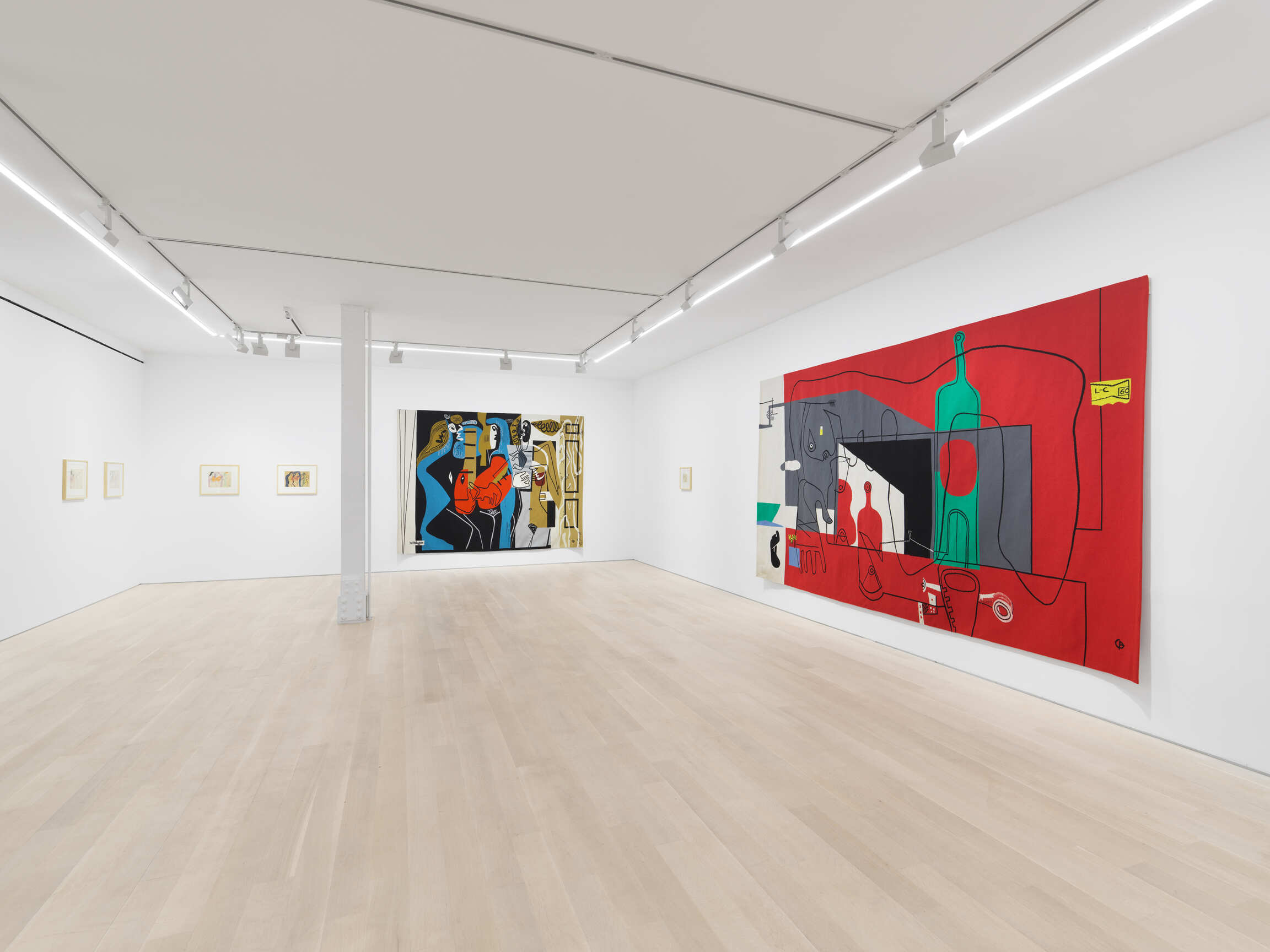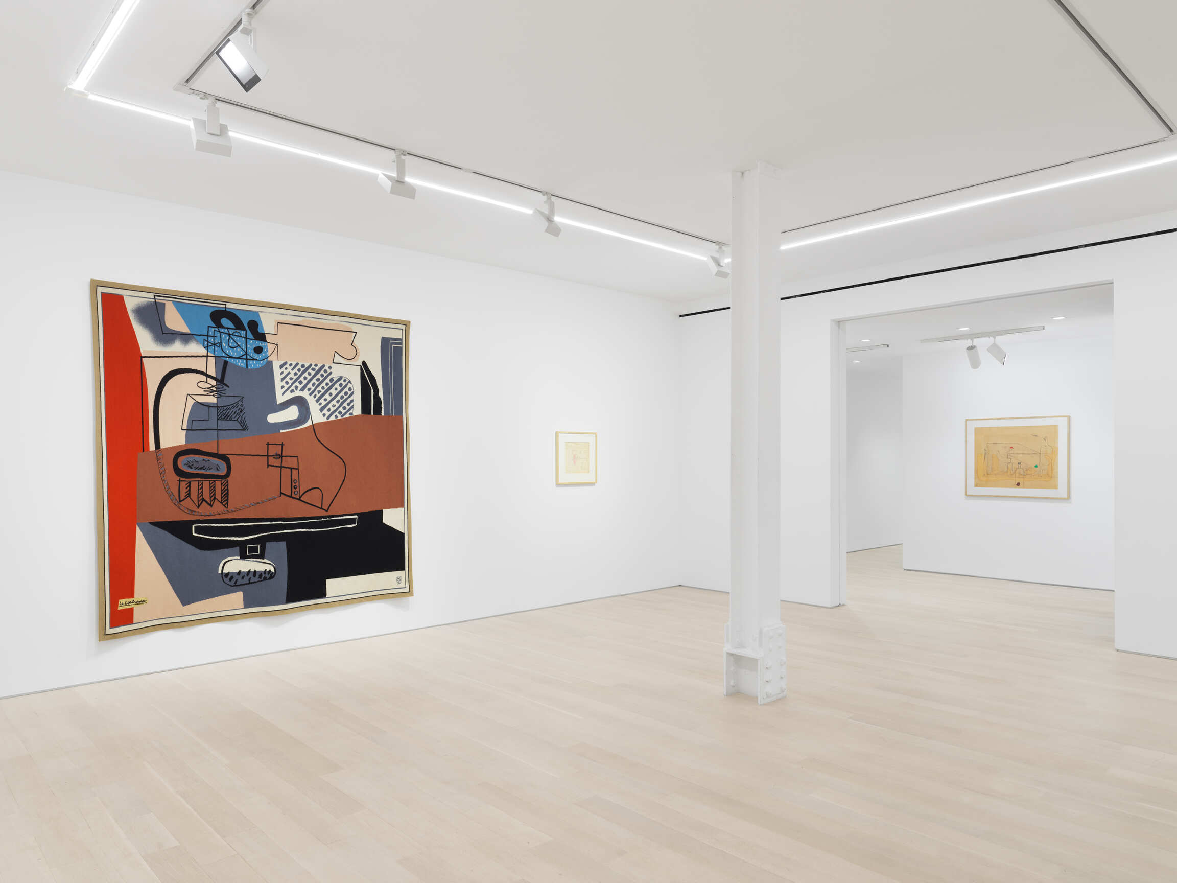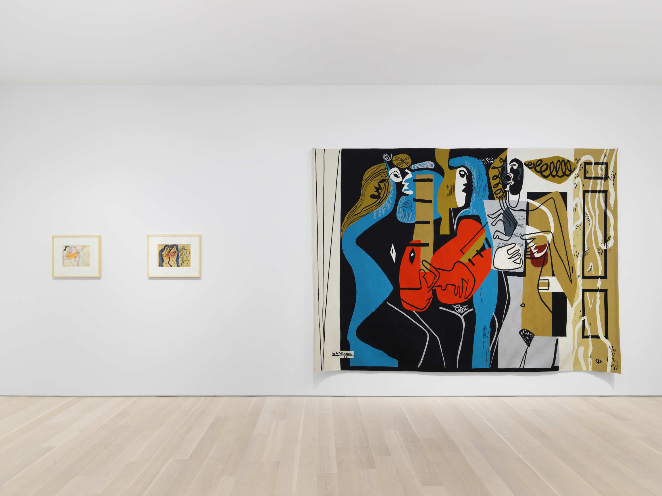 The variety of artistic techniques used by Le Corbusier to design the cartoons of some twenty-six tapestries that Baudouin produced can be seen in the artworks brought together by the gallery, from colored pencil to pastel, oil, and papier collé. In this way, the exhibition reveals all the resources of an architect who had told Guggenheim Museum director James Johnson Sweeney in 1957: “I am a painter, very seriously.” Exploring all the processes used on paper, the exhibition expresses the vividness of his imagination by unveiling the originality and strength of his woven artworks within the wider context of postwar tapestry.