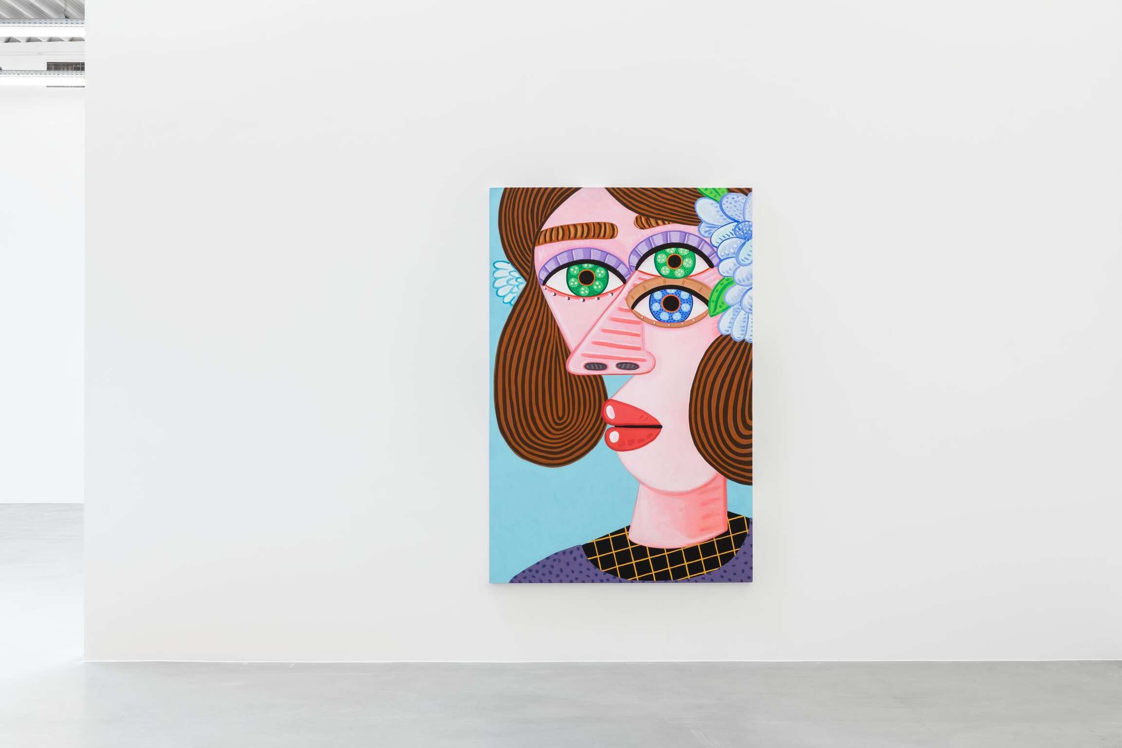 Calvin explique que c’est ‘à rebours’ qu’il a découvert Picasso, dont les portraits cubistes synthétiques influencent explicitement son travail depuis 2020. À ses yeux, le cubisme est un moyen de faire figurer plus d’informations dans un contenant cadre pictural donné. Plus de temps, plus d’espace, plus de couleur, plus de texture, plus de motifs et d’ornementation : Calvin commence par évider les visages, les réduisant à des formes élémentaires, puis les remplit à ras bord, à la limite du débordement.
