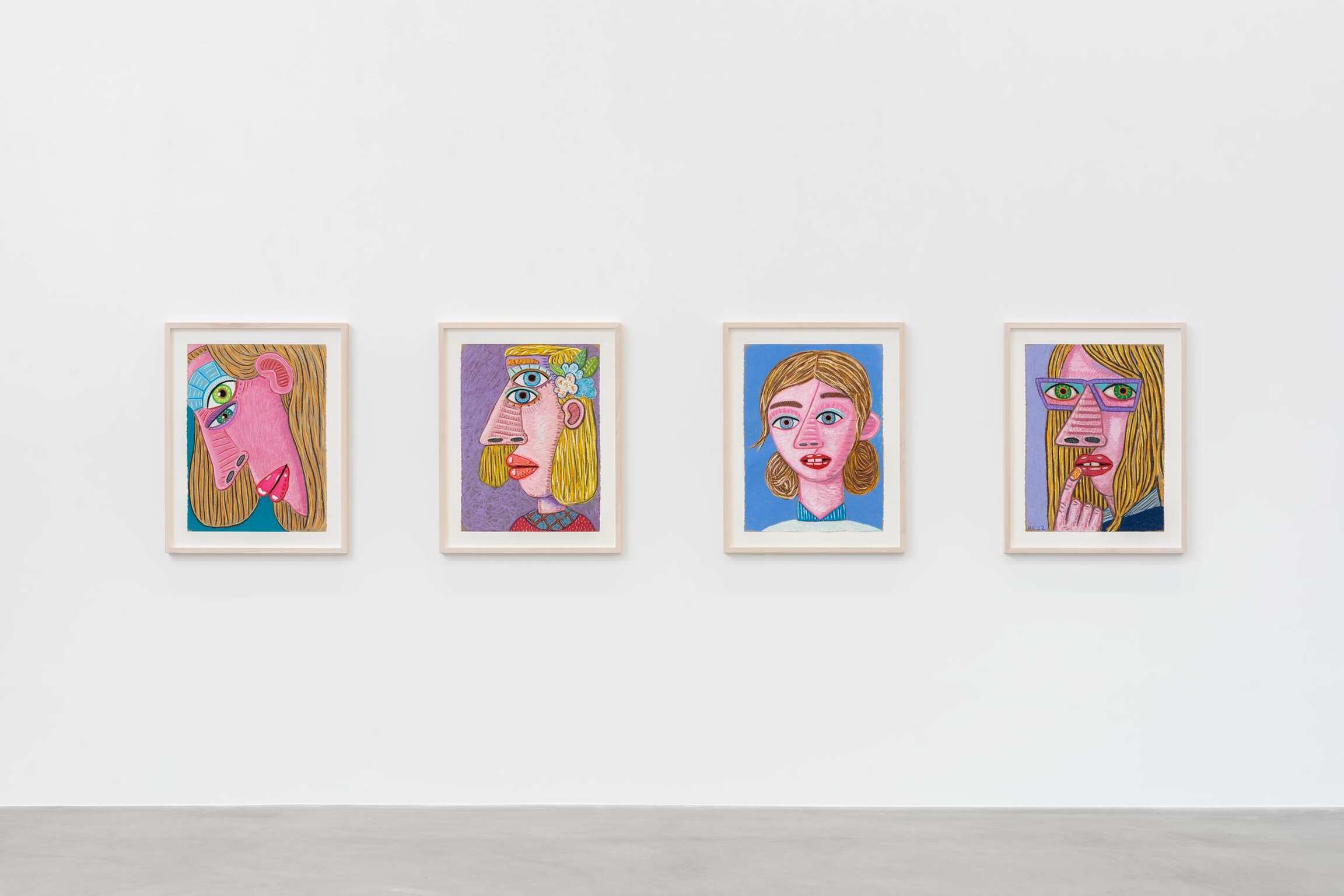 Dans de précédents travaux, Calvin s’est essayé à des compositions de figures multiples, faites de visages empilés, alignés, formant des ensembles complexes enchevêtrés dans un espace pictural peu profond. Dans cette nouvelle exposition de peintures à l’acrylique et de dessins au pastel, les visages seuls dominent, même si le cubisme permet à Calvin de représenter des points de vue multiples au sein d’une unique tête cadrée serréétroitement.