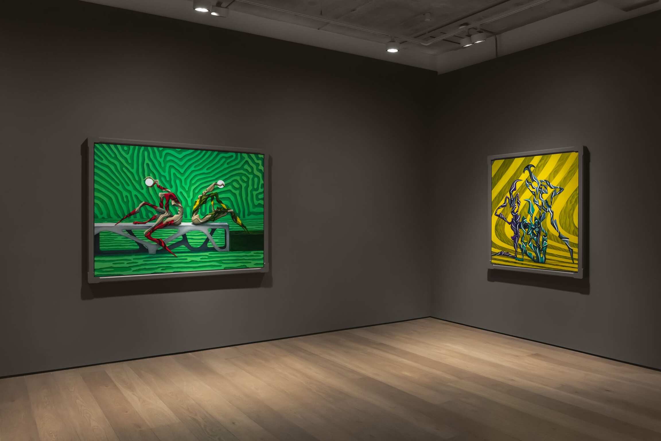 Other pieces in the show, such as Ravine, further explore this lack of specificity alongside a hopeful outlook, in what the artist denotes as “self-contained utopias.” This large-scale landscape painting depicts Cárdenas’ signature creatures dwelling on the walls of a cliff, showing signs of social organization and mutual enjoyment in a desolate space. The contradictions in this theme follows cues by artist Matthew Barney, one of Cárdenas’ early influences, as a visual transgressor, while also resorting to the otherworldly as a poignant commentary on the uses of imagination as a socially-conscious act. This is precisely one of the most compelling aspects of Cárdenas’ work, for it invites us to use creativity as a tool to rethink social and power structures.