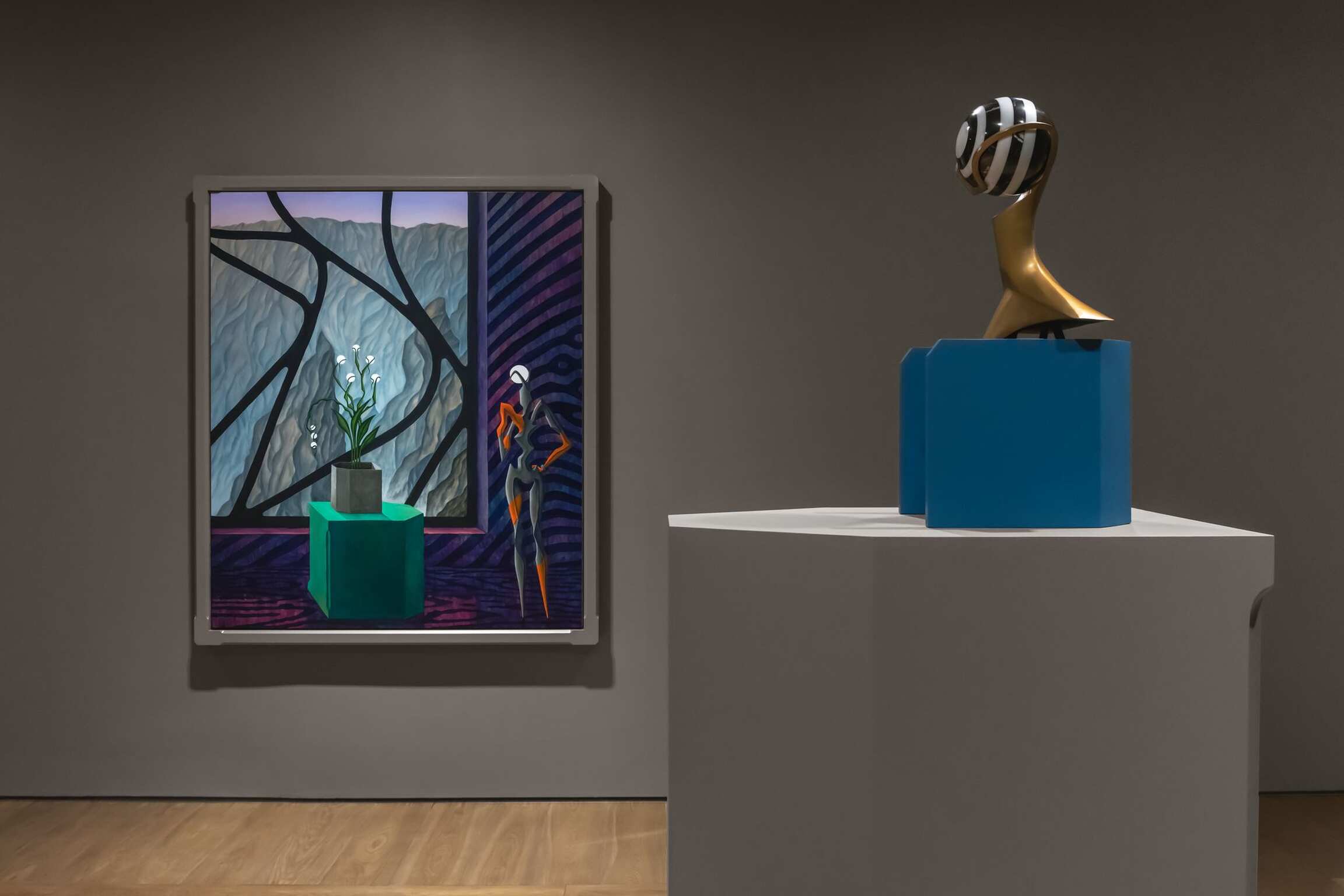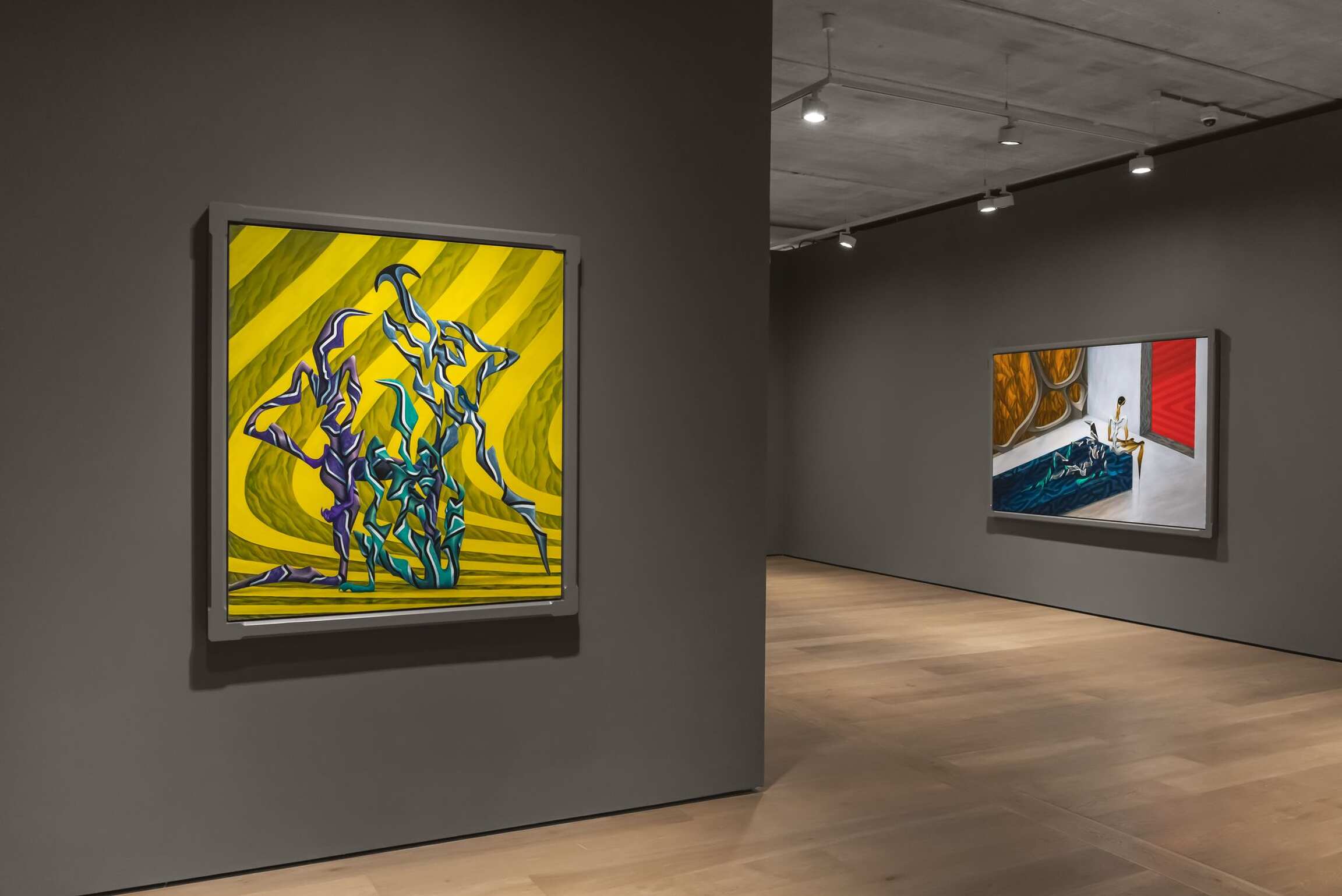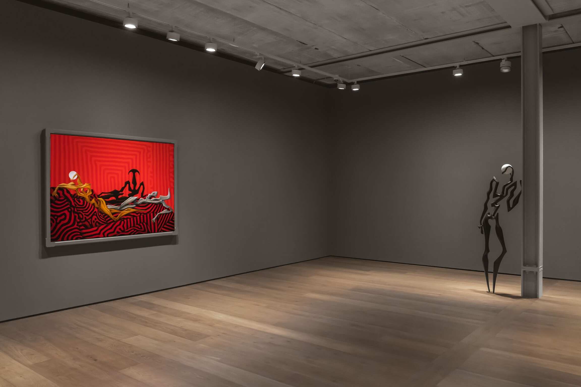 Both enticing and mysterious, the group of 10 works—8 paintings and 2 sculptures—further distill the artist’s fascination for visual synthesis. The free-flowing interplay of references deriving from established movements in the history of art with various expressions of popular culture comes to life in this show. Given the growing trend in the contemporary art world of artists creating exclusively through the lens of contentious categories, such as race, class, and gender, this is a divergent and significant enterprise. His figures’ mutability and permeability avoid being confined within a single space, thus sidestepping swift, commonplace interpretations.