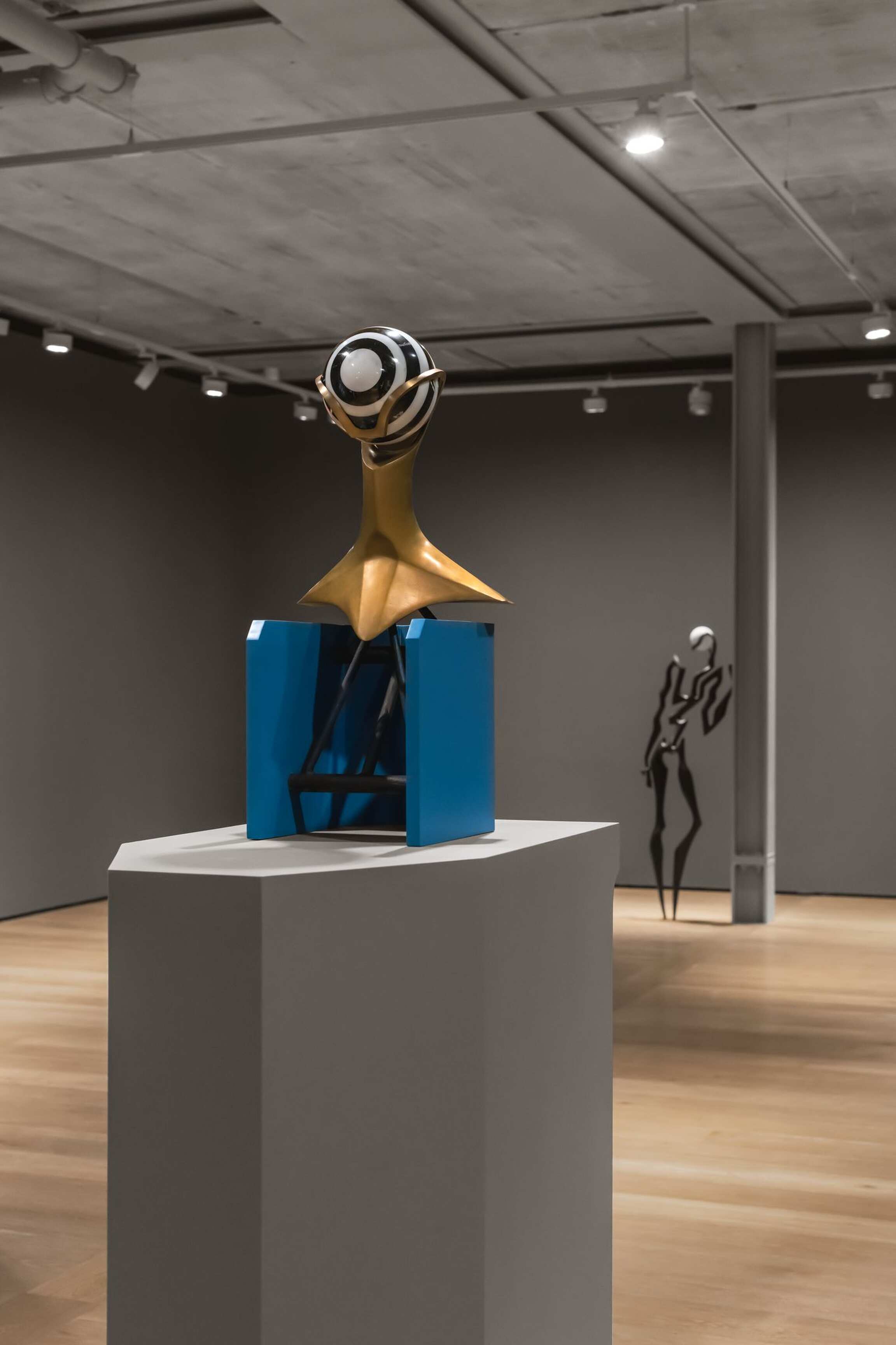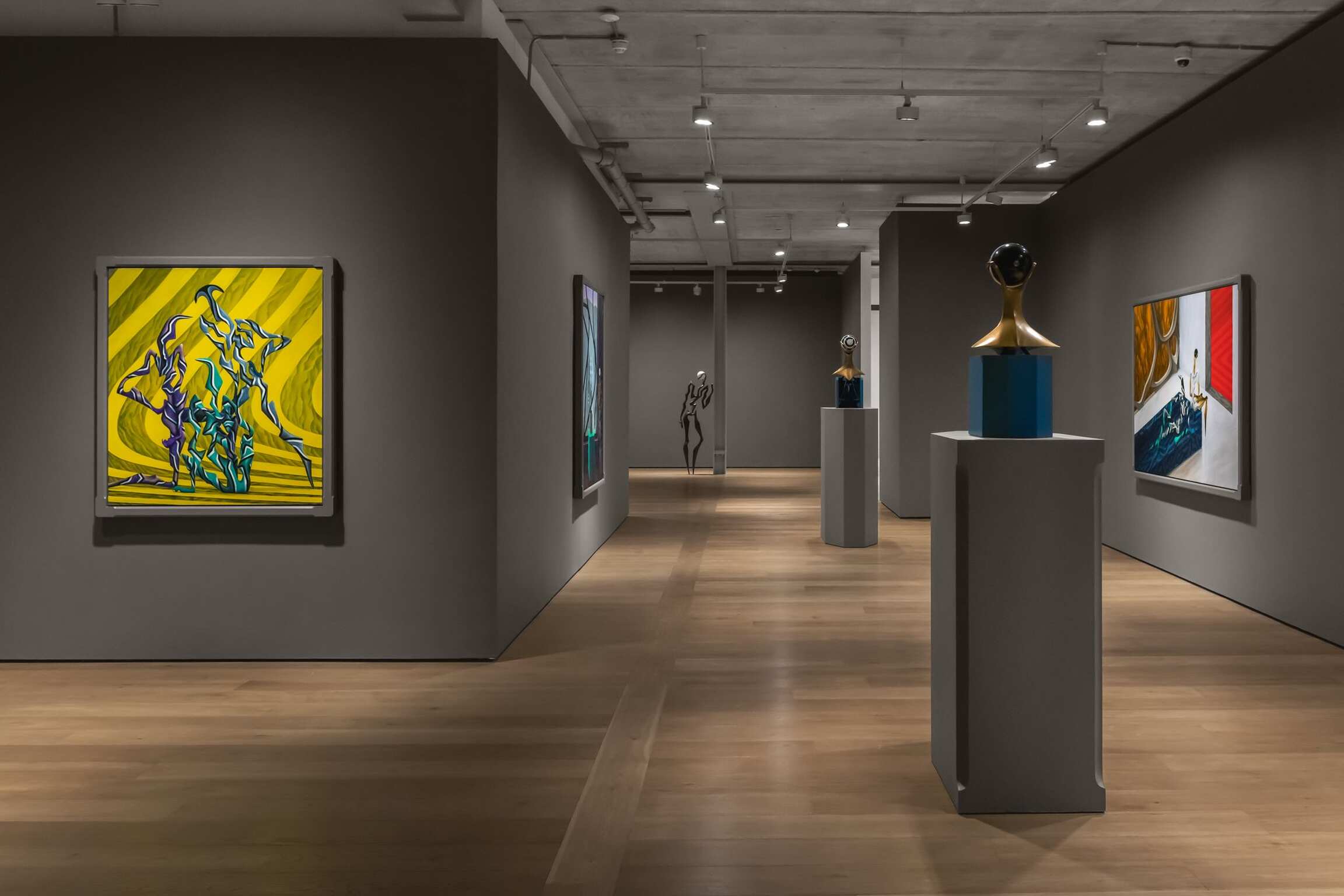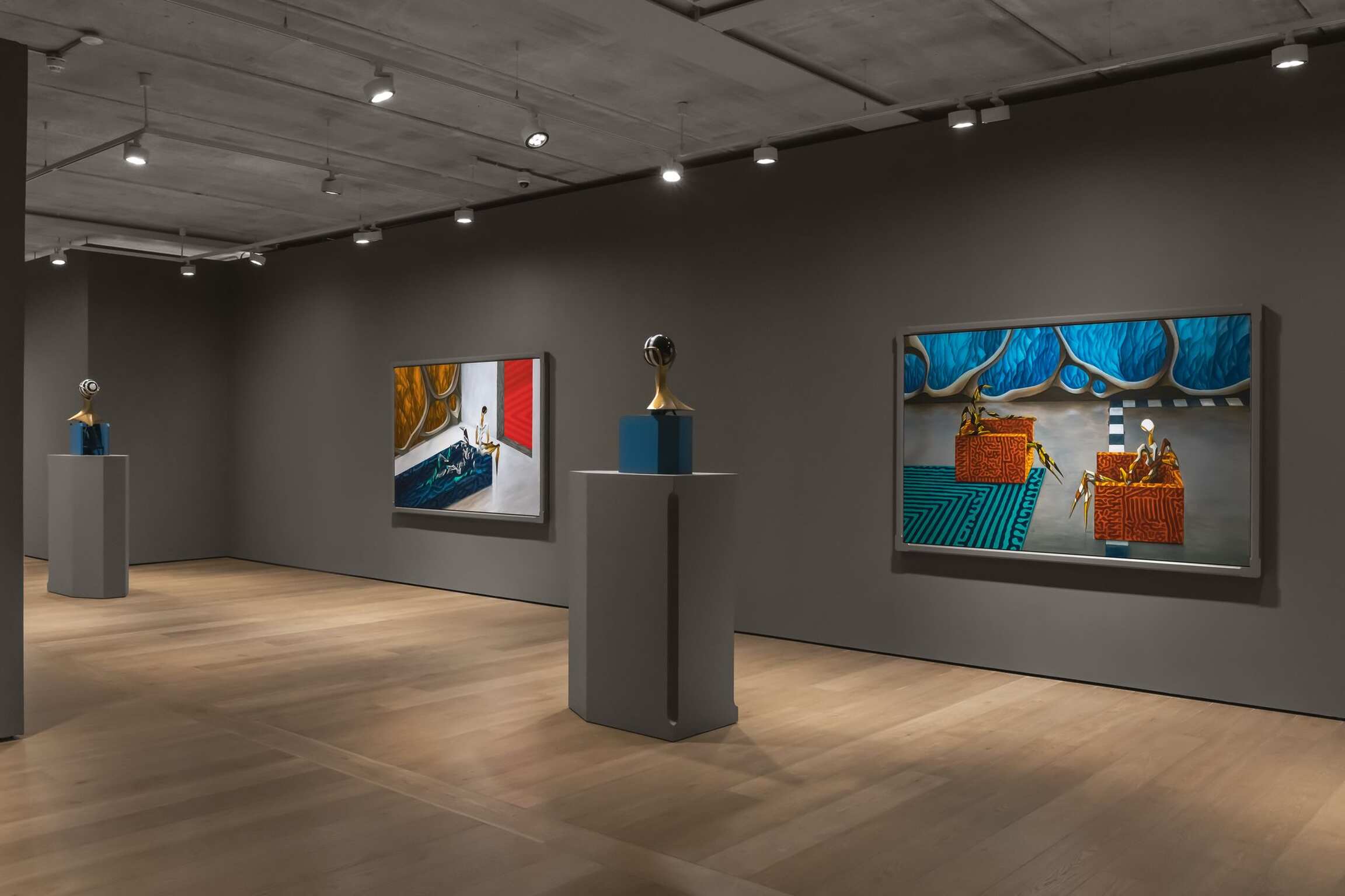 Both enticing and mysterious, the group of 10 works—8 paintings and 2 sculptures—further distill the artist’s fascination for visual synthesis. The free-flowing interplay of references deriving from established movements in the history of art with various expressions of popular culture comes to life in this show. Given the growing trend in the contemporary art world of artists creating exclusively through the lens of contentious categories, such as race, class, and gender, this is a divergent and significant enterprise. His figures’ mutability and permeability avoid being confined within a single space, thus sidestepping swift, commonplace interpretations.