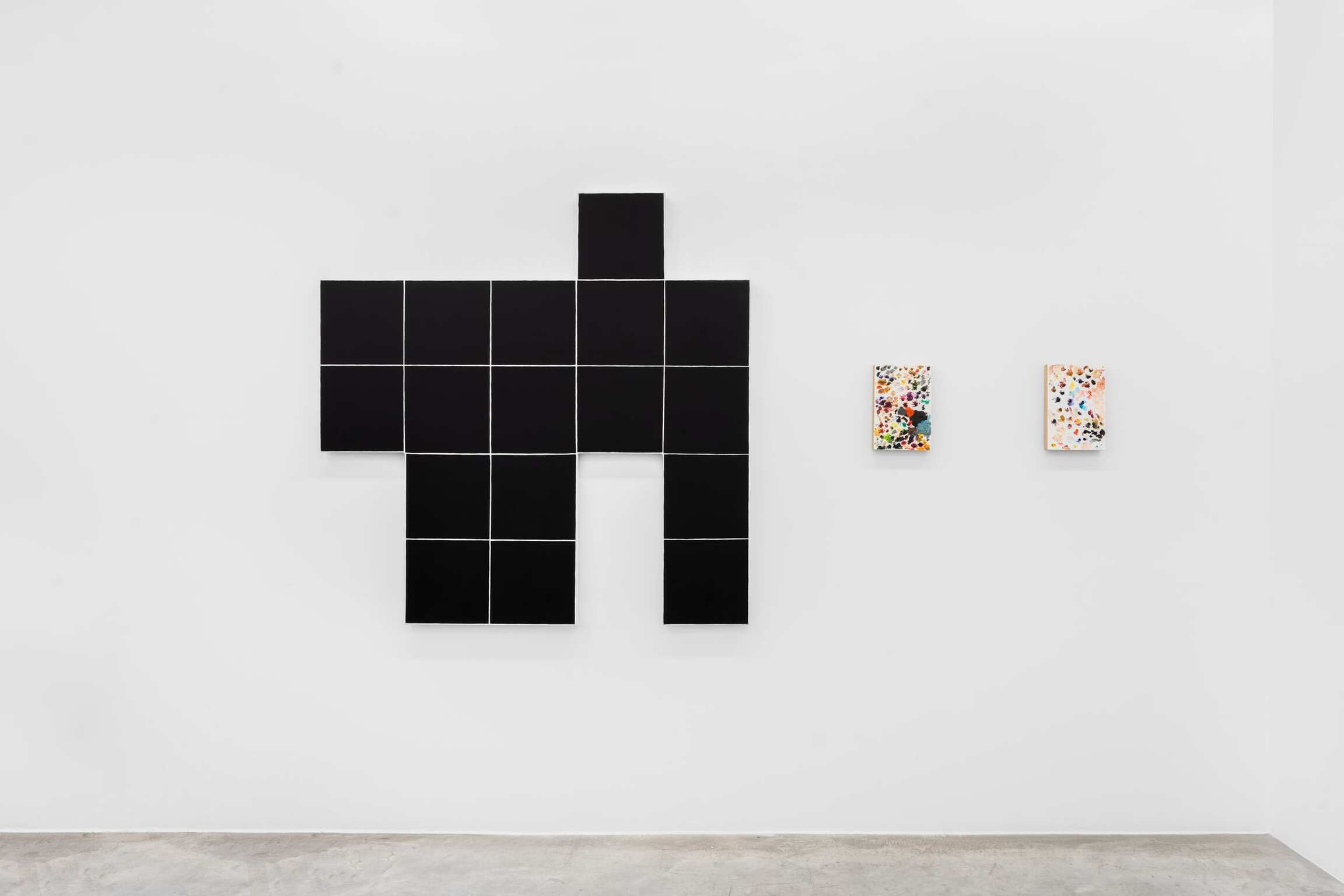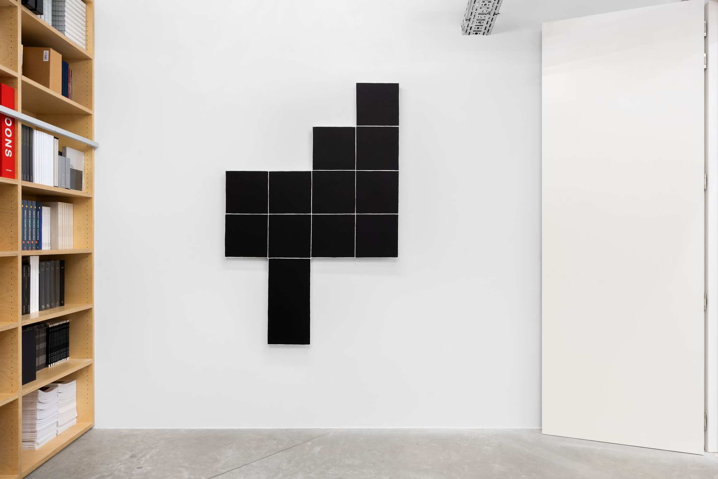 The paintings of Guillaume Gelot (1983, lives and works in Paris) are bicolored and produced on shaped canvases, with a simple and structured visual language. Evoking radical, minimalist abstraction, these black grids, which seem to be the product of a computer program or a mechanical application, are nevertheless produced by hand, without tape, requiring concentration and a steady hand. The eye can quickly take them in because of their simple shapes, but their titles, while not descriptive, endow them with more life and allow them to take root in the heart.