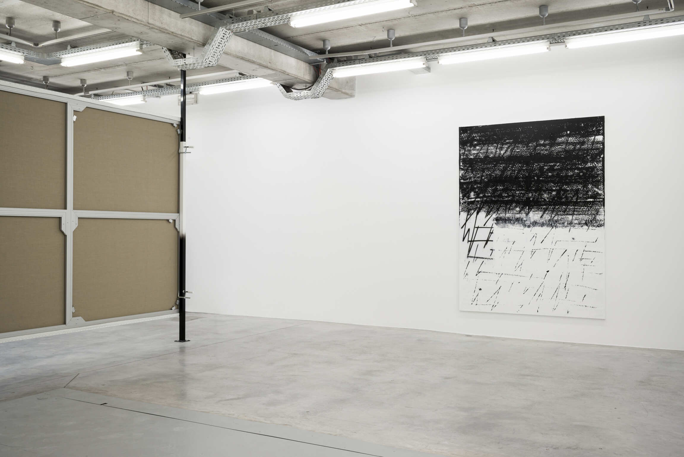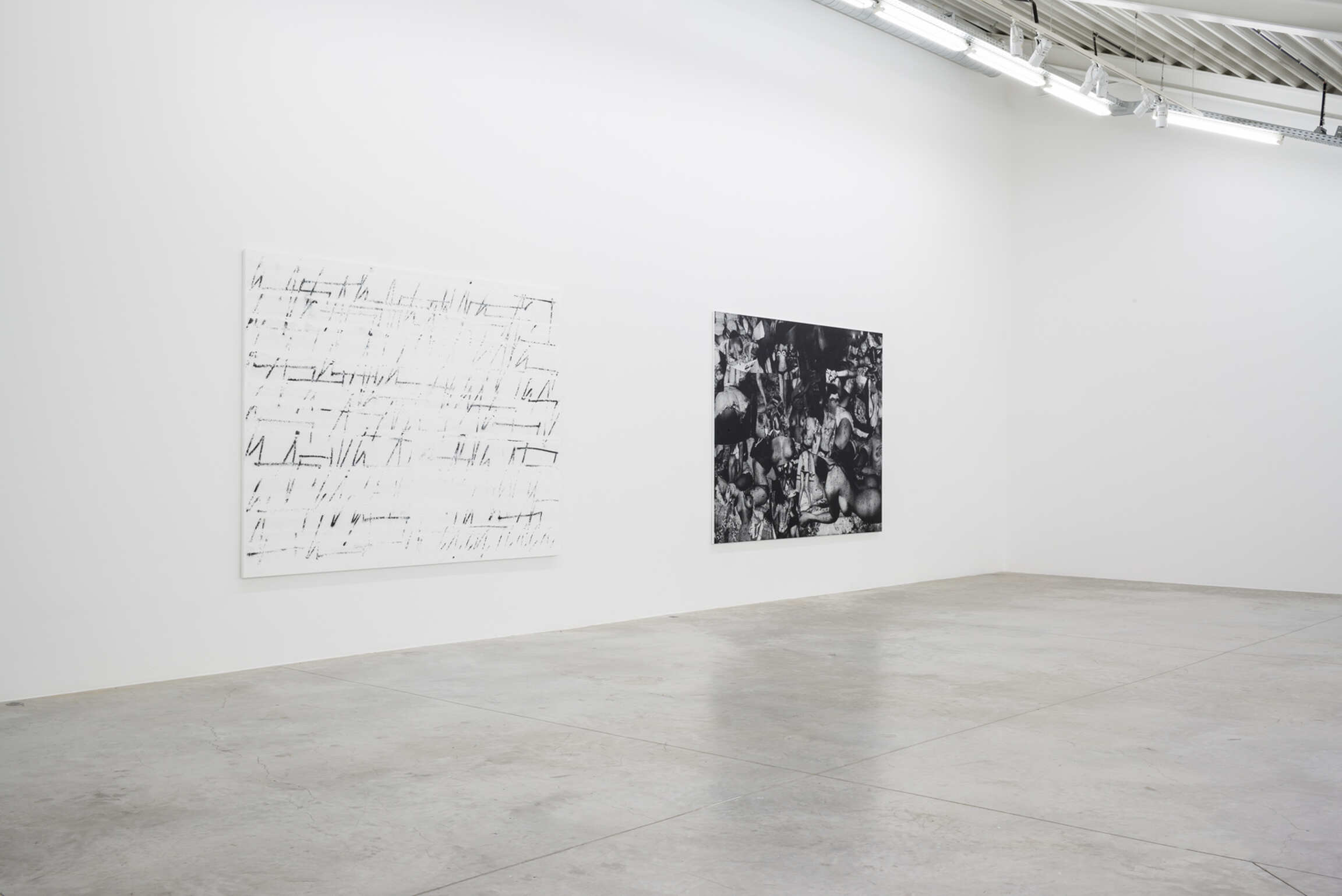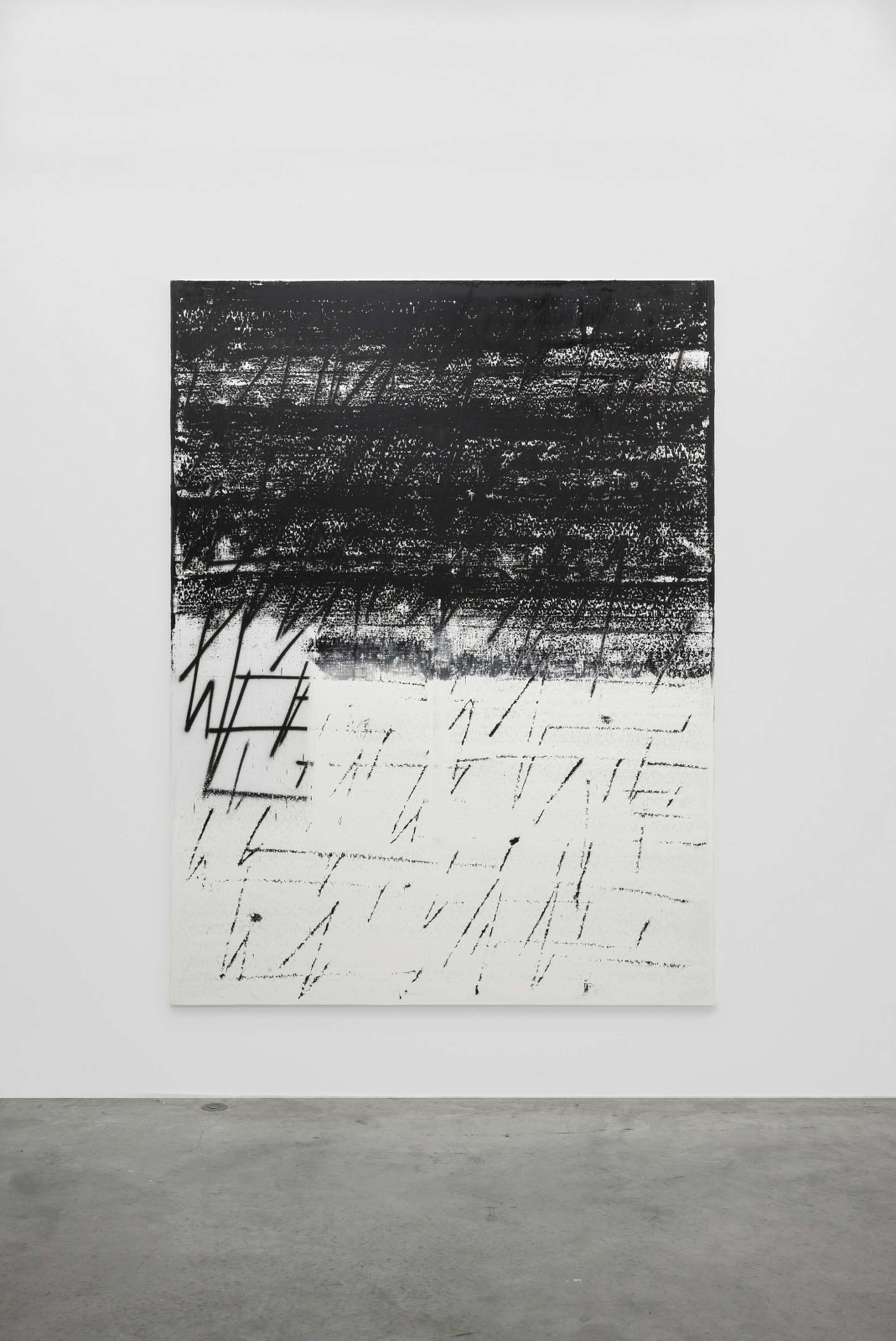 One painting, “Fire Your Guns”, obscures the characteristic composition of the ZigZag Paintings, joining together the ink blacks of the silkscreen works with the gestural abstractions of the rest of the series; its stenographic markings overset by a black foreground that effaces half of the painting. It could be a landscape, or a torn page. It evokes a terrain at the margins of poetry, painting, and music.