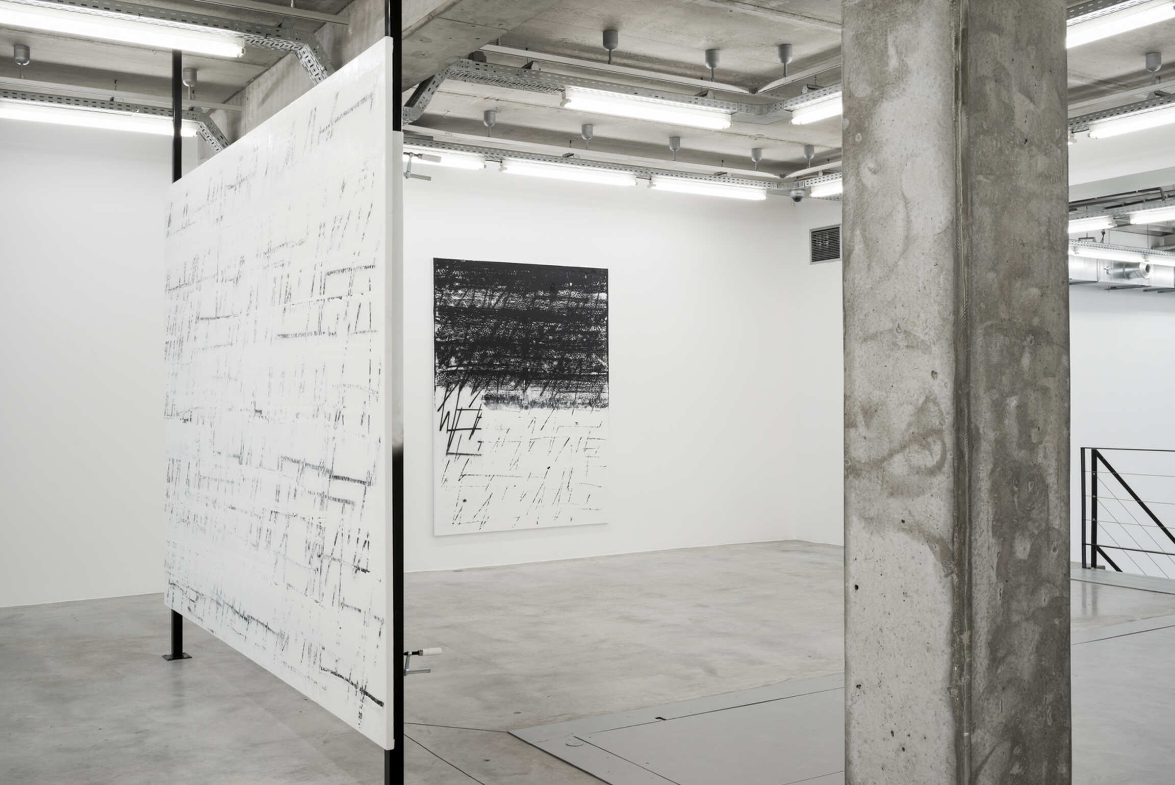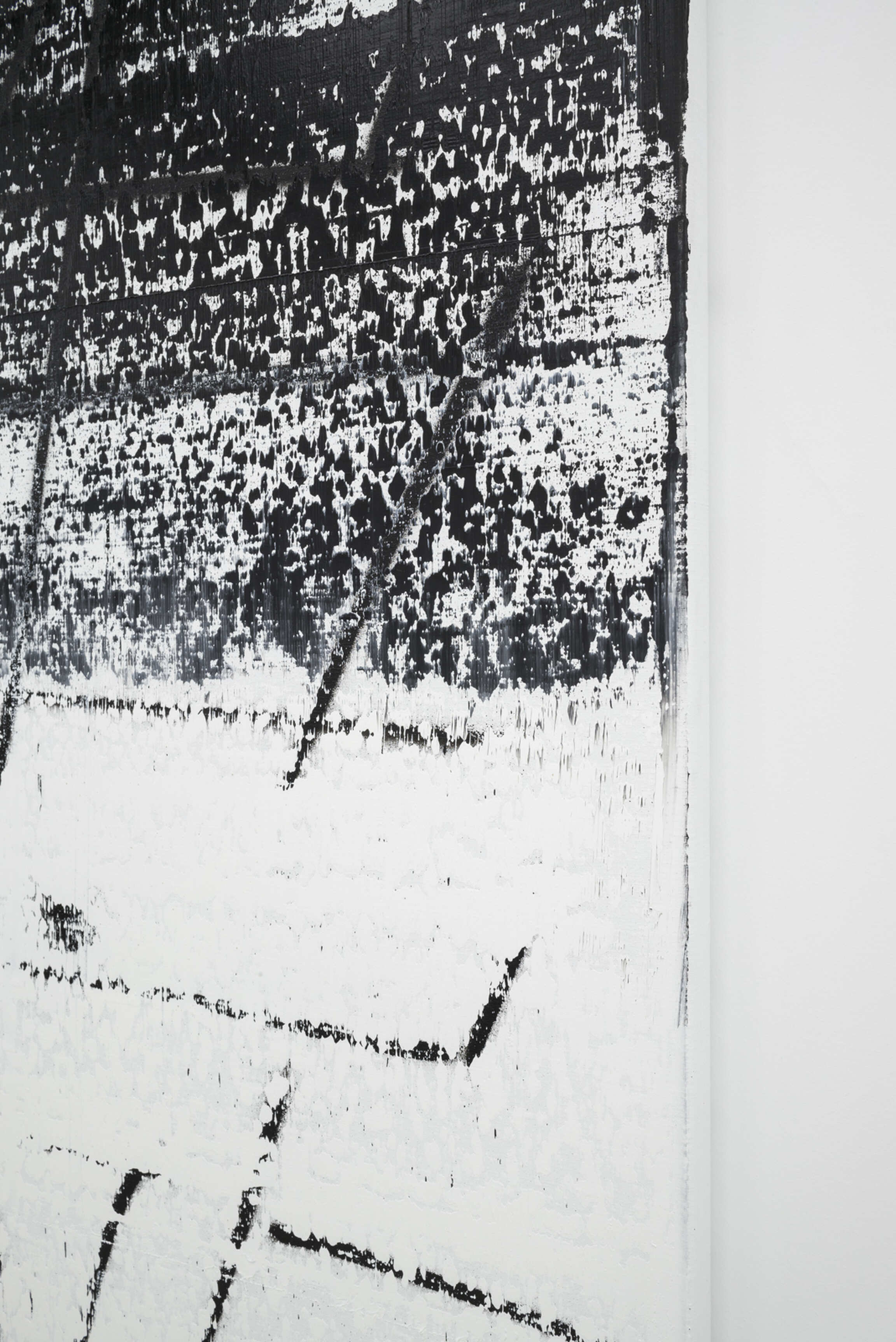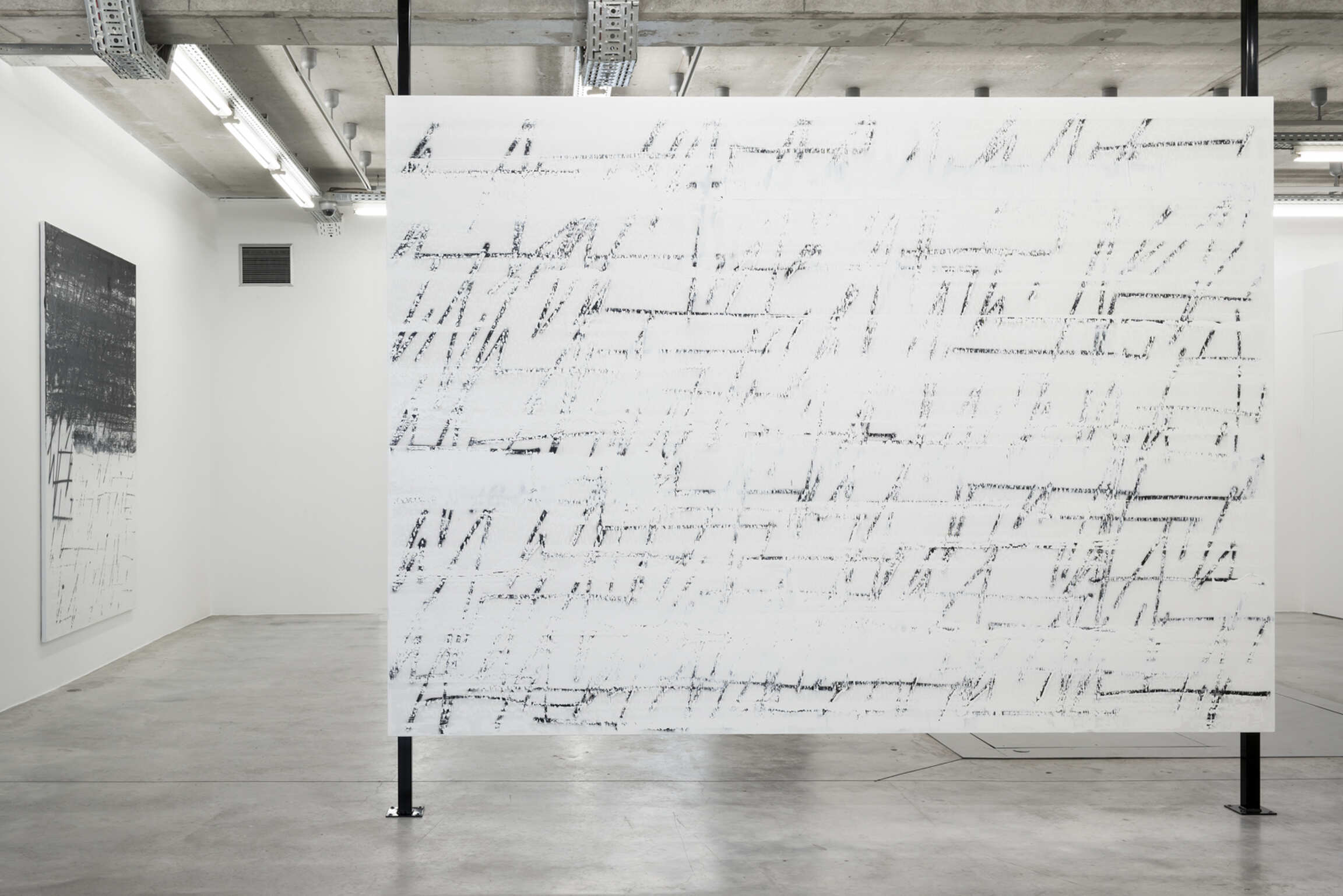 One painting, “Fire Your Guns”, obscures the characteristic composition of the ZigZag Paintings, joining together the ink blacks of the silkscreen works with the gestural abstractions of the rest of the series; its stenographic markings overset by a black foreground that effaces half of the painting. It could be a landscape, or a torn page. It evokes a terrain at the margins of poetry, painting, and music.