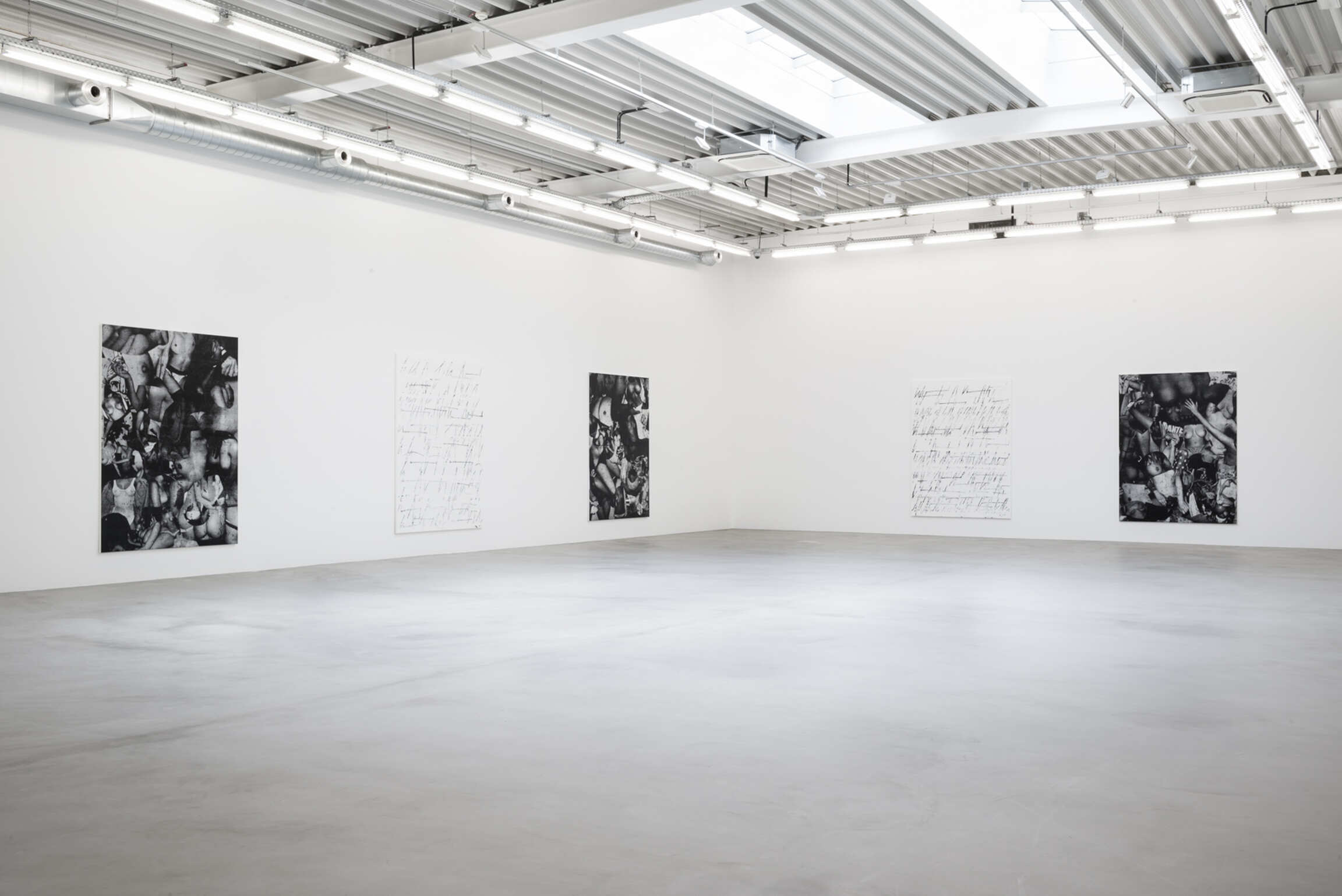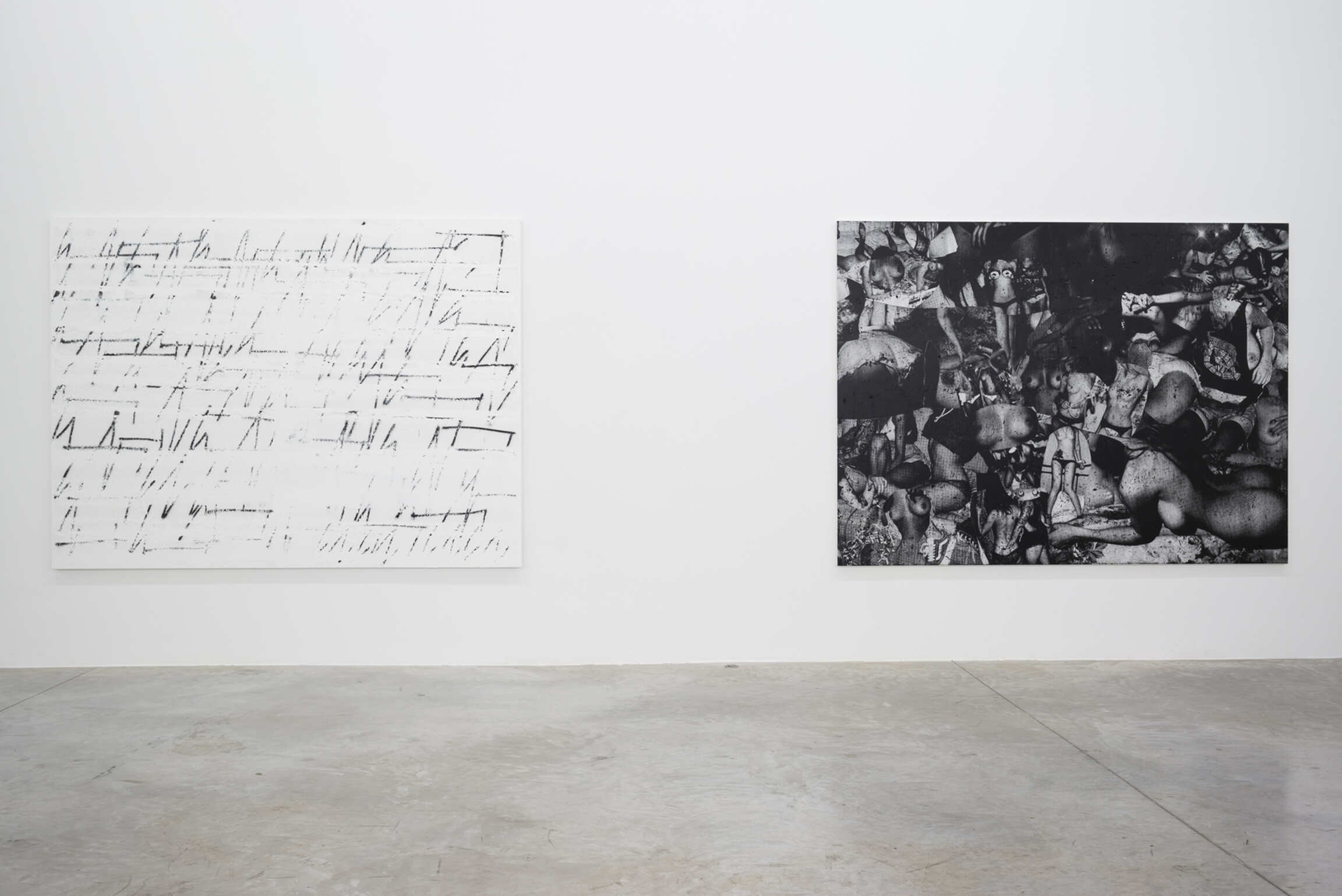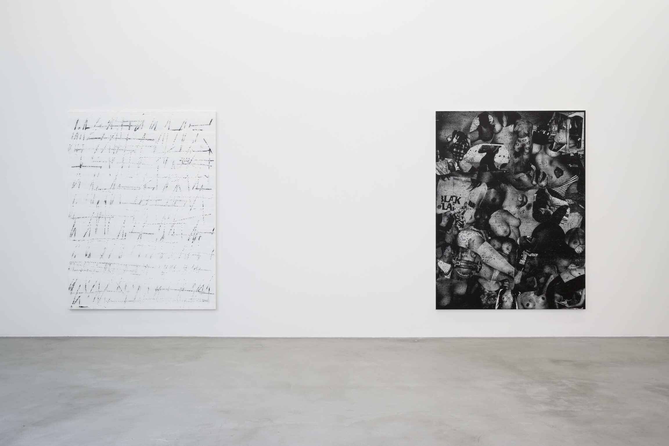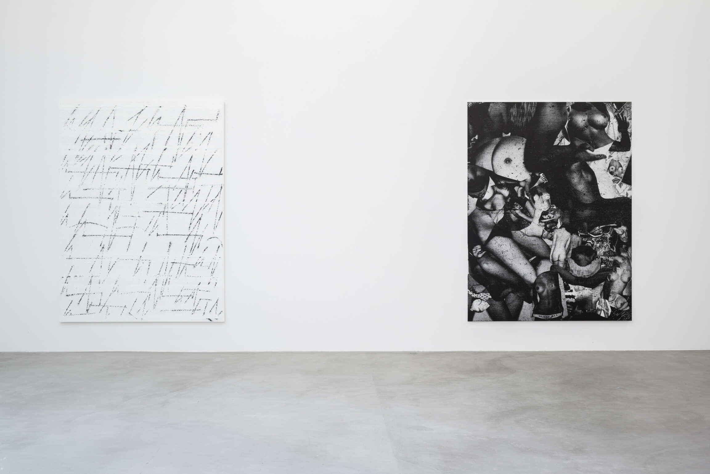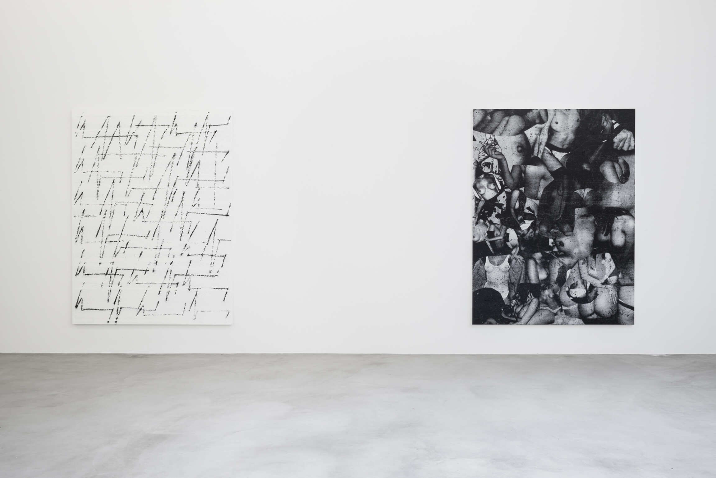 Chris Succo’s Language Of Elbow, his first solo exhibition at Almine Rech, presents new iterations of two series of works—the aforementioned ZigZag Paintings and a series of untitled silkscreen paintings. Succo’s silkscreen paintings, made from images cut from magazines, pasted together, photographed, silkscreened, and then overworked with smudges of oil paint, suggest faded rock posters, or a cascade of images of a truant youth. Flirting with the history of the nude in painting, they are collages in impoverished grayscale, deadpan renderings of adolescent excesses glorified by rock ‘n’ roll.