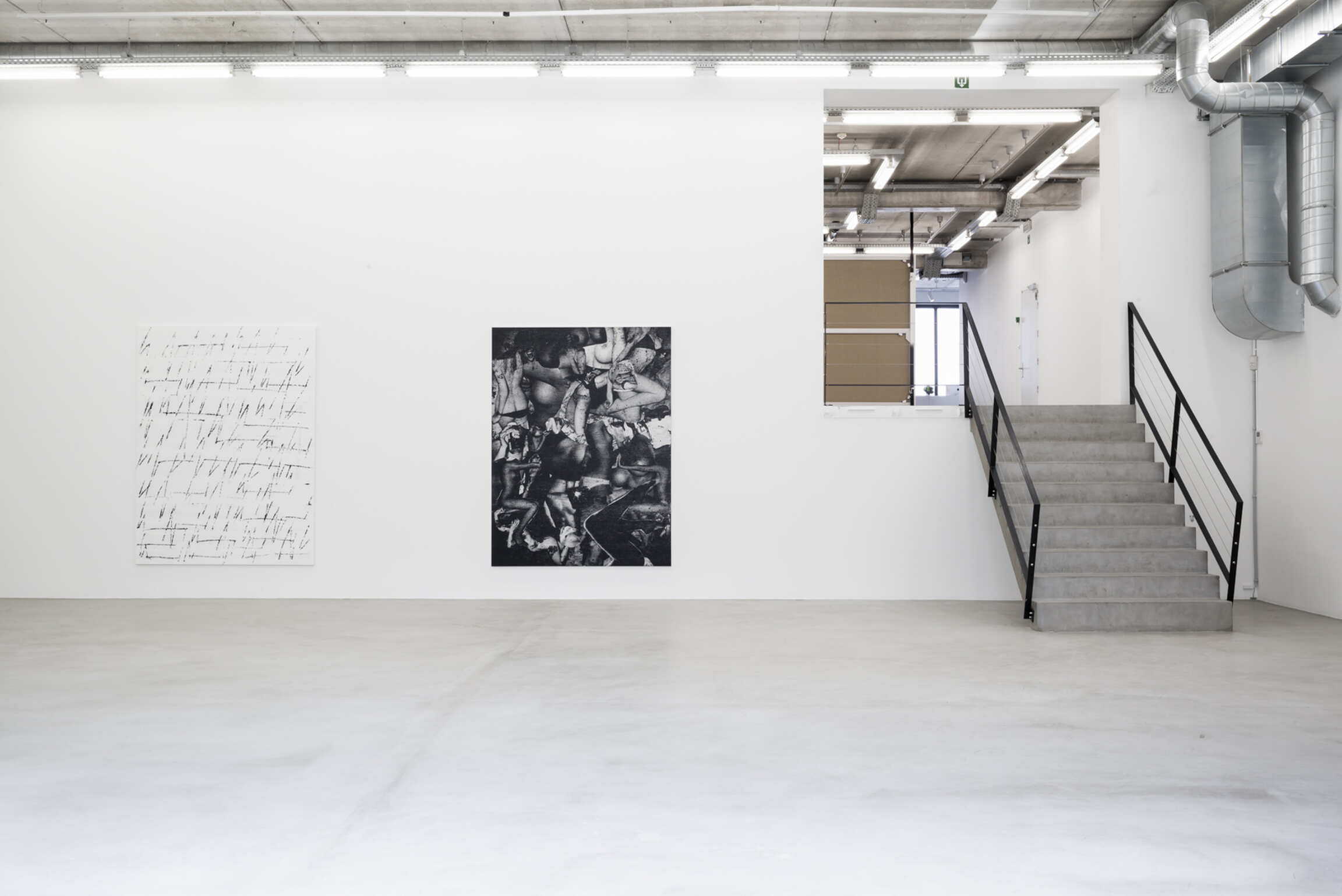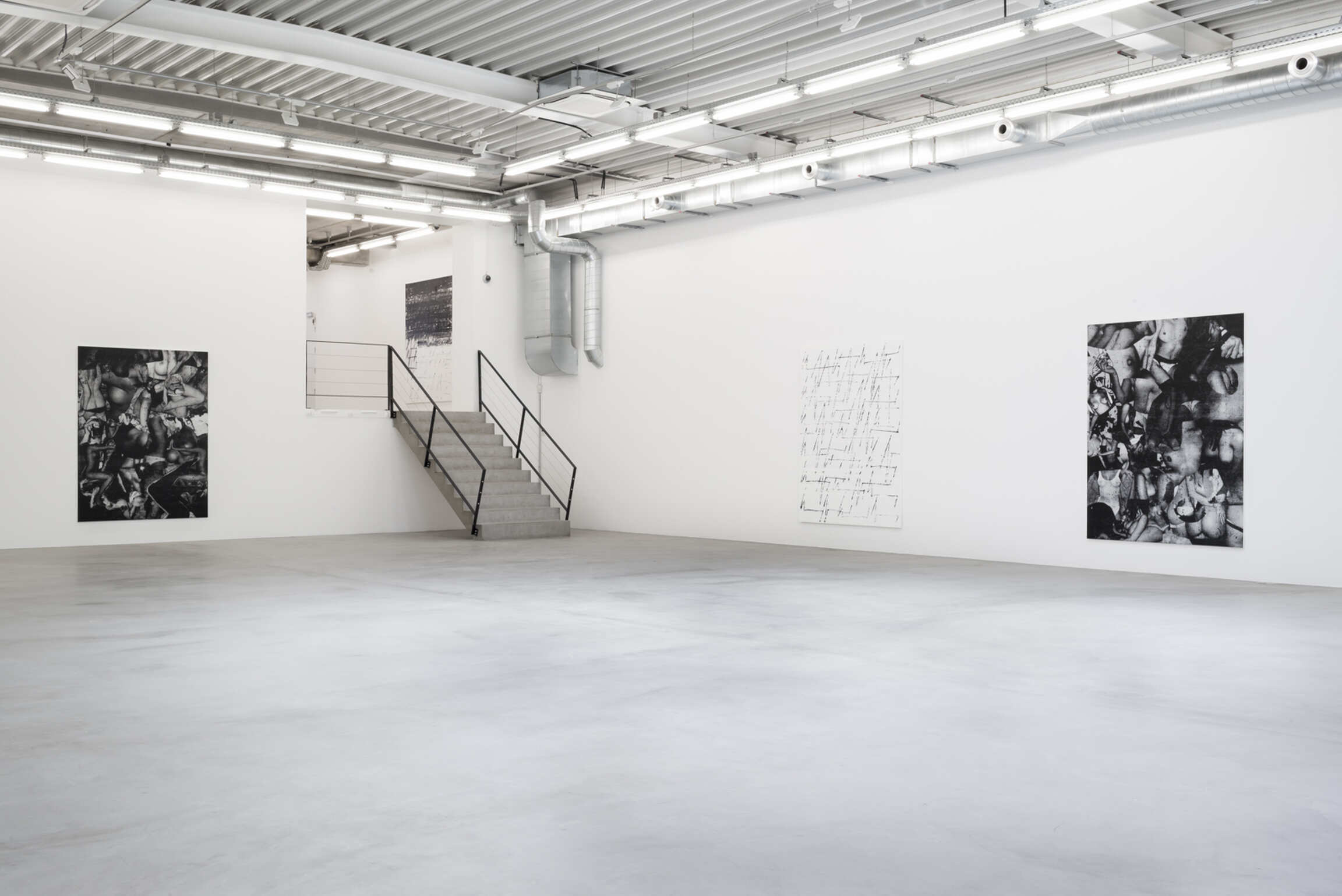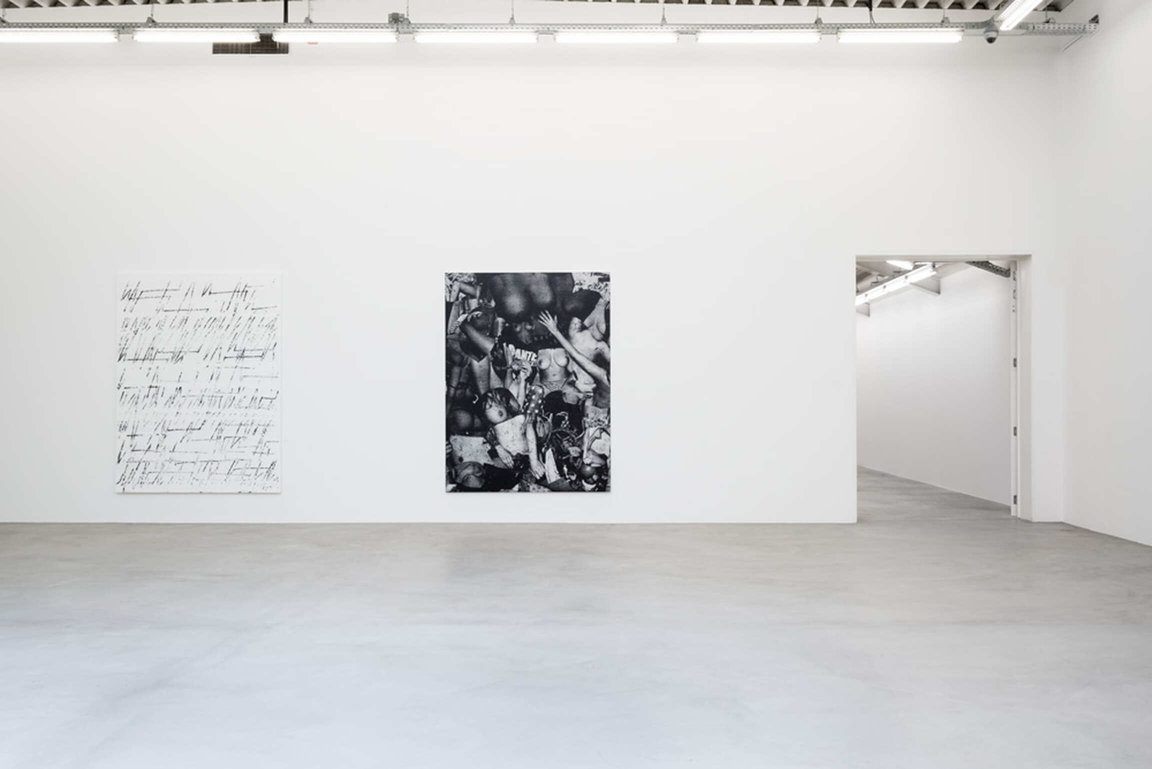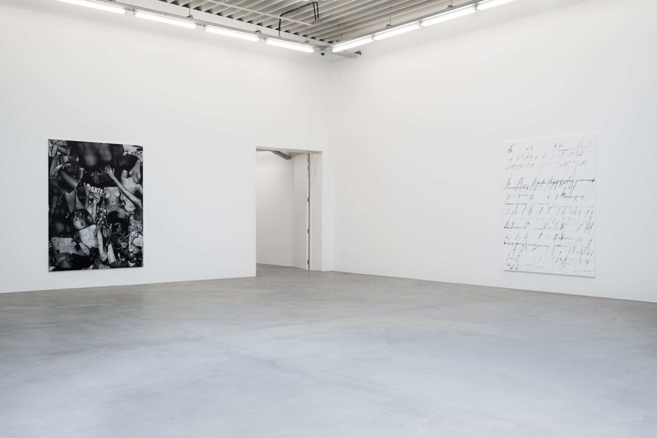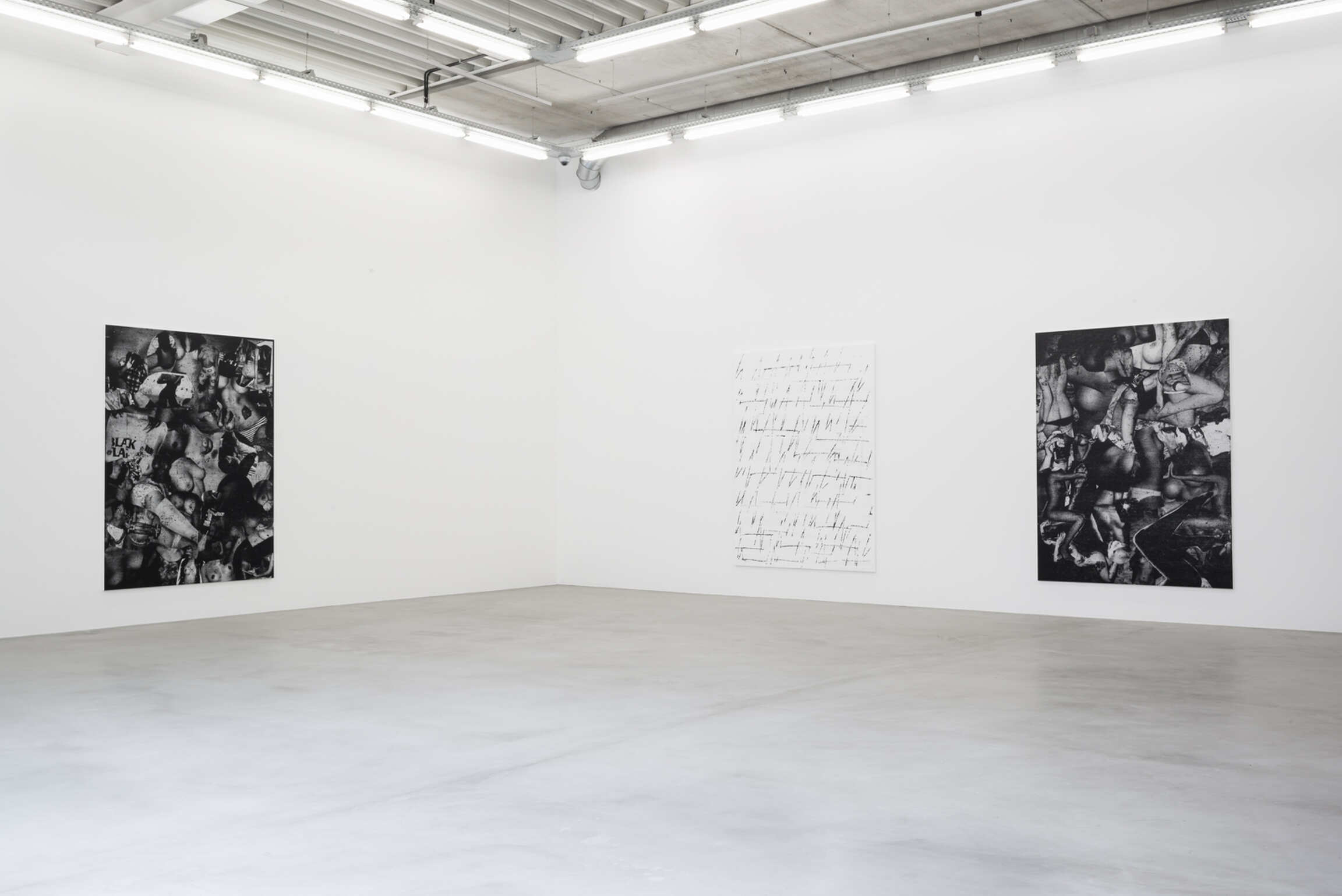 Chris Succo’s Language Of Elbow, his first solo exhibition at Almine Rech, presents new iterations of two series of works—the aforementioned ZigZag Paintings and a series of untitled silkscreen paintings. Succo’s silkscreen paintings, made from images cut from magazines, pasted together, photographed, silkscreened, and then overworked with smudges of oil paint, suggest faded rock posters, or a cascade of images of a truant youth. Flirting with the history of the nude in painting, they are collages in impoverished grayscale, deadpan renderings of adolescent excesses glorified by rock ‘n’ roll.
