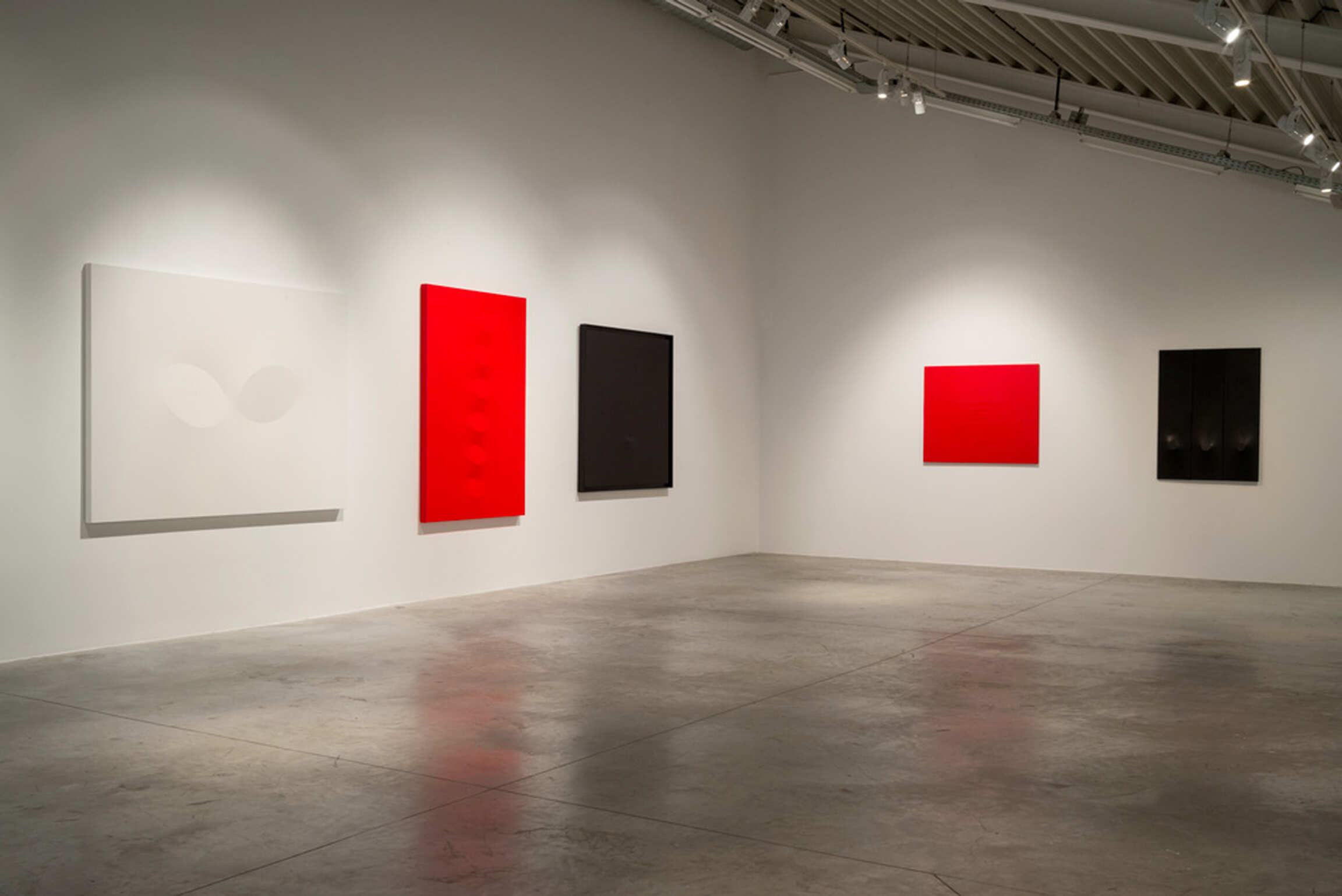 Through the variations of pieces of oval cardboard cut up and then glued onto the canvas, Simeti makes us perceive the non-homogeneity of the monochrome painting. From these first three paintings: “12 ovali bianchi”, “44 ovali bianchi” and “108 ovali neri”, created in 1962 and 1963, we obtain surface effects and reliefs as well as shadow and light effects that, though they endow the creations with an esthetic – and even decorative – side, demonstrate great precision and fine radicality. Simetti also succeeds to dematerialize the presence of the object by playing on the principle of repetition and light modulation.