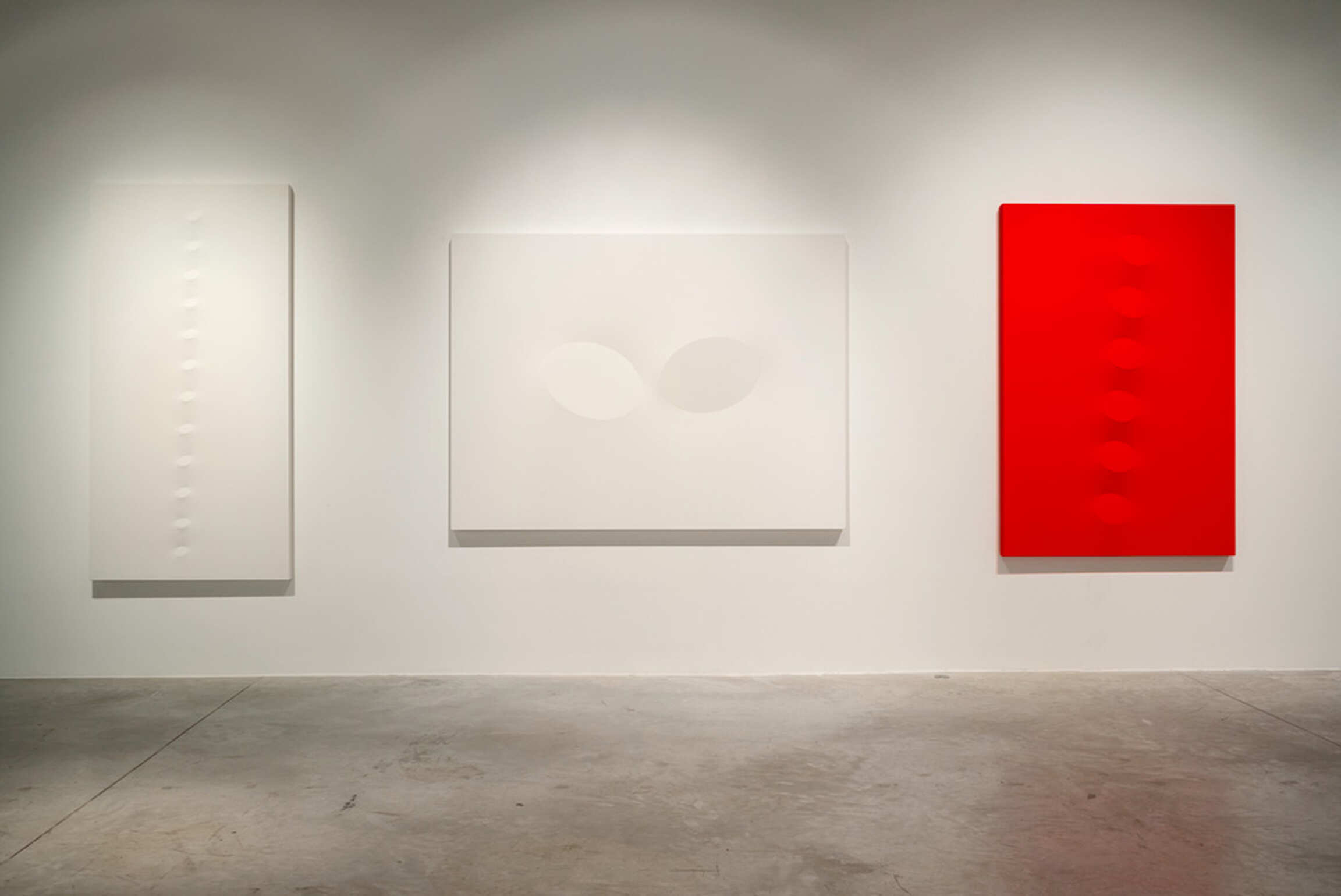 Following his own plastic rules with "Rilievi bianchi" on 1967, Simeti stands out by a new vocabulary: the hollow shape. The collage disappears from the surface of the canvas, “dematerialized” only by the light effects. Unlike his initial works where the added oval object was the main element of the canvas, the "extroflexion" oval becomes the core around which the pictorial element of the artwork is organized.
