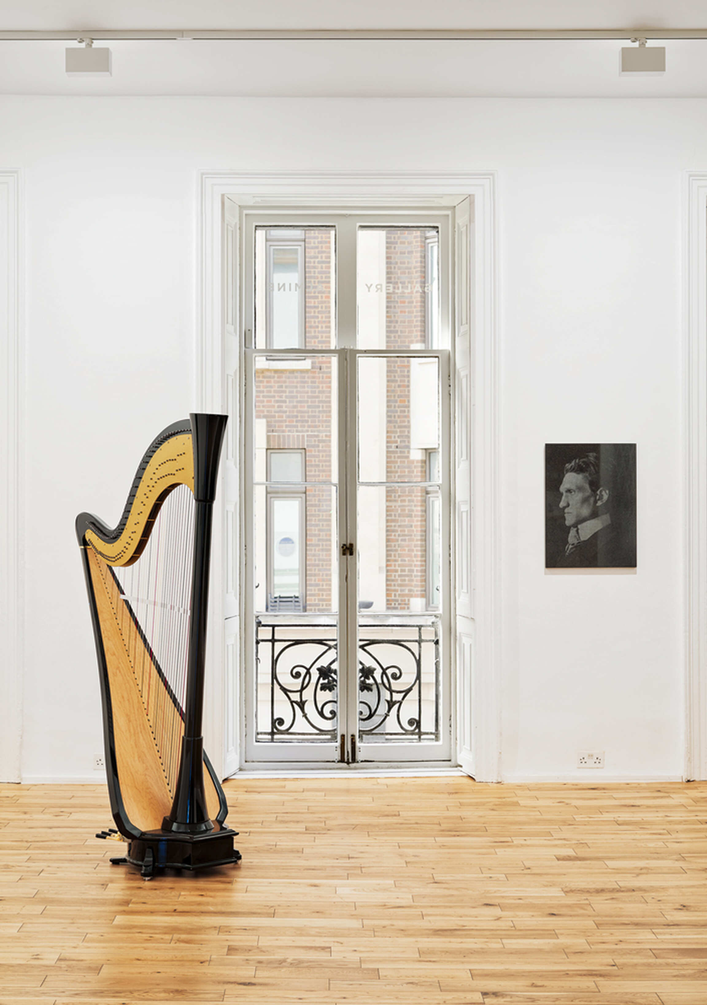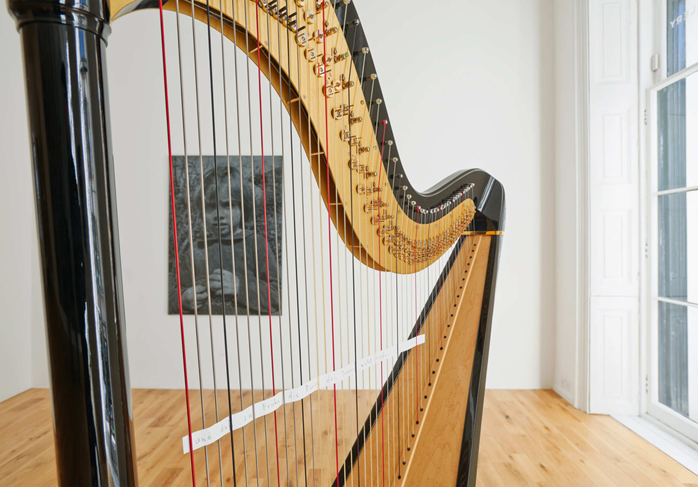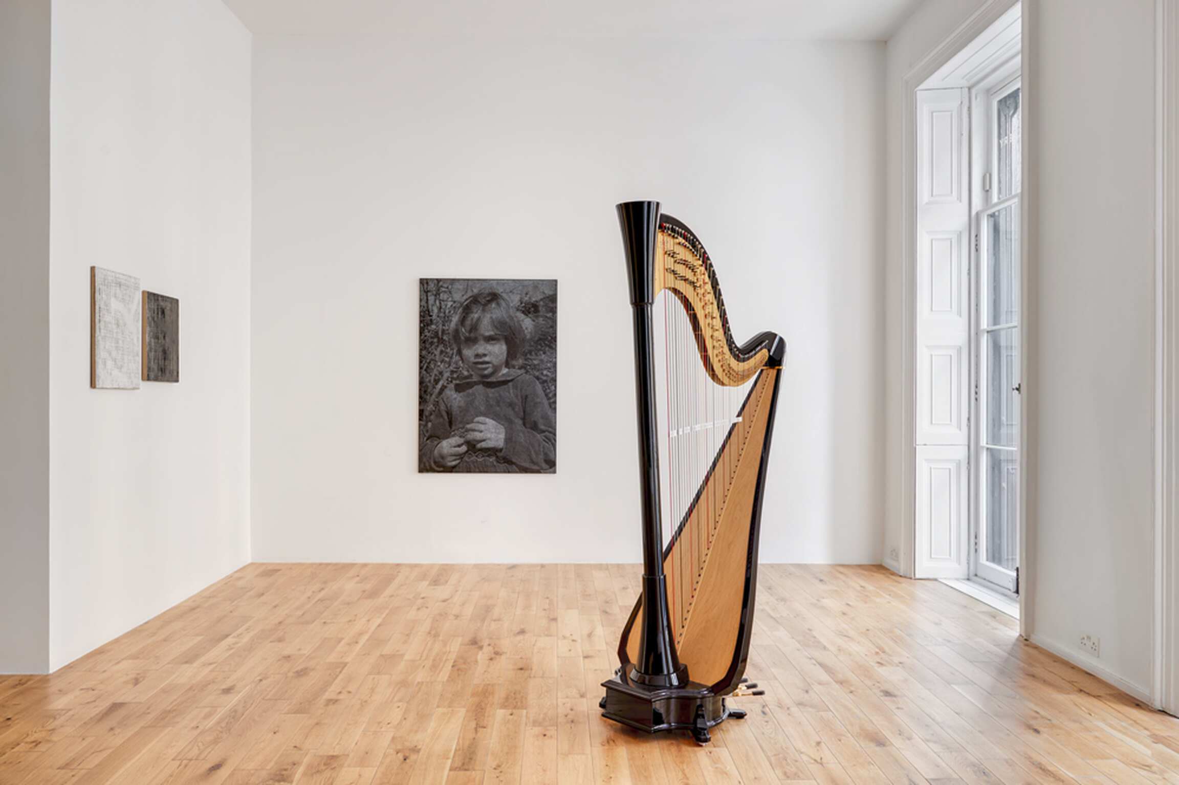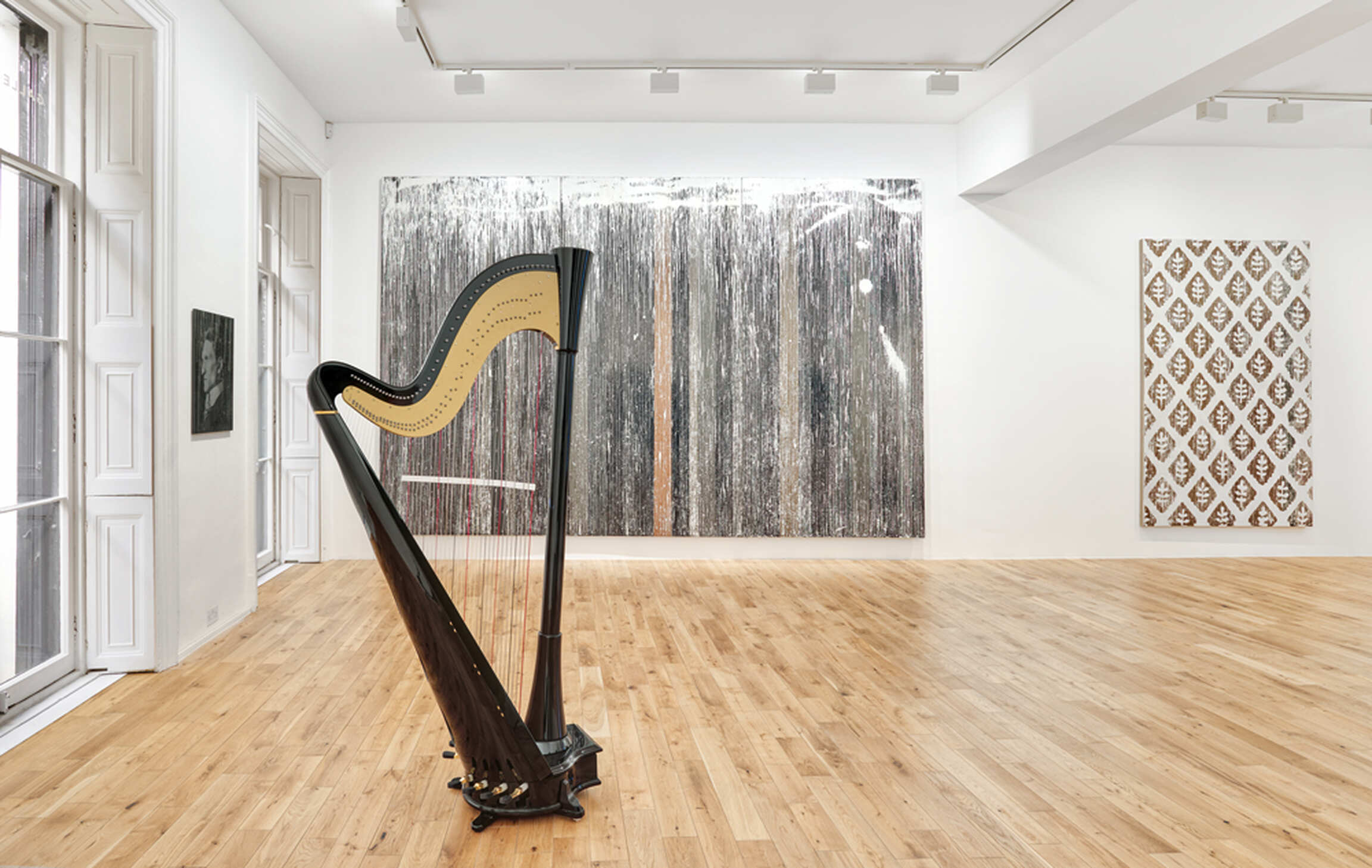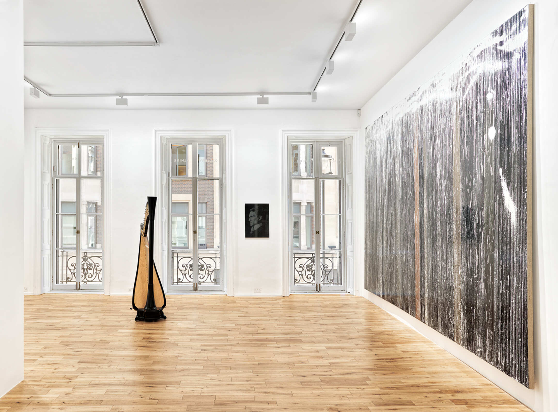 In weißen Sträußen ließ den Duft der Sterne schneien, which lends the exhibition its title, is a small photograph depicting an out-of-focus reflection of an opulent flower bouquet in a narrow vase, reflected in a canvas covered with black VHS tape ribbon. The title comes from the German translation of Apparition, an 1862 poem by the symbolist poet Stéphane Mallarmé, that offers a yearning description of an evening encounter and ends with the words "Neiger de blancs bouquets d'étoiles parfumées" ["Snow-white clusters of perfumed stars"]. Music, which plays a central role in Hildebrandt’s practice, is as disembodied as the fragrance of the stars, caught in white bouquets. Music is especially connected to his paintings. Here, the artist records a chosen piece of music on cassette tape ribbon which he then glues onto canvas, using the data storage medium as an artistic medium, thereby reducing it to its very surface. Although formally reduced and rigorous, Hildebrandt’s works are nonetheless charged and personal in terms of content. Paintings, photographs, sculptures and installations refer not just to selections of music, but also to texts, films, and motifs from art history and popular culture that have influenced or inspired him. Only Der weiße Spiegel turns the viewer back on him/herself. Hildebrandt left the tape empty and viewers see merely themselves in the strongly reflective surface, filling the empty space through their own imaginations. Elsewhere in his pieces, artwork titles may reveal a specific reference and offer the beholders of the abstract, seemingly hermetic works, a means of access to the work’s content.