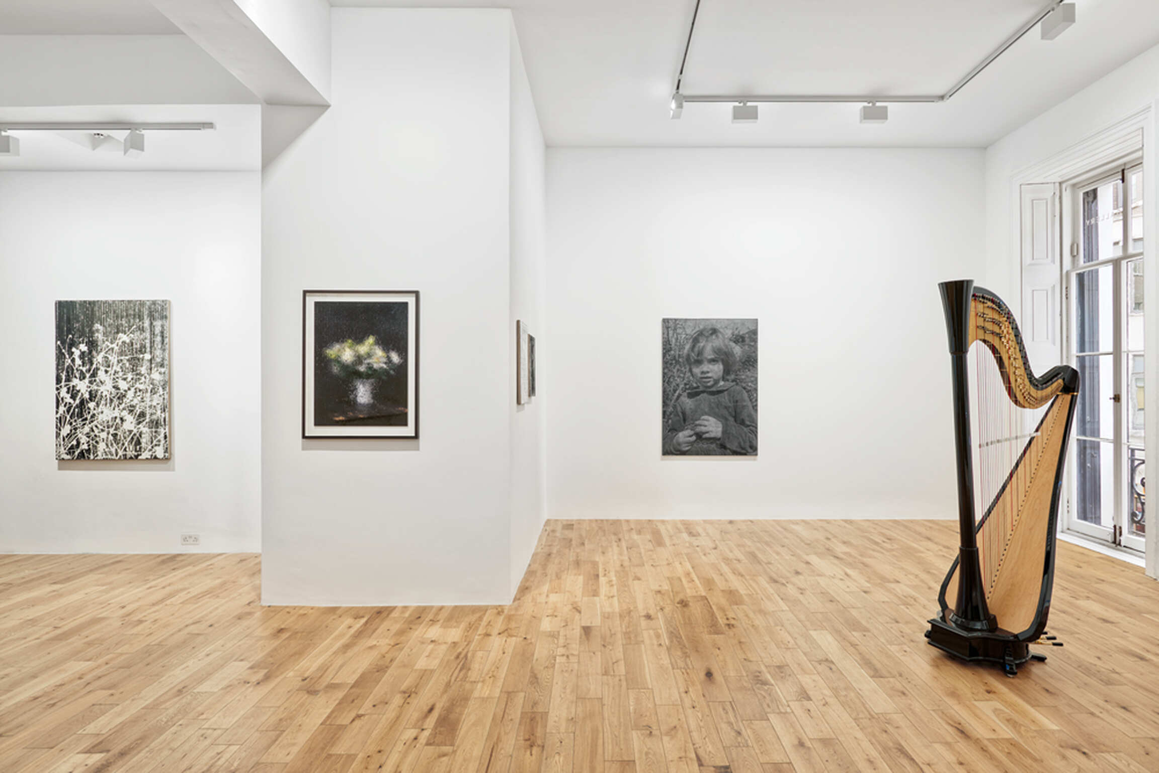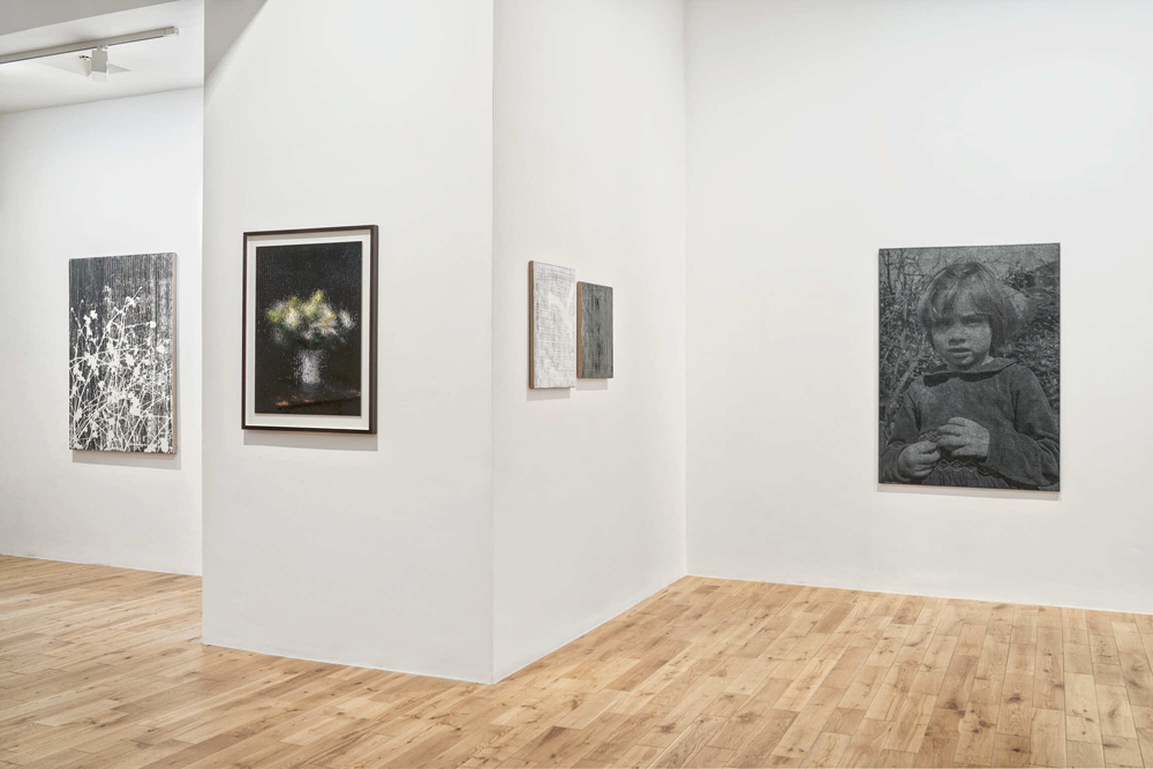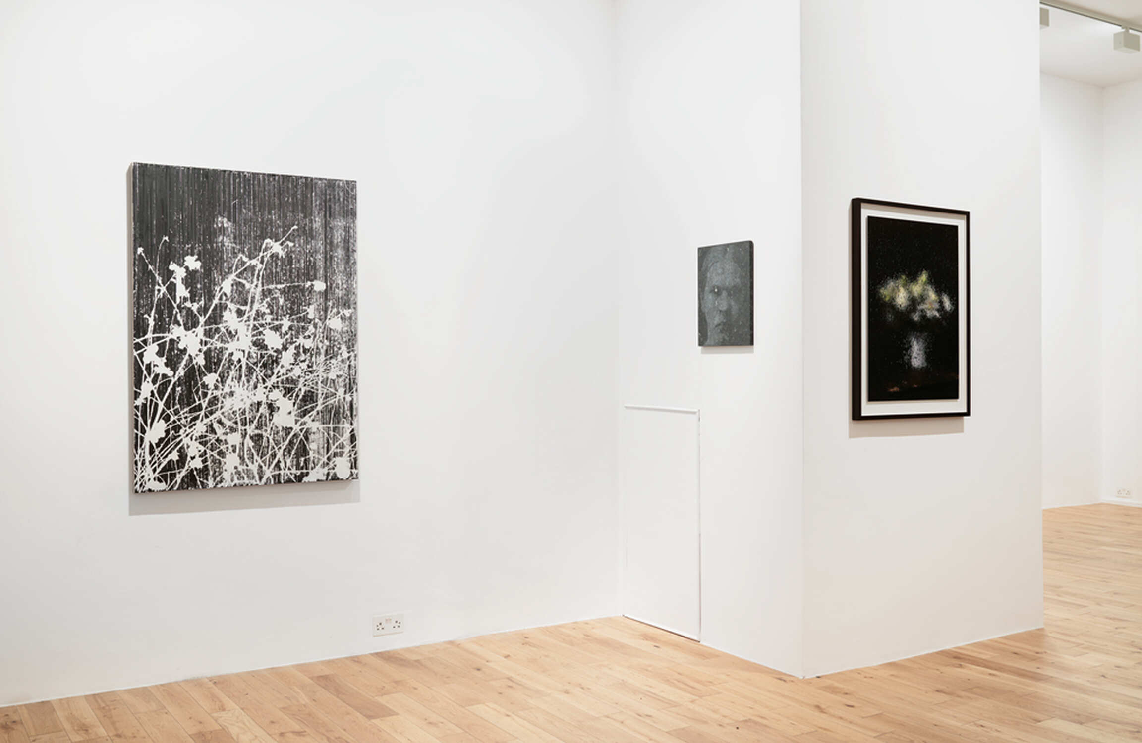 The artist’s ongoing series of engraved granite works stands in contrast to the reduced, abstract pieces and the dark still lifes. Hildebrandt often dedicates them to his icons. They are reminiscent of tomb slabs. The two smaller granite slabs in the exhibition are portraits of Stefan George and Georg Trakl, two pioneers of modern German poetry. The Trakl work on Labrador granite differs from the George due to the gleaming crystal flecks that are distinctive to this stone. Finally, at the rear of the gallery, there is the large granite work Greta in Urgroßmutters Garten, a portrait of the artist’s daughter as a young girl. A cousin photographed Greta at Easter in his grandmother’s garden; she holds an egg in her left hand. It is a classic half figure, as Greta turns towards the photographer and gazes pensively into the camera. In the background, coming from the bottom left corner, a dense, dark bush with a few light buds strives toward the centre of the image. A branch frames Greta’s silhouette. She adds something redeeming to this exhibition that is dominated by darkness and melancholia. Like Mallarmé’s apparition, she shines in an atmosphere of dusk – even if only slightly hidden.