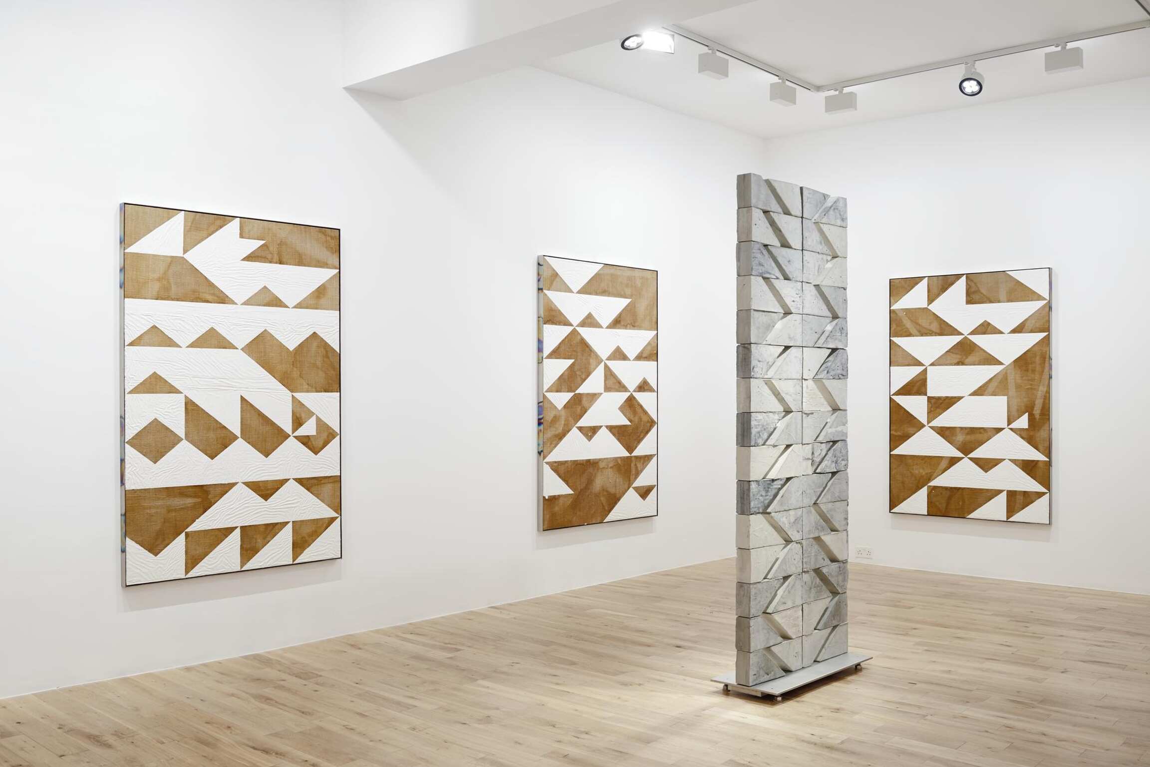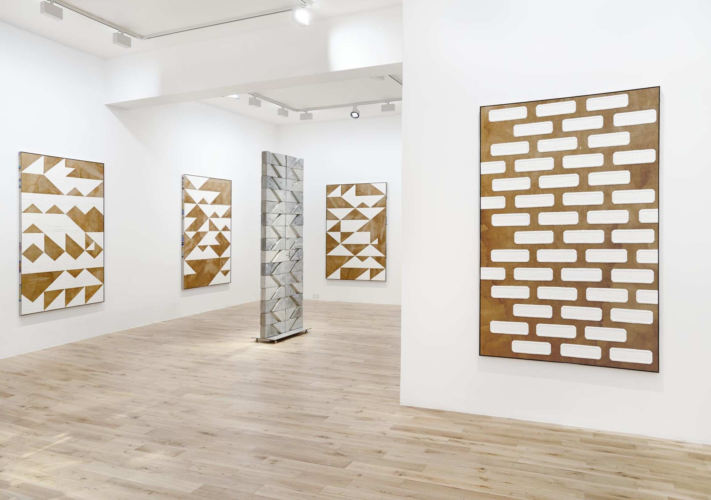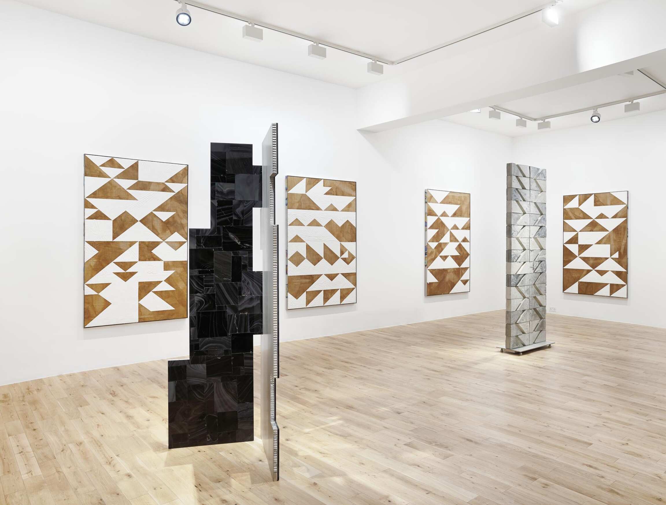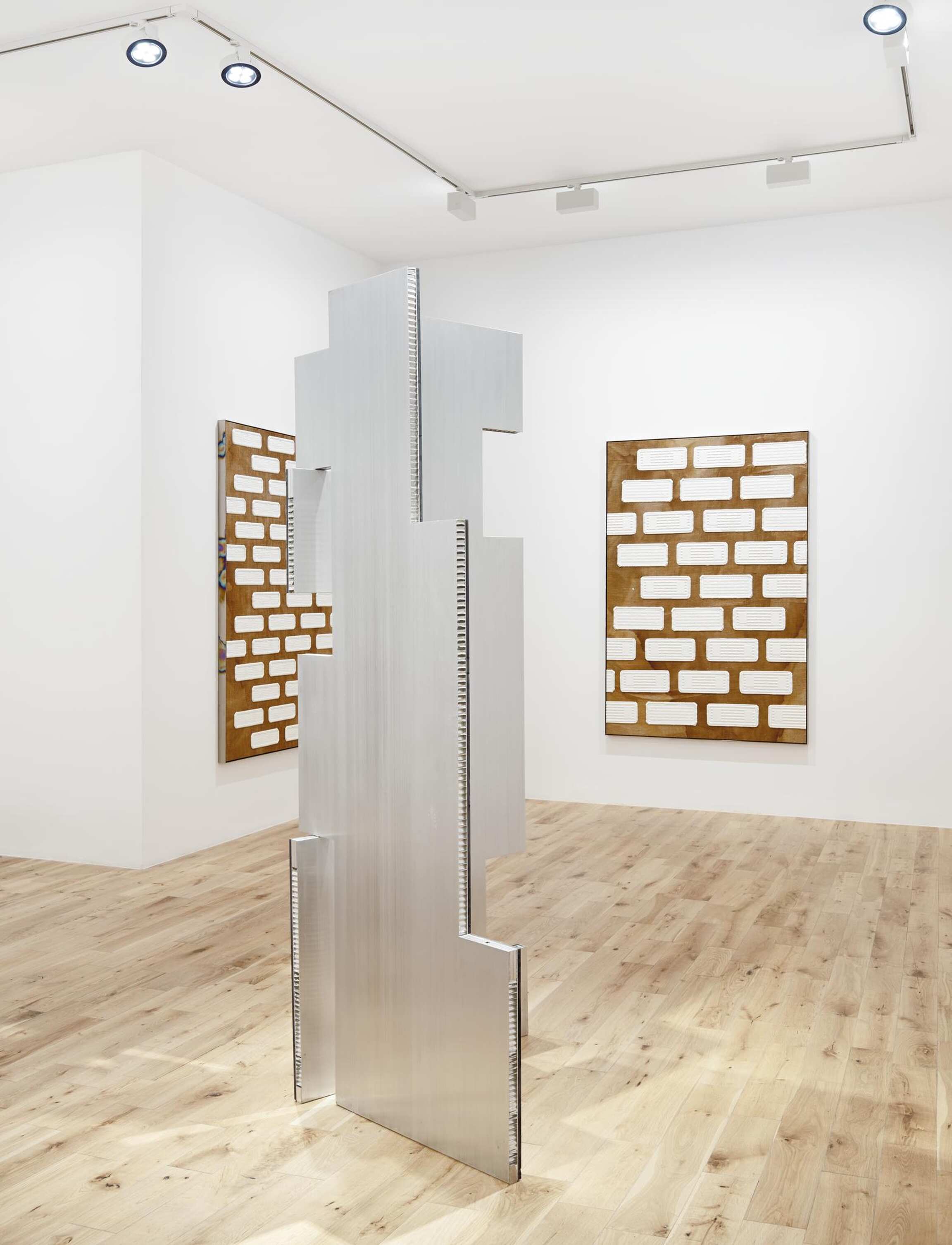 Hagen’s paintings integrate elements of sculpture, and the same is true vice-versa. The paintings are determined as such because they hang on a wall, and the sculptures, in turn, because they stand on the floor, but both are essentially planes loaded with a mixture of visual information and material form—a kind of bas-relief. Earlier freestanding works were pieced together like masonry walls from small brick-like units of found supermarket packaging cast in concrete. These newer ones are instead cut from 4 x 8 foot sheets of honeycomb aluminum into irregularly gridded shapes with interlocking edges along which they may be rotated this way and that. Somewhat like prehistoric monuments subjected to a cubist spin, they boast a greater dimensionality, but one derived from a flatter source, and imminently collapsible back into it. As a finishing touch, these constructs are clad in thin sheets of anodized titanium, which endow them with the same shimmering rainbow effect as the aforementioned frames and thereby reinforce their painterly aspect. In this way, materials, tools and techniques are passed between a range of formats—painting and sculpture, but also product design and architecture—establishing a legible continuity between one work and the next, as well as between art and the world outside it.
