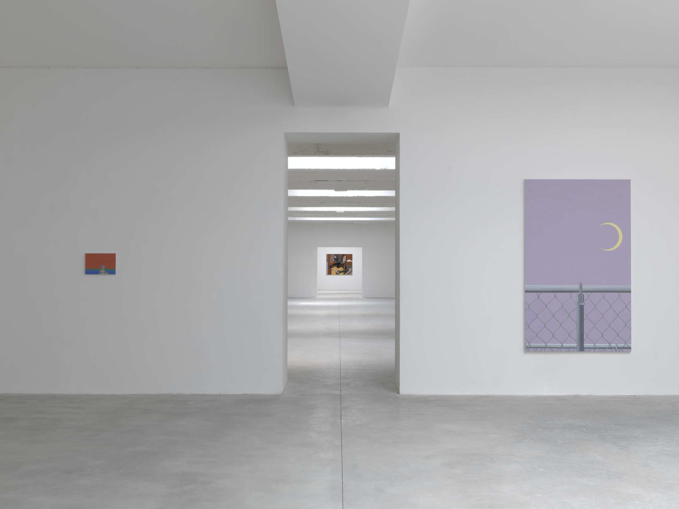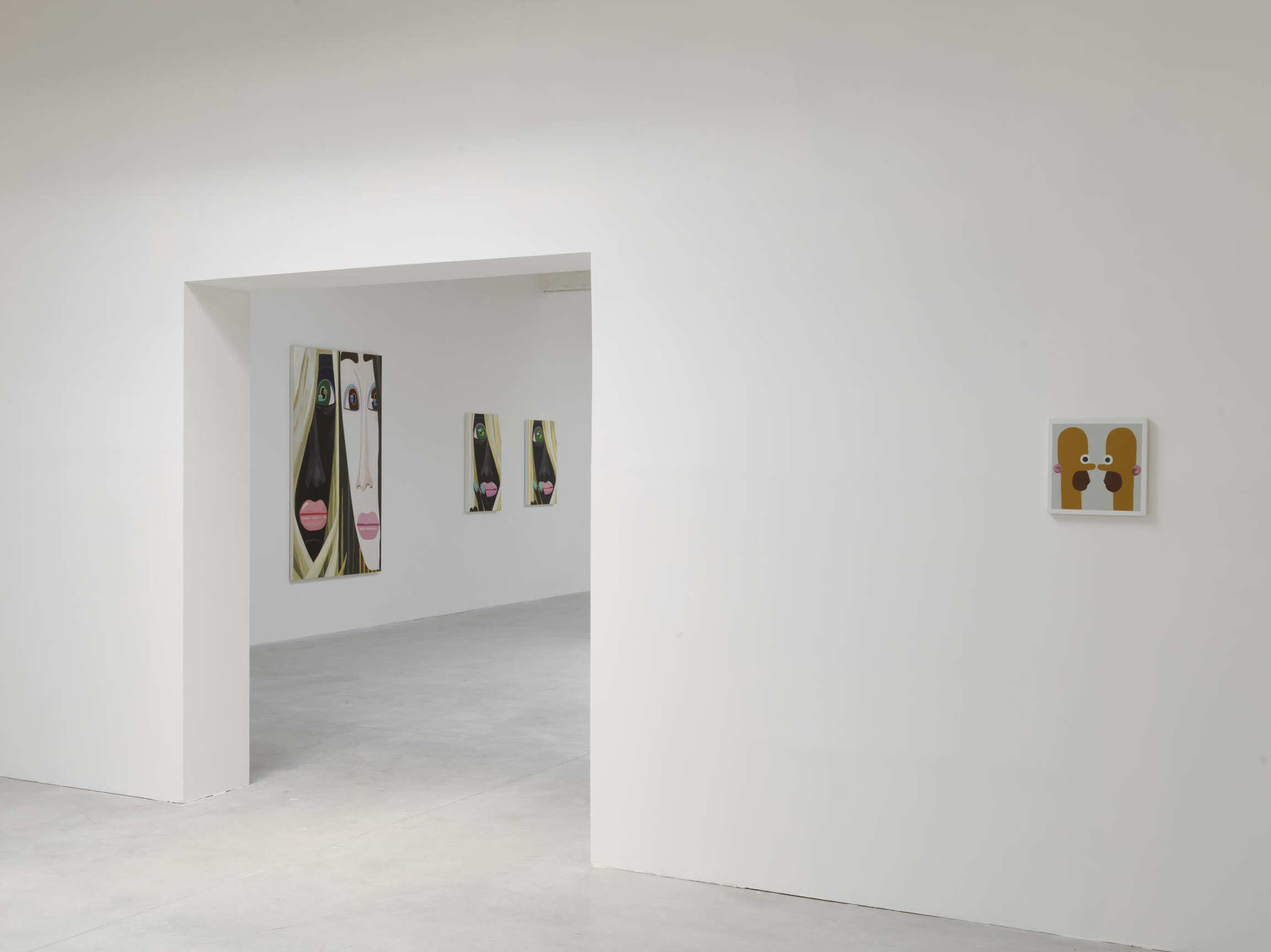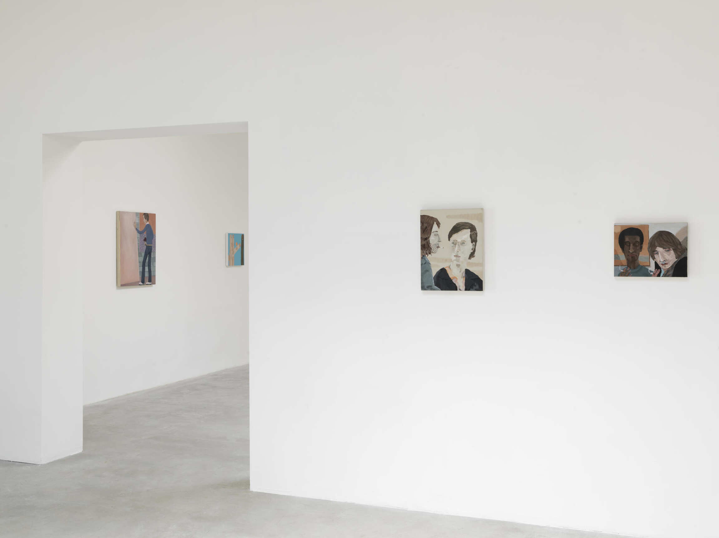 Calvin takes a more existential approach to portraiture, treating the human face or body as a self-contained landscape, and in these new pictures he has both tightened and expanded his focus. Where his earlier works tend to portray the awkwardness of casual interactions between people, these breviloquent scenes close in on an epidemic of self-awareness: The objective filter of a close-up may magnify the physical, but it also protectively hides the soul.