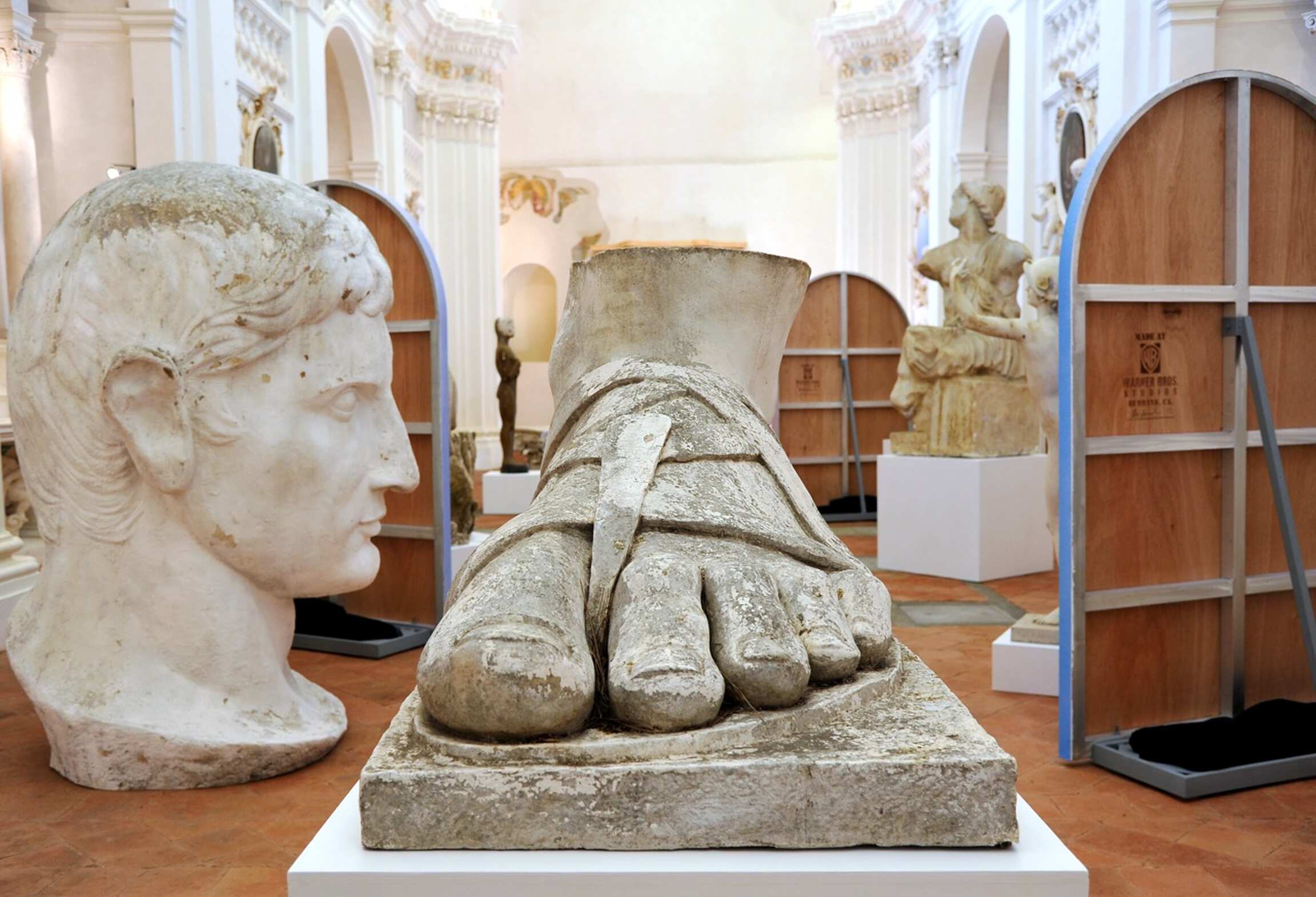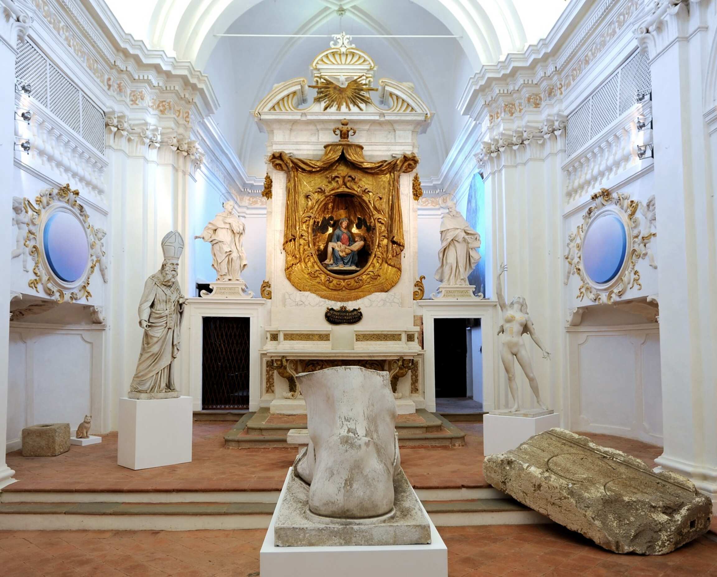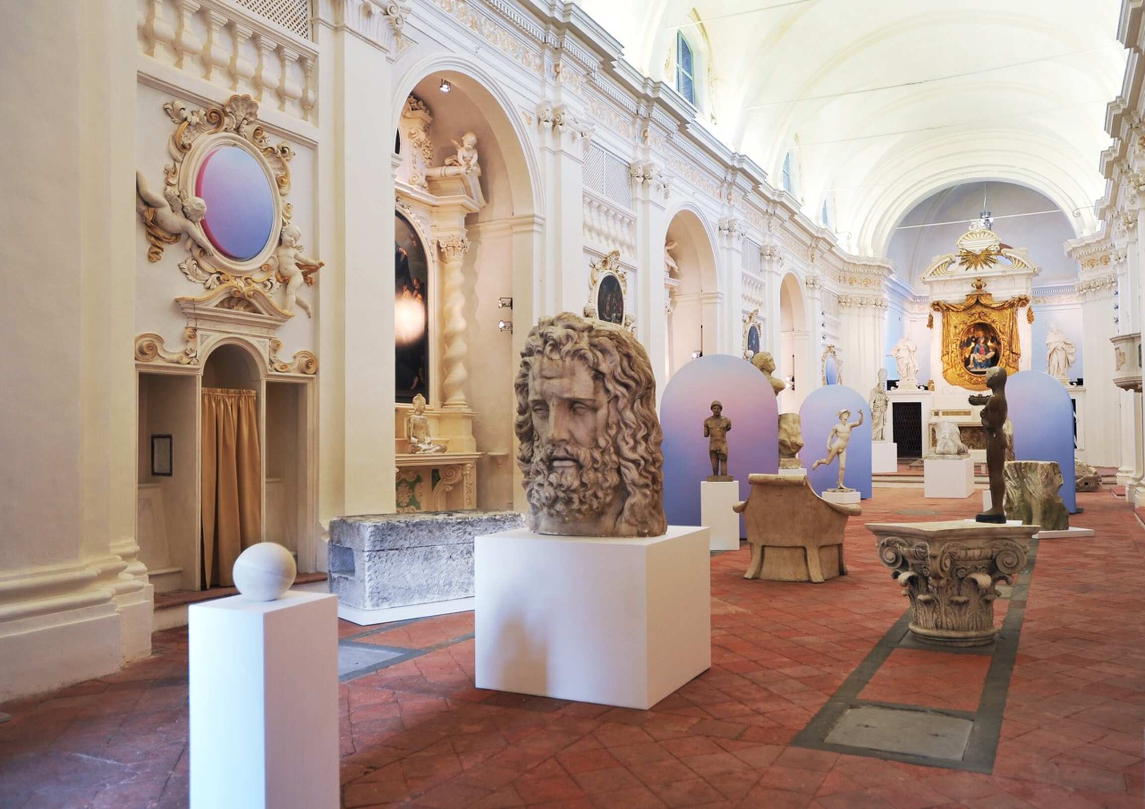 In the last century, the Museo Civico Diocesano di S. Maria dei Servi has been transformed from church to town storage to museum. Alex Israel’s installation draws inspiration from traditional characterizations that define all of these incarnations: spiritual, archival and museological.