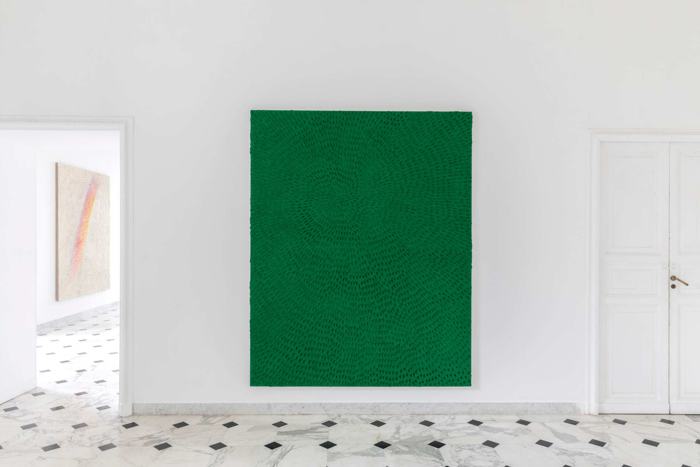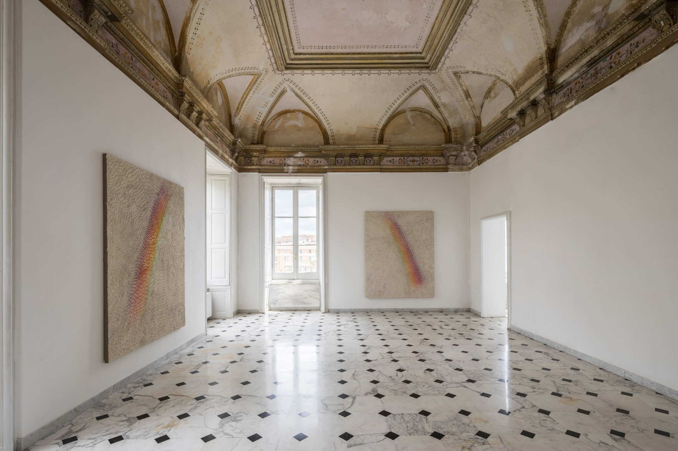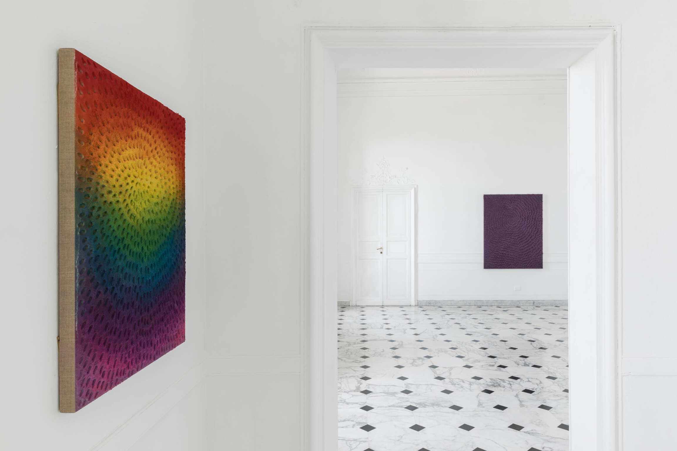 The canvases presented at Villa Croce were painted in spectral colors evoking the tones of the rainbow, a form associated with light refraction, and were made by an initial layer of sand and acrylic medium distributed onto the canvas. In the damp surface, using specialized tools, hundreds of indentations were pushed into the sand mixture radiating from a center point and creating mandala-like forms with shadow and light. In some works, these indentations were filled with paint, while in others additional layers of color are added to the surface intensifying the optical effect and increasing the texture density. All the colors of these paintings derived from the full spectrum of light composed of the colors of the rainbow which is then distilled in separate tones affecting the viewer through the color combinations in each room. The formal rigor and procedure of these paintings, simultaneously archaic and futuristic, emerges intuitively, without any preliminary design, simply by repeating the same gesture in an automatic way, as in embroidery or in a mandala. For the artist, this becomes a sort of mantra, with a result that goes beyond the boundaries of objective reality to enter a meditative landscape.