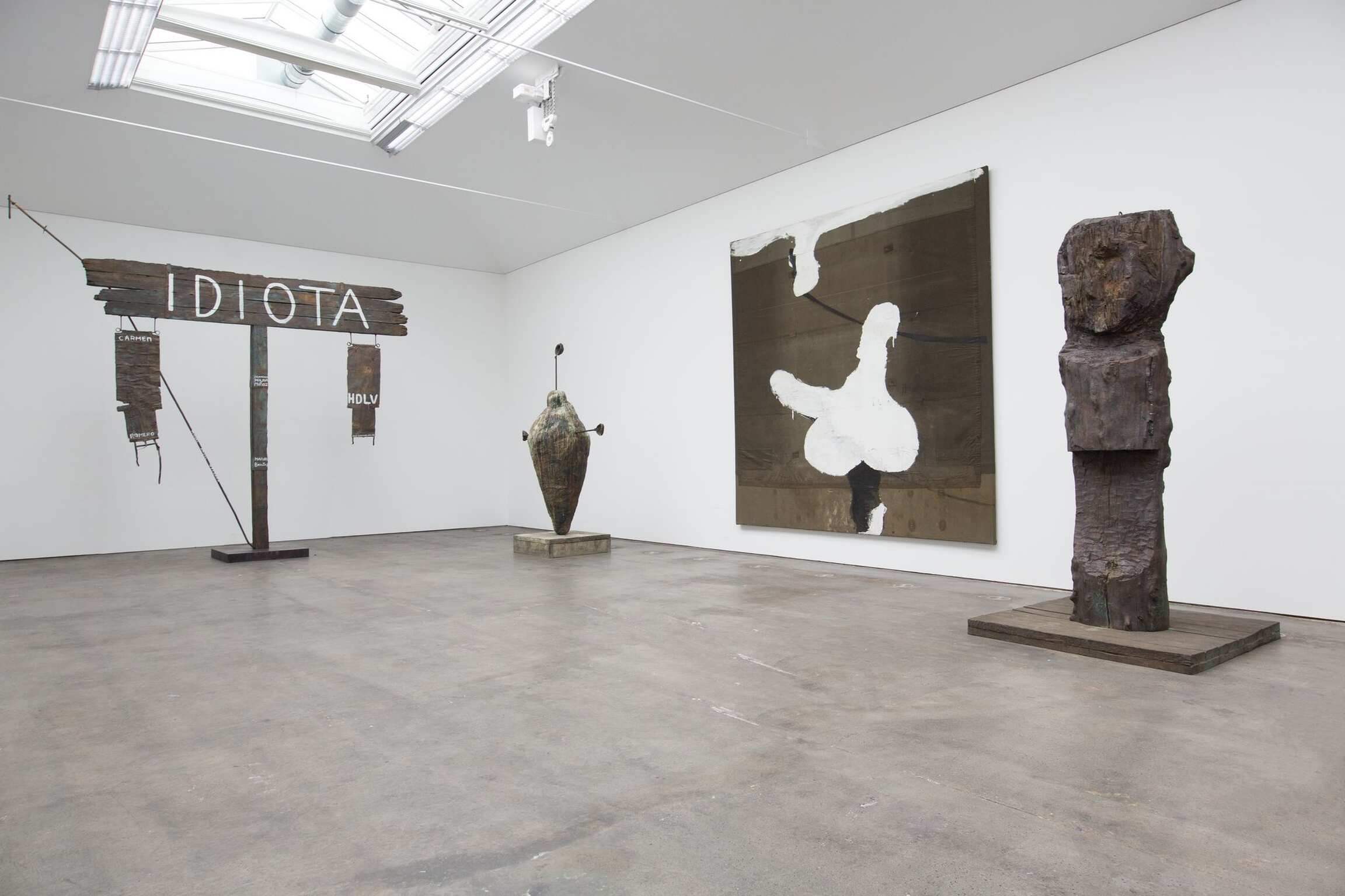 The Cuartel de Carmen in Seville, Spain is a monastery that was built in 1492 and had been occupied by the military in the beginning of 20th century and abandoned in 1978. For this exhibition Schnabel made 24 tarp paintings which he considered to be 24 stations of the cross. In 1979, Schnabel began to incorporate bronze elements in his paintings, and later progressed to monumental sculpture in the early 1980s. Idiota (1989) was first assembled in situ at the Cuartel de Carmen. This cruciform (or battle standard) was built entirely from material collected from the barracks. A large piece of bronze cast from a slab of wood acts as the standard and displays the title, “IDIOTA” above a series of Spanish names, “Carmen Romero”, “Manuel Benitez,” among others, are the names inscribed on the cross and bronze flags that hang from each arm. The work signifies Schnabel’s affinity for linguistic reference, and for the formal and pictorial quality of the letters themselves, besides being an appreciation for those who helped him make the sculpture.