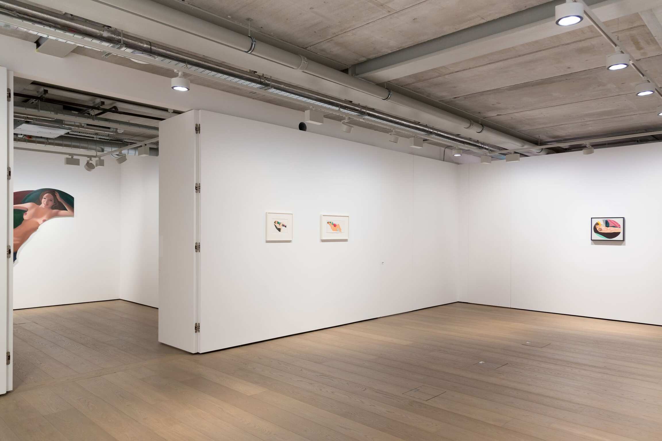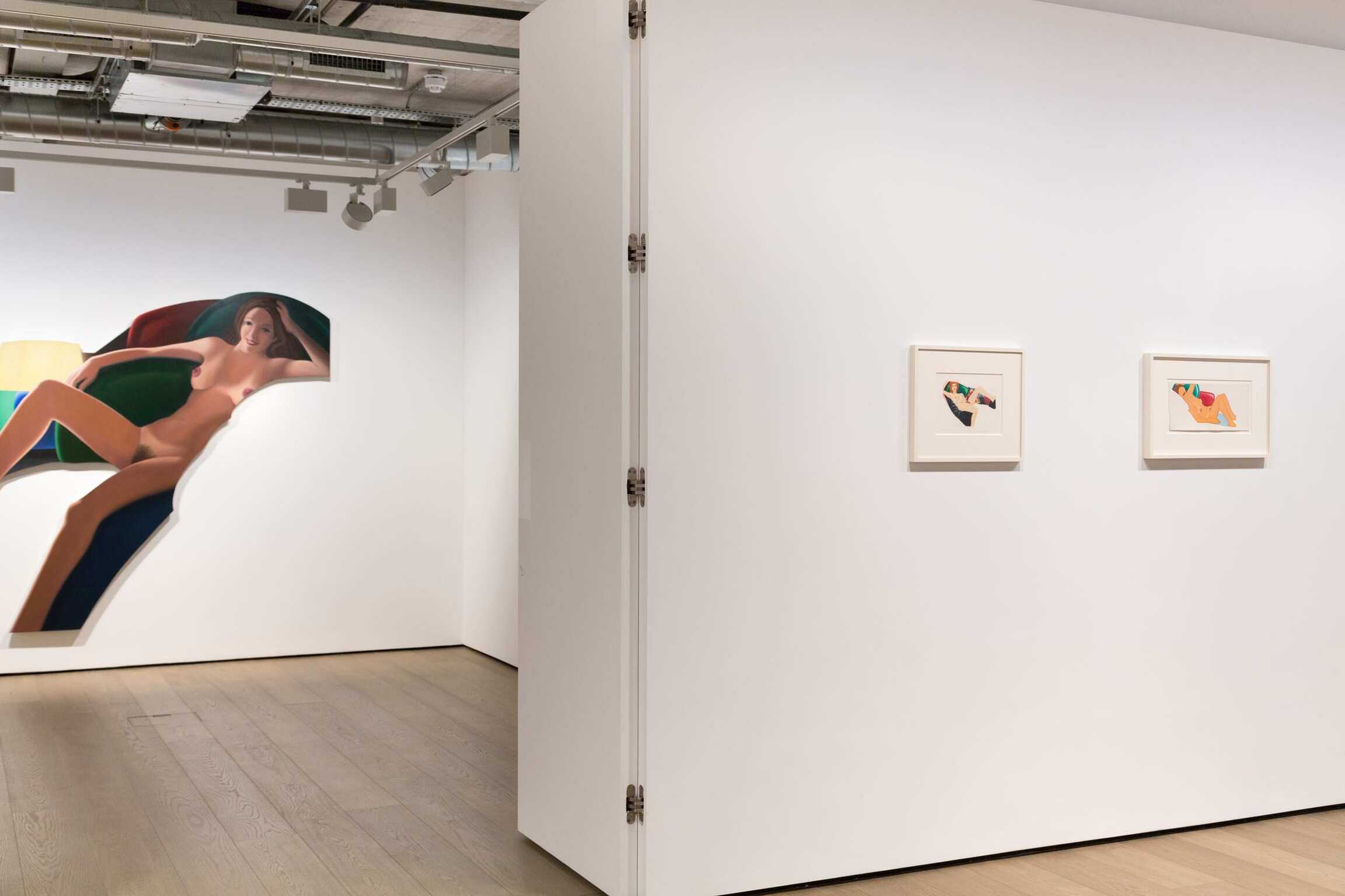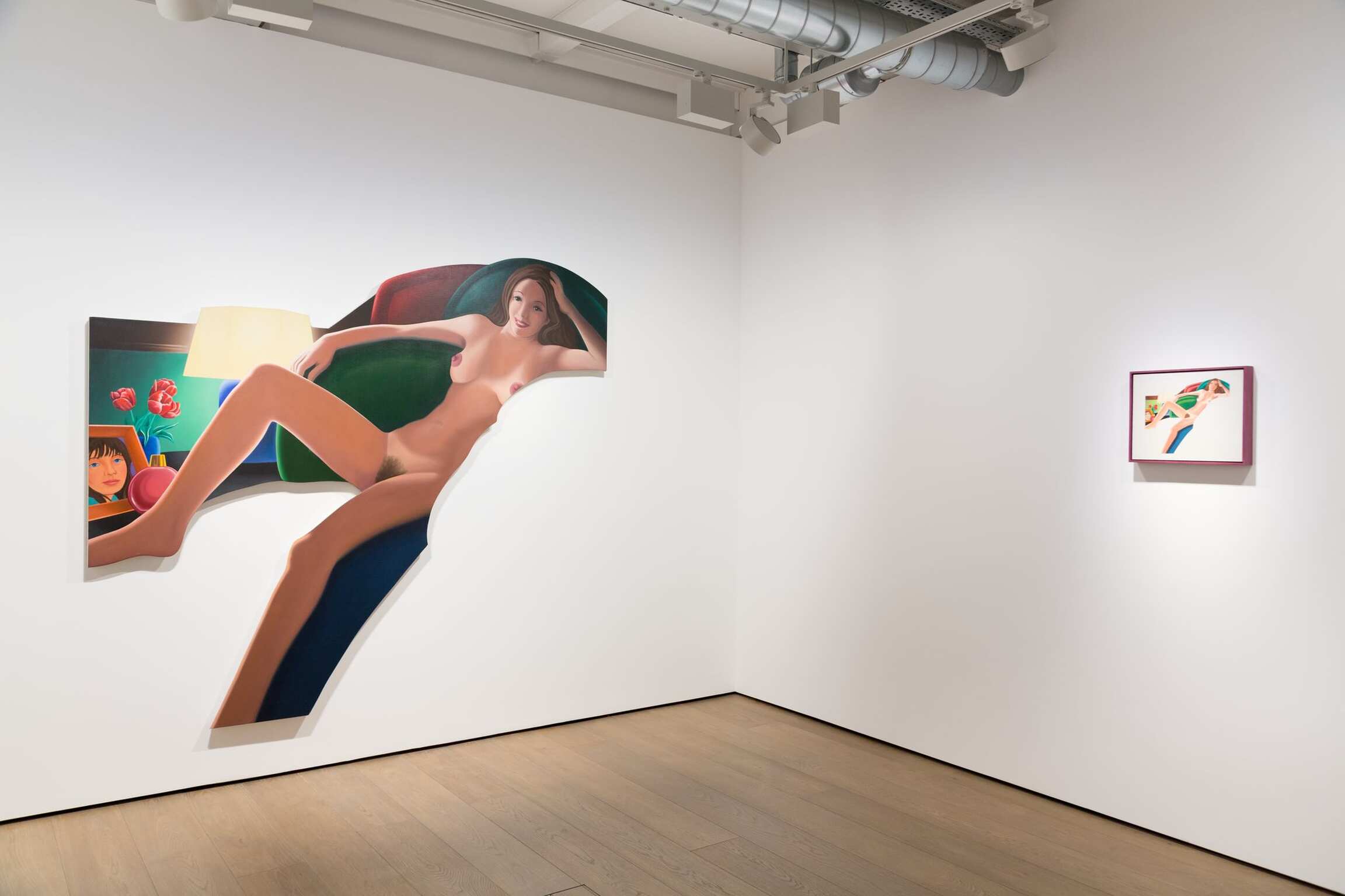 At Almine Rech Gallery, the key work Nude with Lamp (1977-80) is accompanied by related paintings and works on paper. For Wesselmann, Nude with Lamp posed two challenges: the eccentric shape of the canvas and the chiaroscuro of the nude in shadow. While his first shaped canvases were determined by the silhouette of a single depicted object, as in the Smoker series, later works such as Nude with Lamp are shaped according to their own logic, rather than that of the painted image, utilizing the blank space of the bare wall behind. Repurposing the formal elements of advertising, such as shaped posters and cutouts, Wesselmann complicates the relationship between his female figures and their environments, their long, tanned legs often appearing to extend beyond the two-dimensional surface. After Great American Nude #100 (1973), his titles became more descriptive, even personal, sometimes naming the model, as in Pat Nude or Barbara and Baby, detailed studies of which are included in this exhibition. Wesselmann commented that these works were “his first attempts to be emotionally touching, on levels other than sexual.”