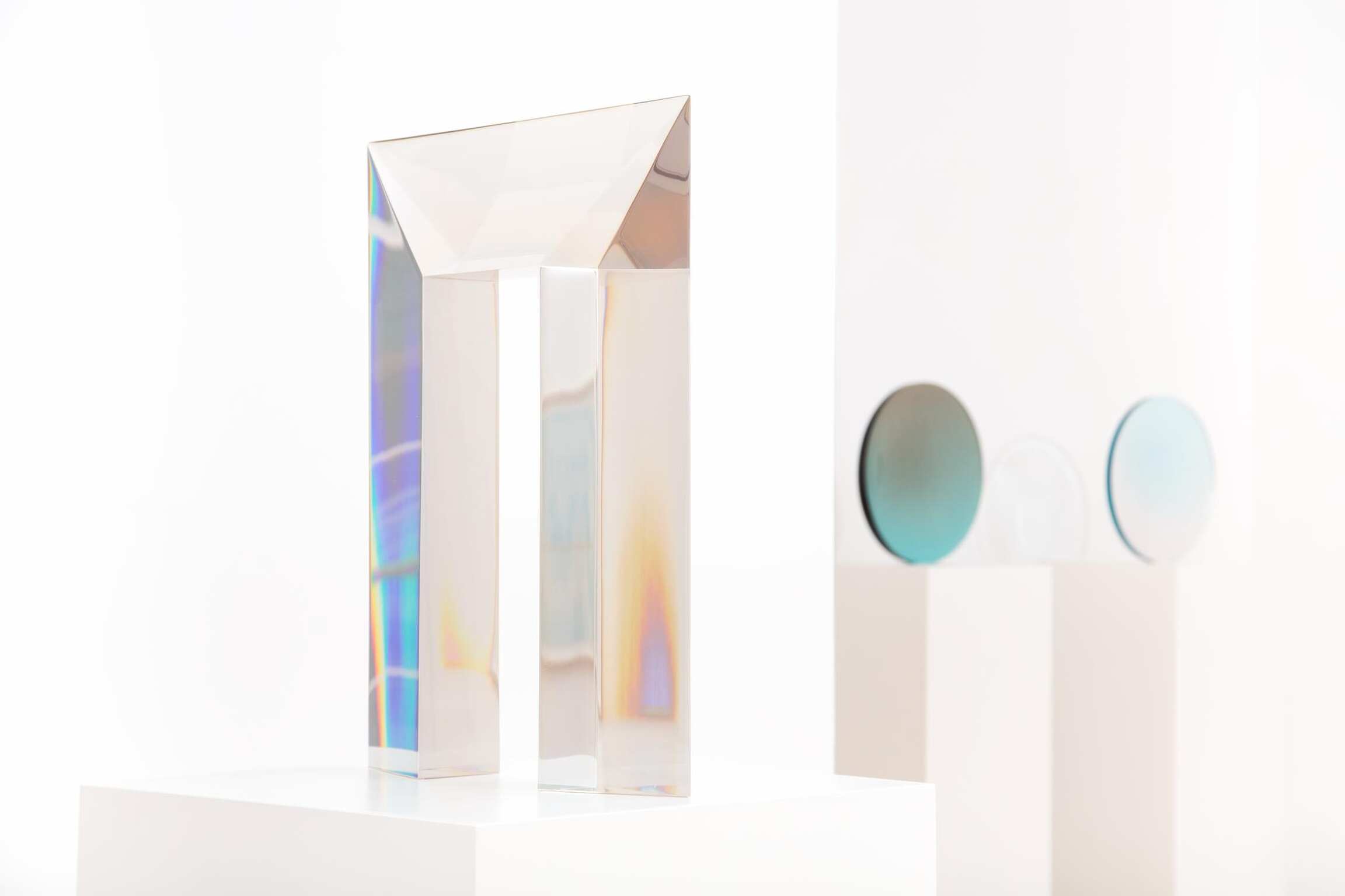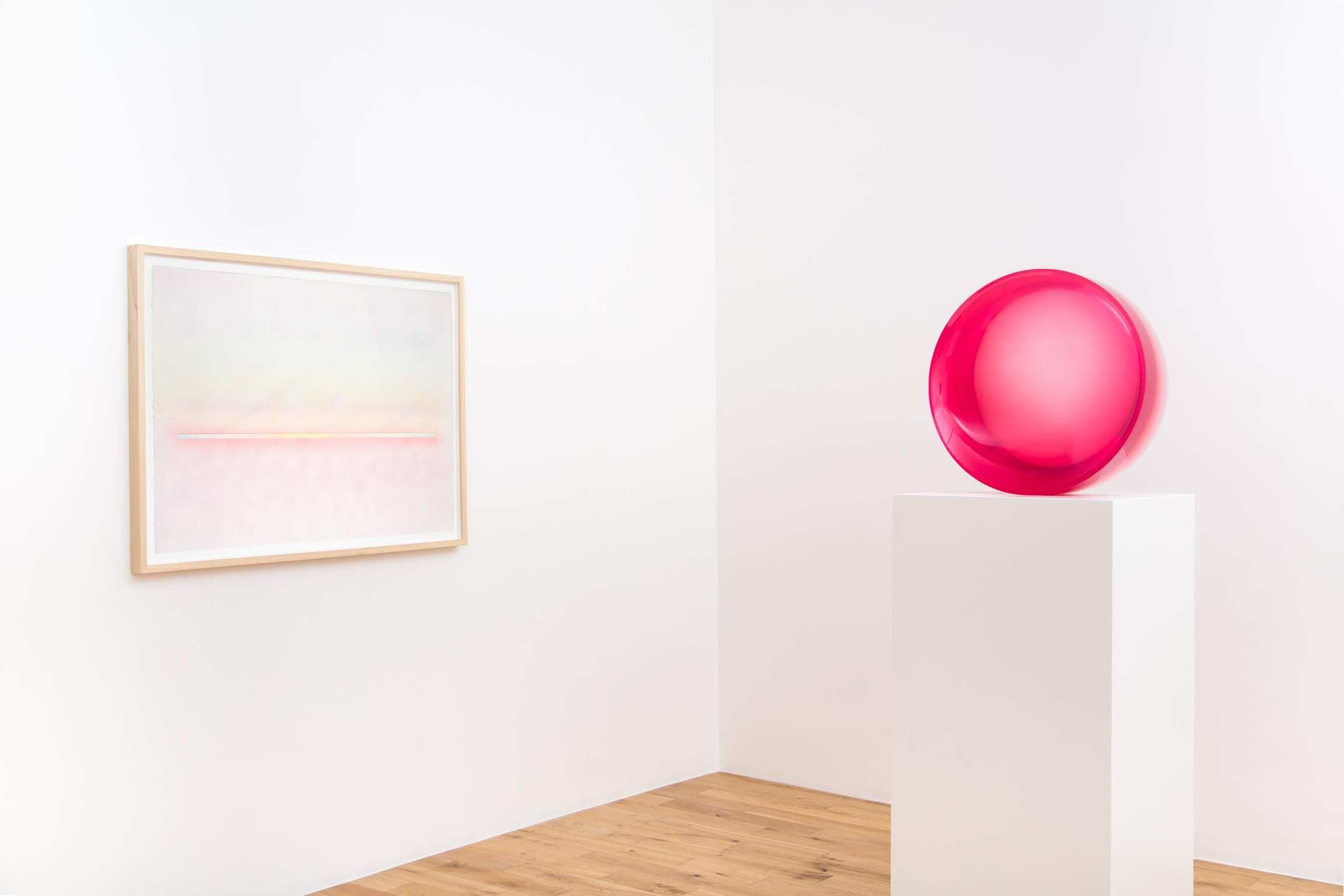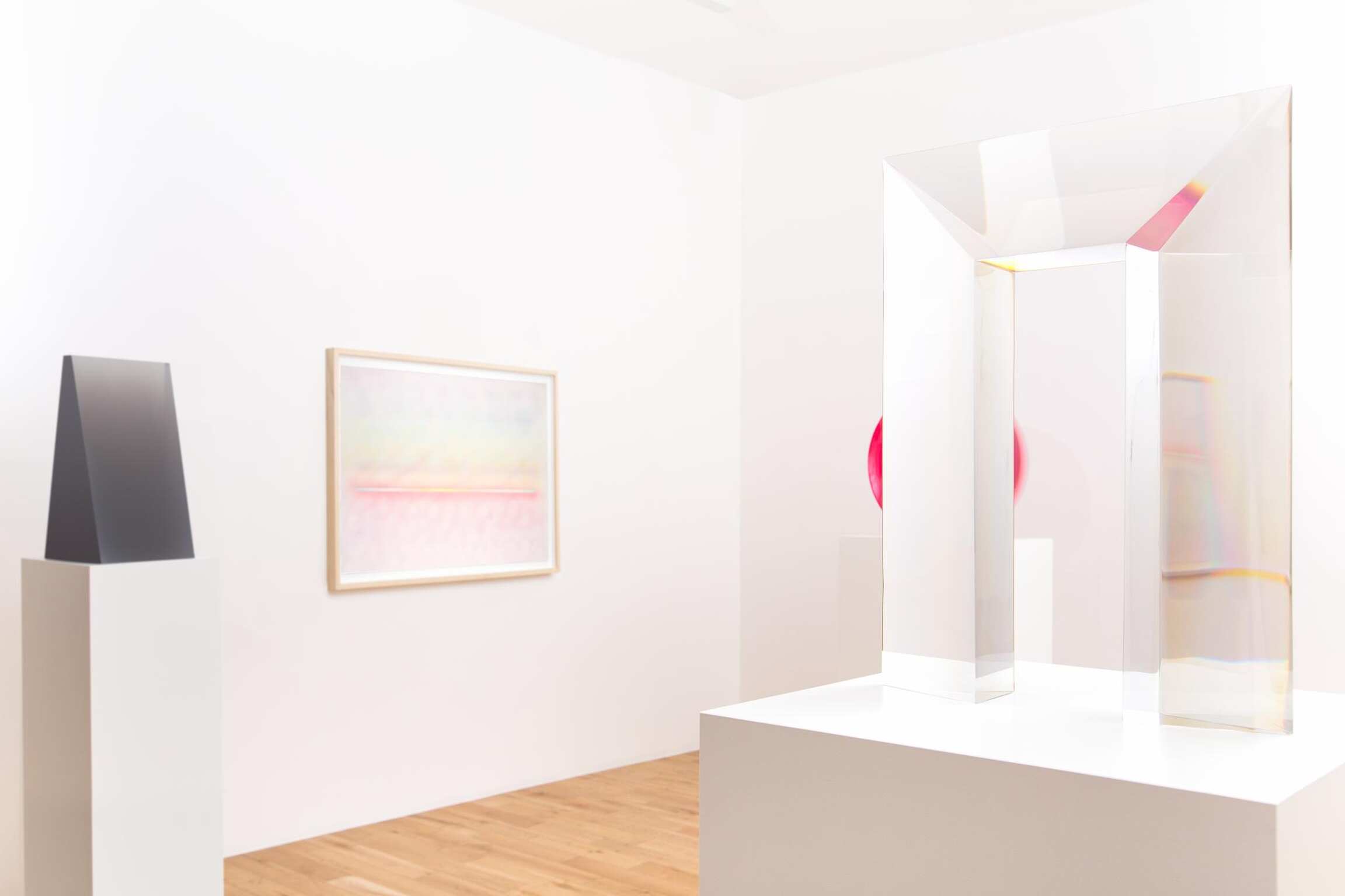 On view in the exhibition are both large-scale and smaller size colored sculptures. […] Whichever the format or the color, the artworks, with their smooth, highly-polished translucent surfaces explore the material’s ability to carry and reflect light. […]