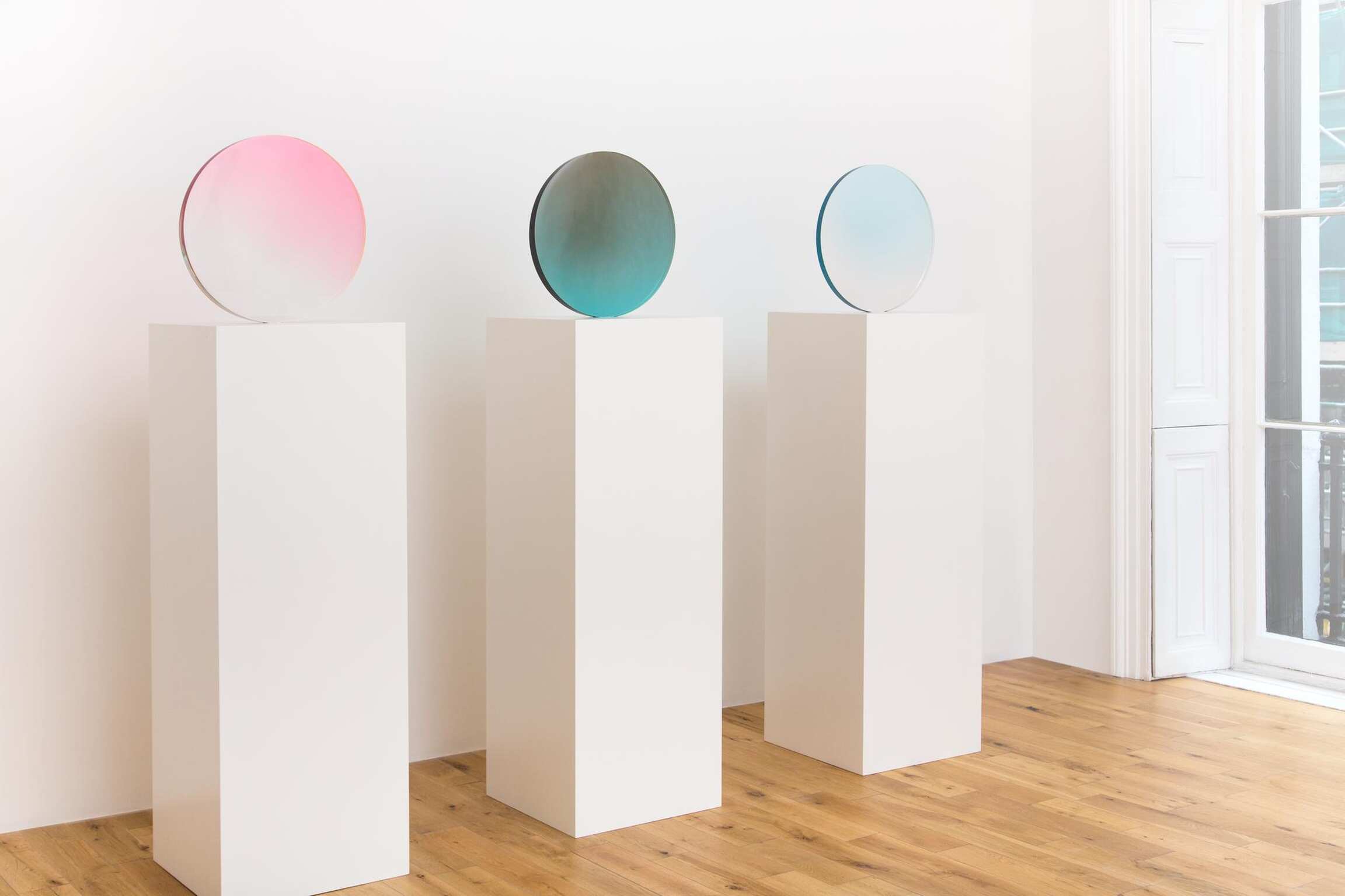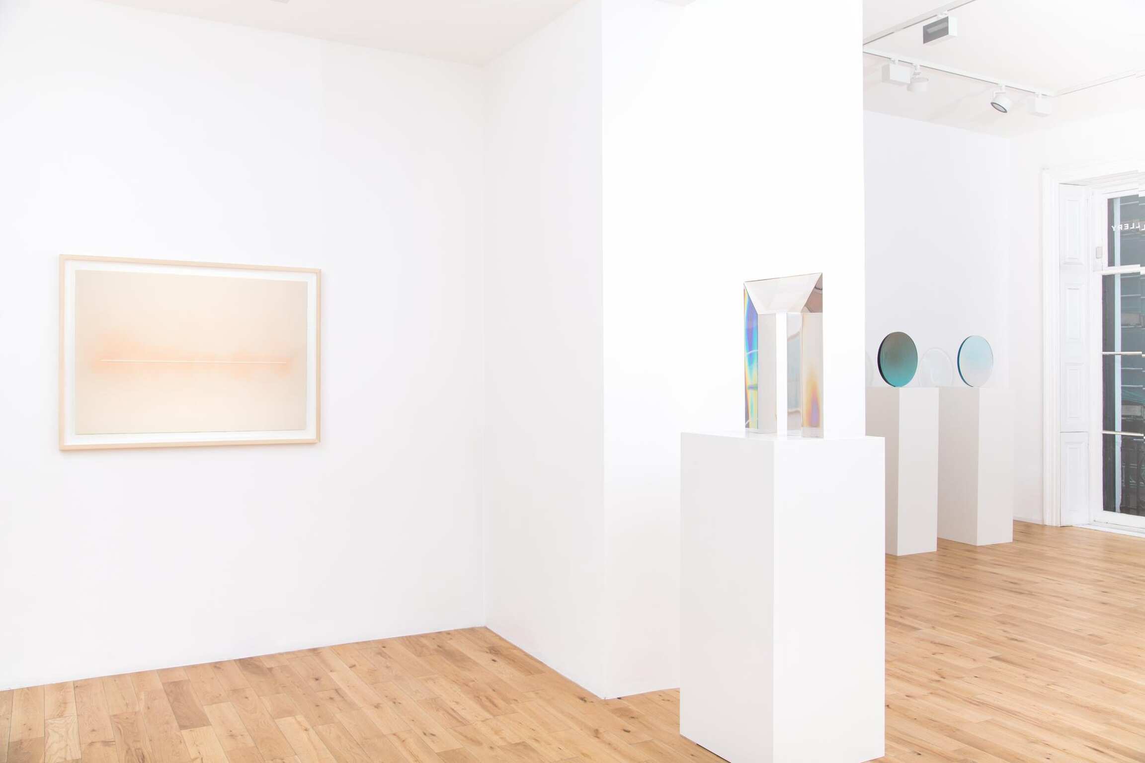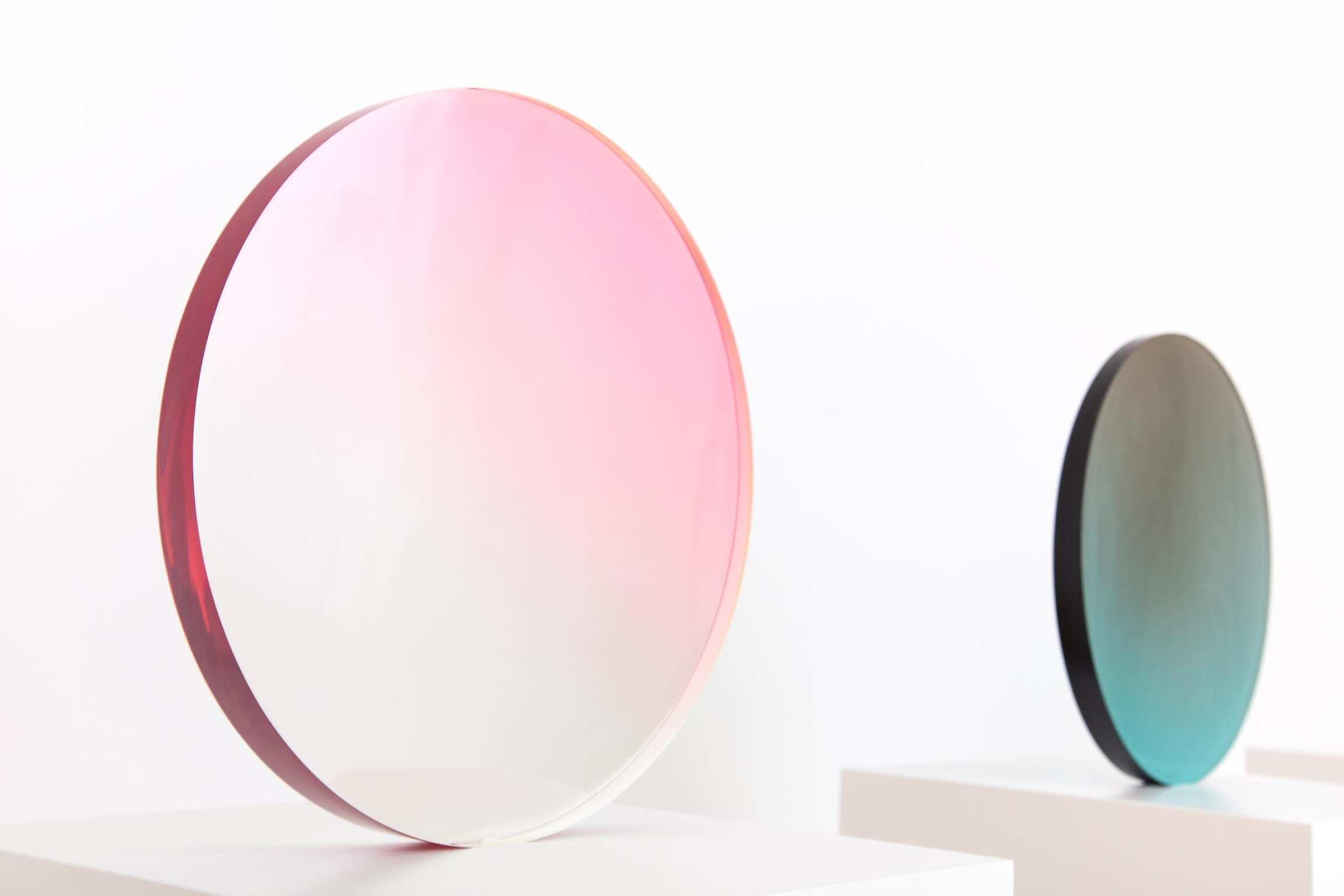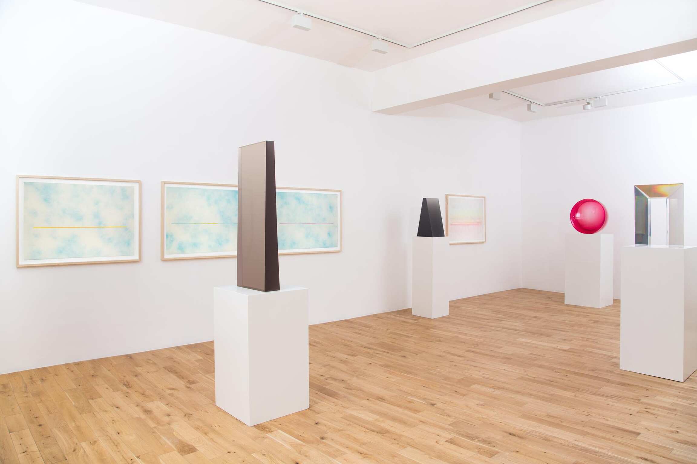 On view in the exhibition are both large-scale and smaller size colored sculptures. […] Whichever the format or the color, the artworks, with their smooth, highly-polished translucent surfaces explore the material’s ability to carry and reflect light. […]