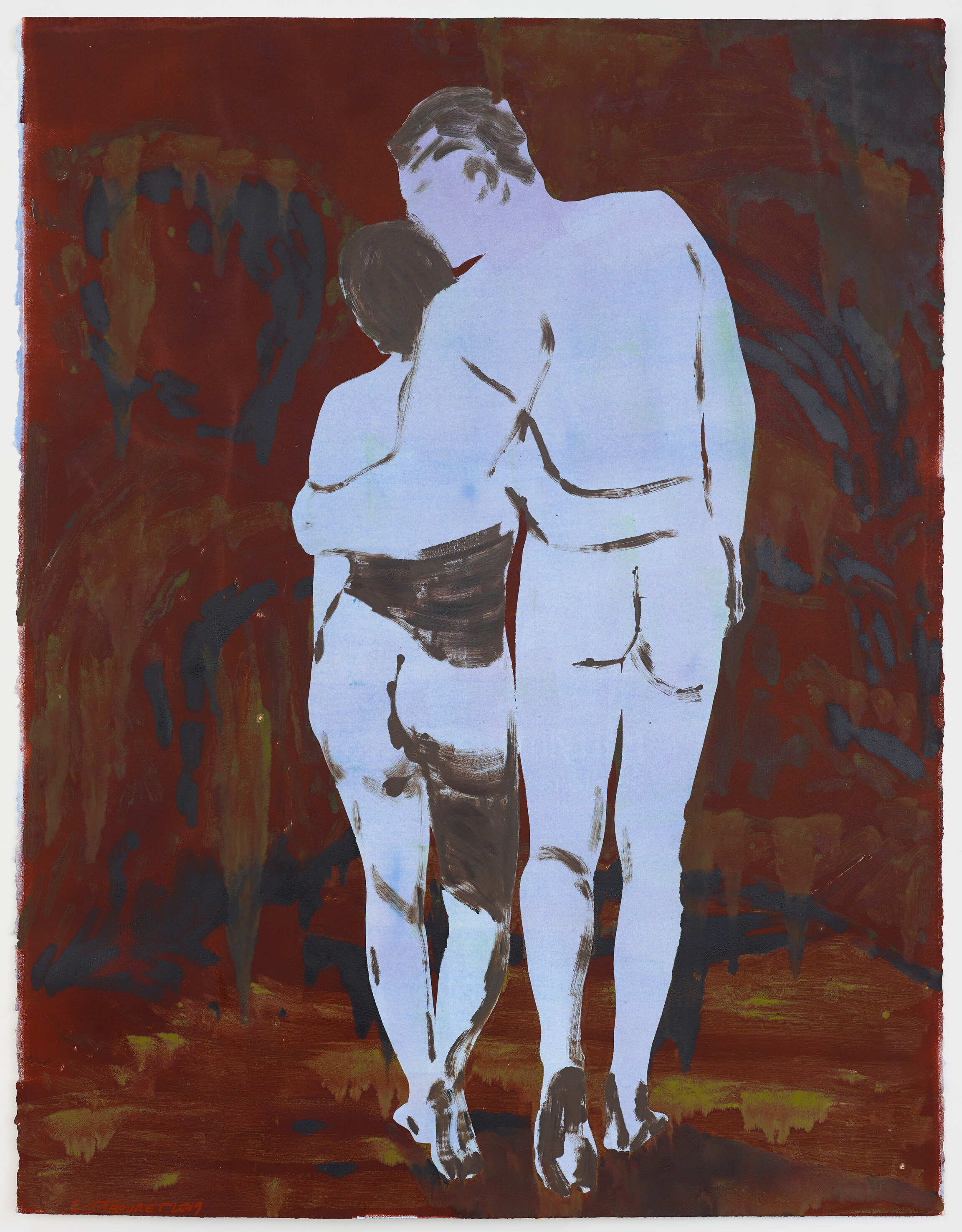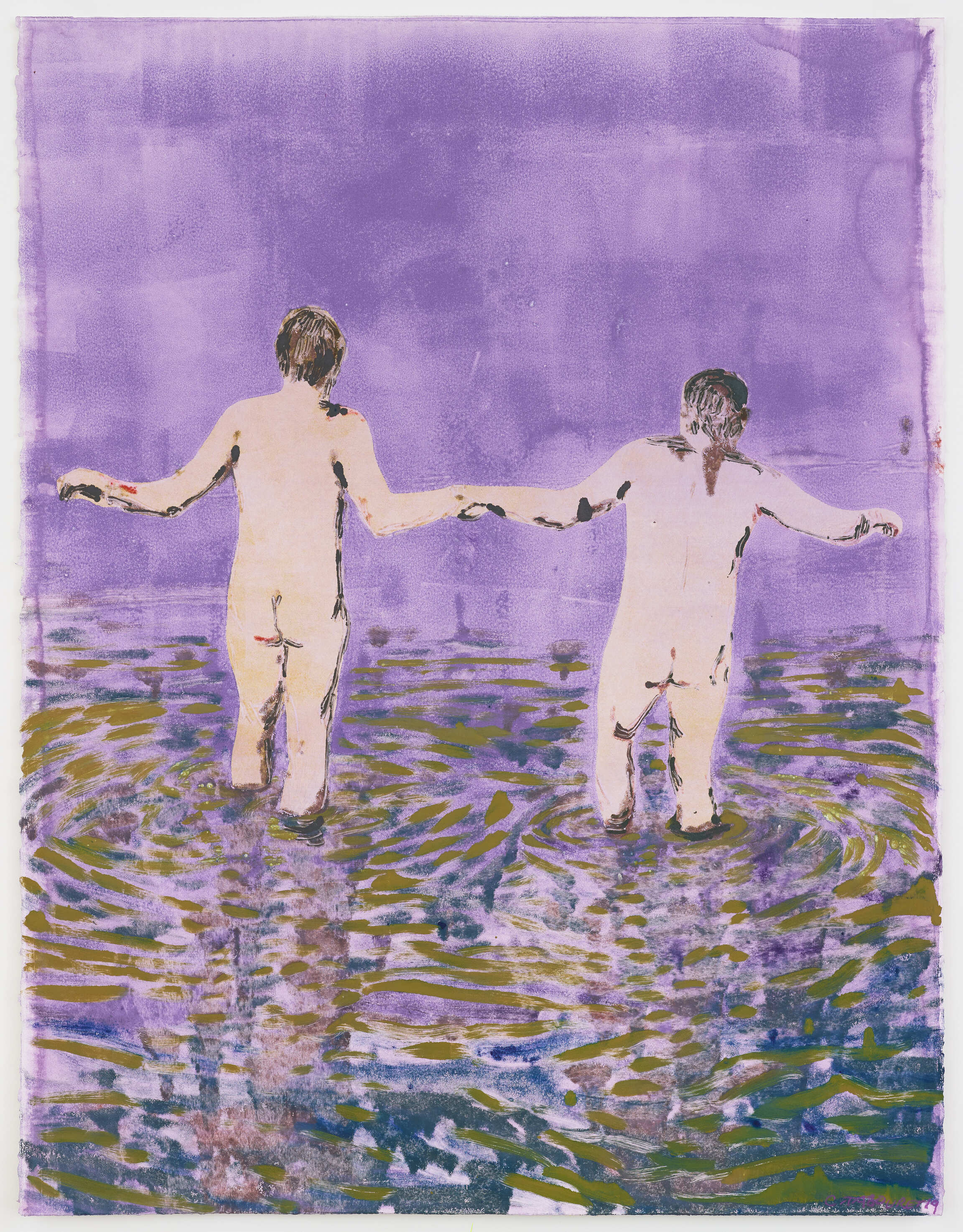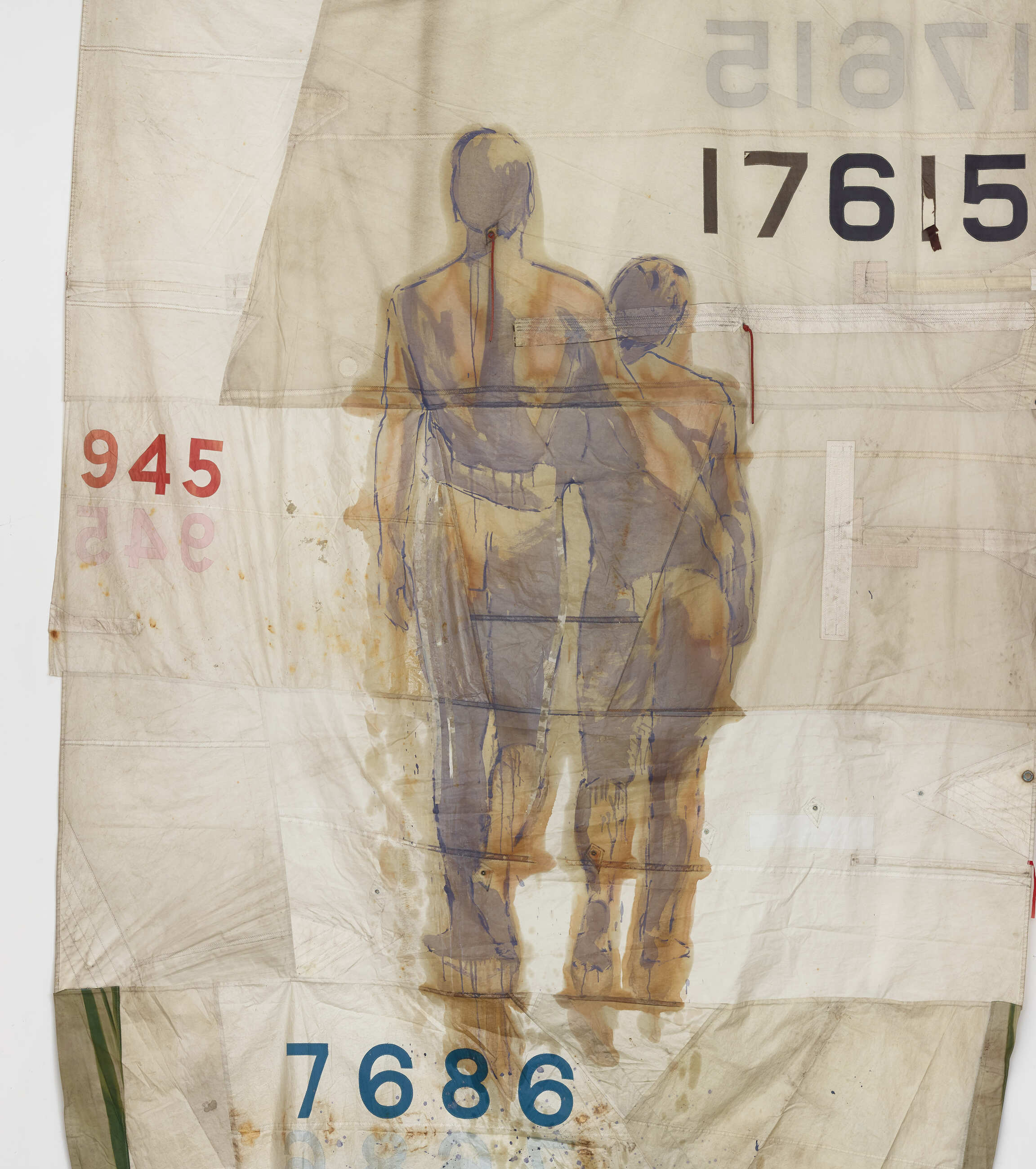 For Claire Tabouret, this exhibition at the HAB Galerie offers us an opportunity to see her painting on an entirely different scale than that of classical framed and stretched canvases. Here, she can extract the figures from her work and turn them into volumes within a custom-designed space. Every Claire Tabouret show is like the new chapter of a story set to paint. Los Angeles – city between mountains, desert and ocean, where she has lived for several years – has become her elsewhere. Imagining she had to cross the seven seas to reach Nantes, Claire Tabouret went to the port of San Pedro along the Californian coast to find the cloth used for sails, which became the medium for her painting. Cut, stretched and re-stitched, the surface of these gigantic new canvases has become home to different human figures. Suspended throughout the gallery, these sails are left to dance freely to the drafts or slight winds caused by passing visitors. Stained and made threadbare by their various journeys, they are almost tanned like leather. Beige, raw and yellowish, they like skins tattooed by the artist’s collages and paintings.The figures – both feminine and masculine – walk towards the horizon, turn their backs, hold hands, kiss, embrace one another... Since there is no background scenery, these bodies float in a nameless world. Sometimes, out of these large, frameless canvases, these silhouettes take on three dimensions and become painted plaster sculptures. By contrast with the faded tones of the painted sails, these same characters appear in the acidic colours of the monotype hanging on the wall. These prints feature a dynamic composition of superimposed patterns – of bodies that come to life, writhe and struggle. Inspired by If Only the Sea Could Sleep: Love Poems – a collection of Syrian poems by the poet Adonis to whom she pays homage – Claire Tabouret uses the constant movement of the sea as a metaphor to translate the emotional ebb and flow of a romantic encounter.