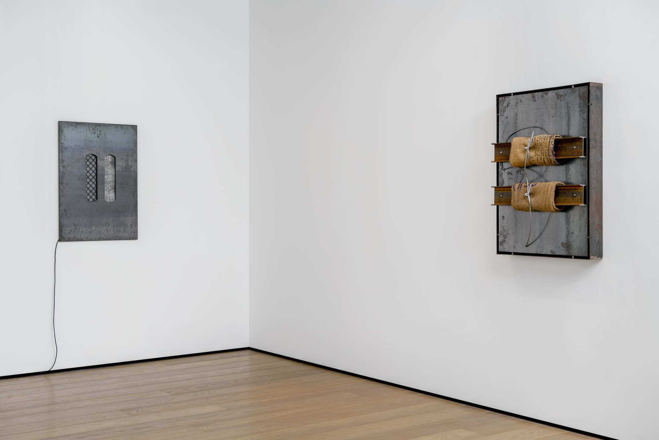 The exhibition is completed with a further two works from 2014, which are concerned with the juxtaposition of precariousness and fragility with the robust iron surface which they are each comprised of. These works, which are amongst Kounellis’ final ones conjure ideas of creation and destruction, and see the artist continue in his pursuit for art in everyday life.