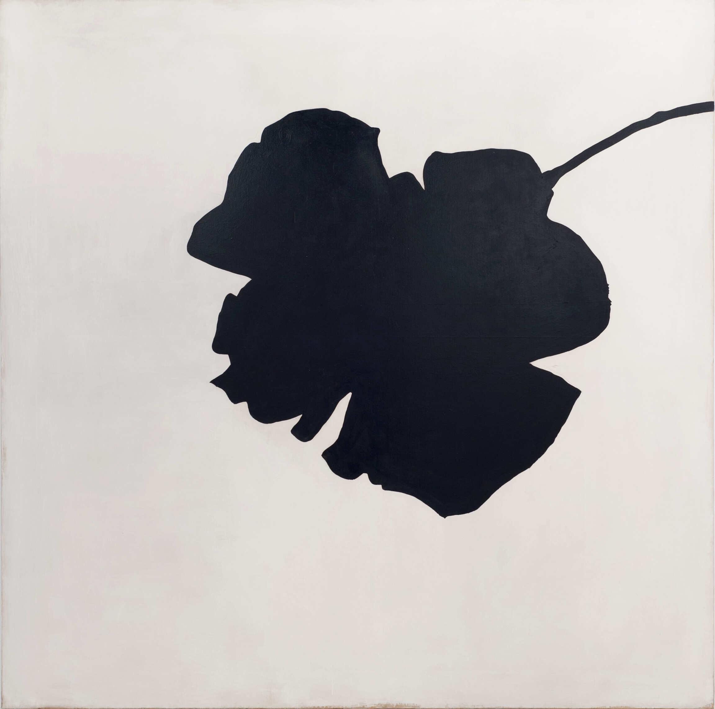 In 1963, as the Alfabeti had become a recognised style, Kounellis began working with landscapes, and drawing his reference points from the physical world. This can be seen in Black Rose, 1965-66, a seminal work painted with Ducotone, a water-based wall paint, on large canvas measuring over two metres in length and width. Black Rose, 1965-66 emerges as a pivotal example of Kounellis’ role as a founding father of Arte Povera. Its organic shape is presented in matt black, reflecting Kounellis’ sculptural practice in painterly form. Compositionally, the work draws from the alchemical classification of elements, namely of fire, as well as demonstrating Arte Povera’s drive to abandon colour, perceived by Kounellis as alien to the context of post-war Italy.