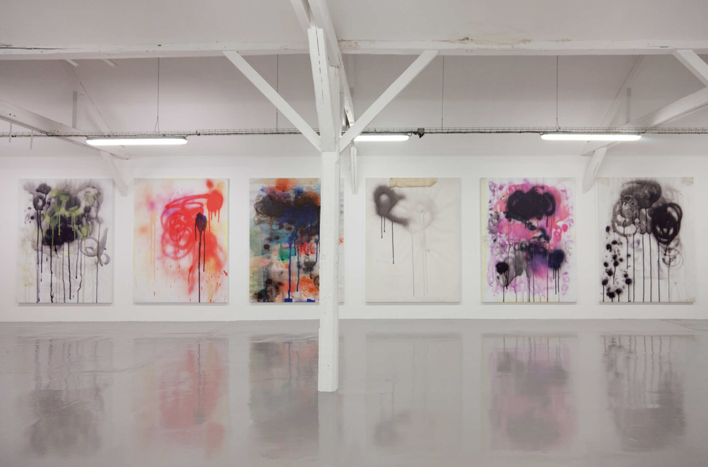 Parallel to their figurative series, the artists pursue an abstract series they call smears : while working, the arists use sheets of scrap paper to test and purge their airbrushes. These sheets are then digitally rendered and reproduced through ink printing to create smears.