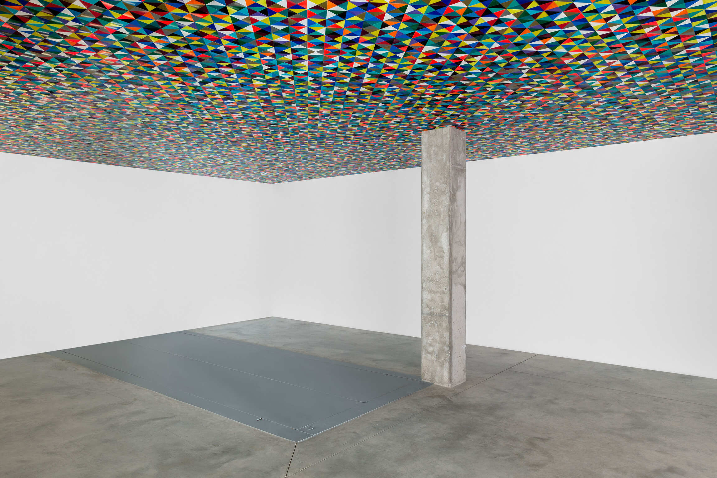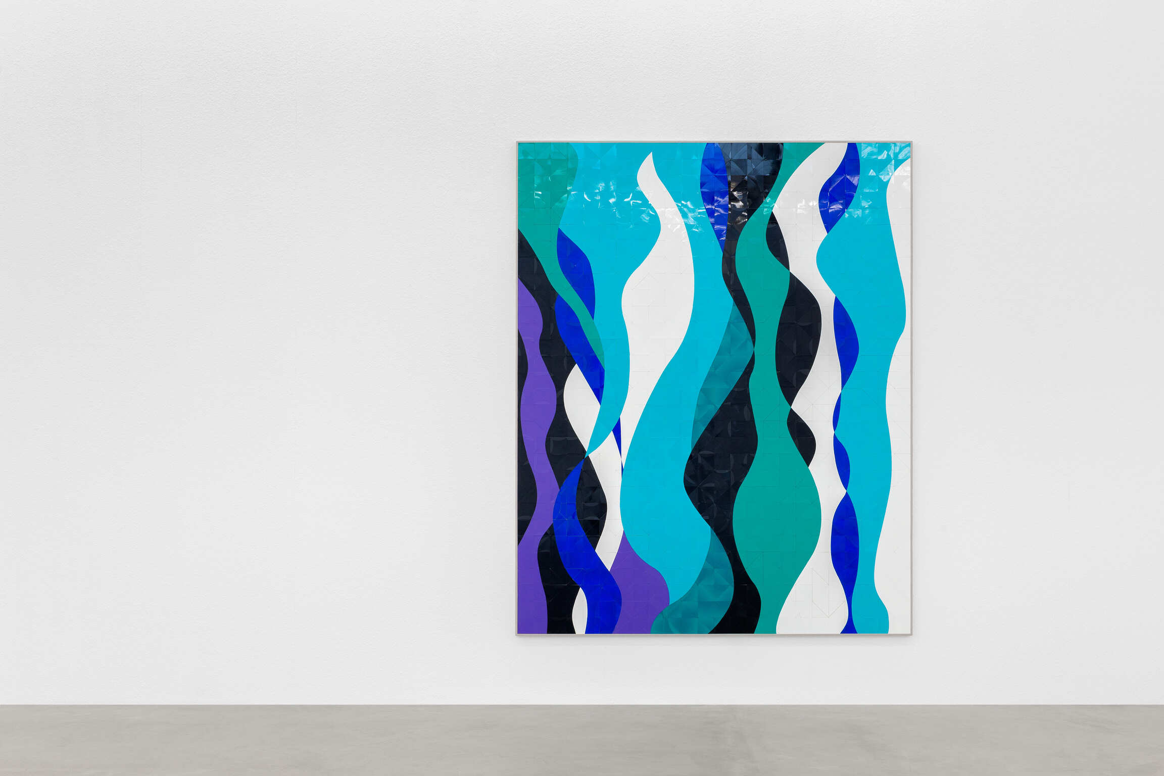 Both of these vinyl paintings see the artist deploy new motifs: one in mixed shades of blue, green and purple (titled ‘Albion’, 2019) is made from the same EP by Paar as the ceiling installation, and features an abstract wave motif; and another one in black (titled ‘Midnight Oil’, 2019), made from salvaged records, features white snaking lines dissecting an all-over grid, in homage to the artist Imi Knoebel. These works are joined by an almost completely white painting with a riot of color in one corner, which was made by covering a canvas with the beginnings and ends of cassette tape, which are always either white, transparent, or brightly colored, in distinction to the dark brown of the magnetized portion.