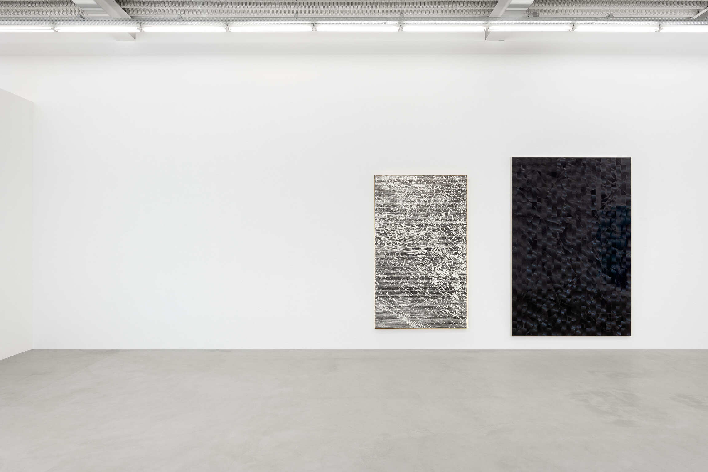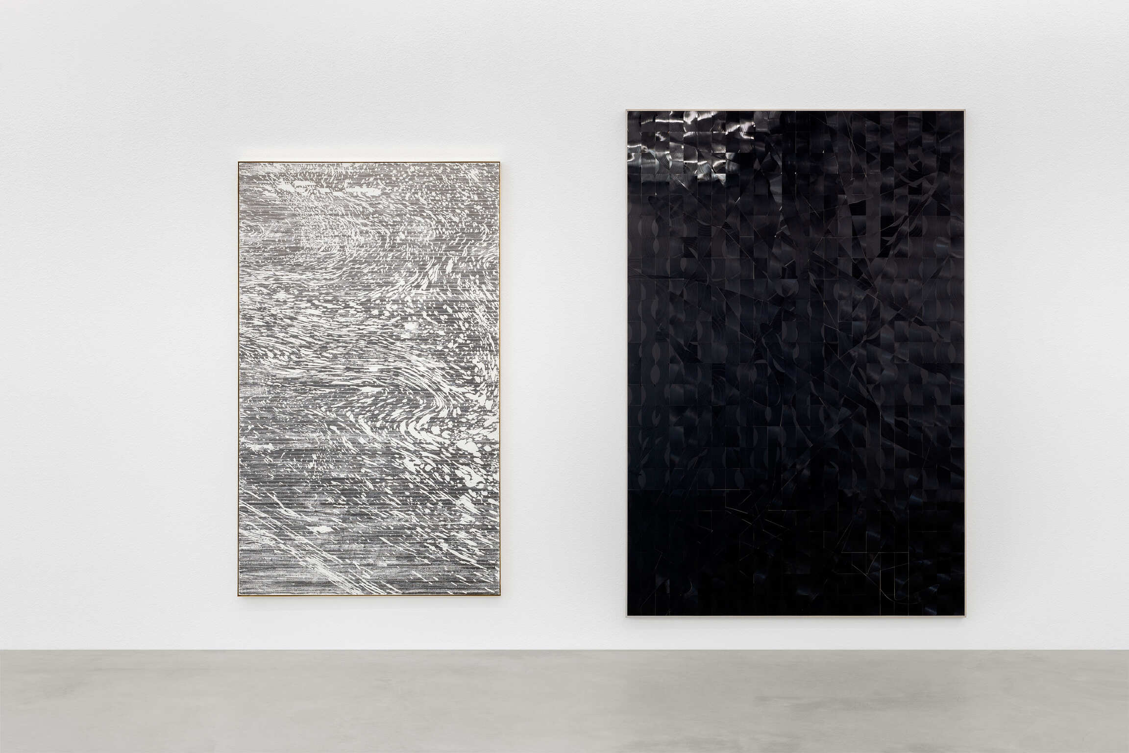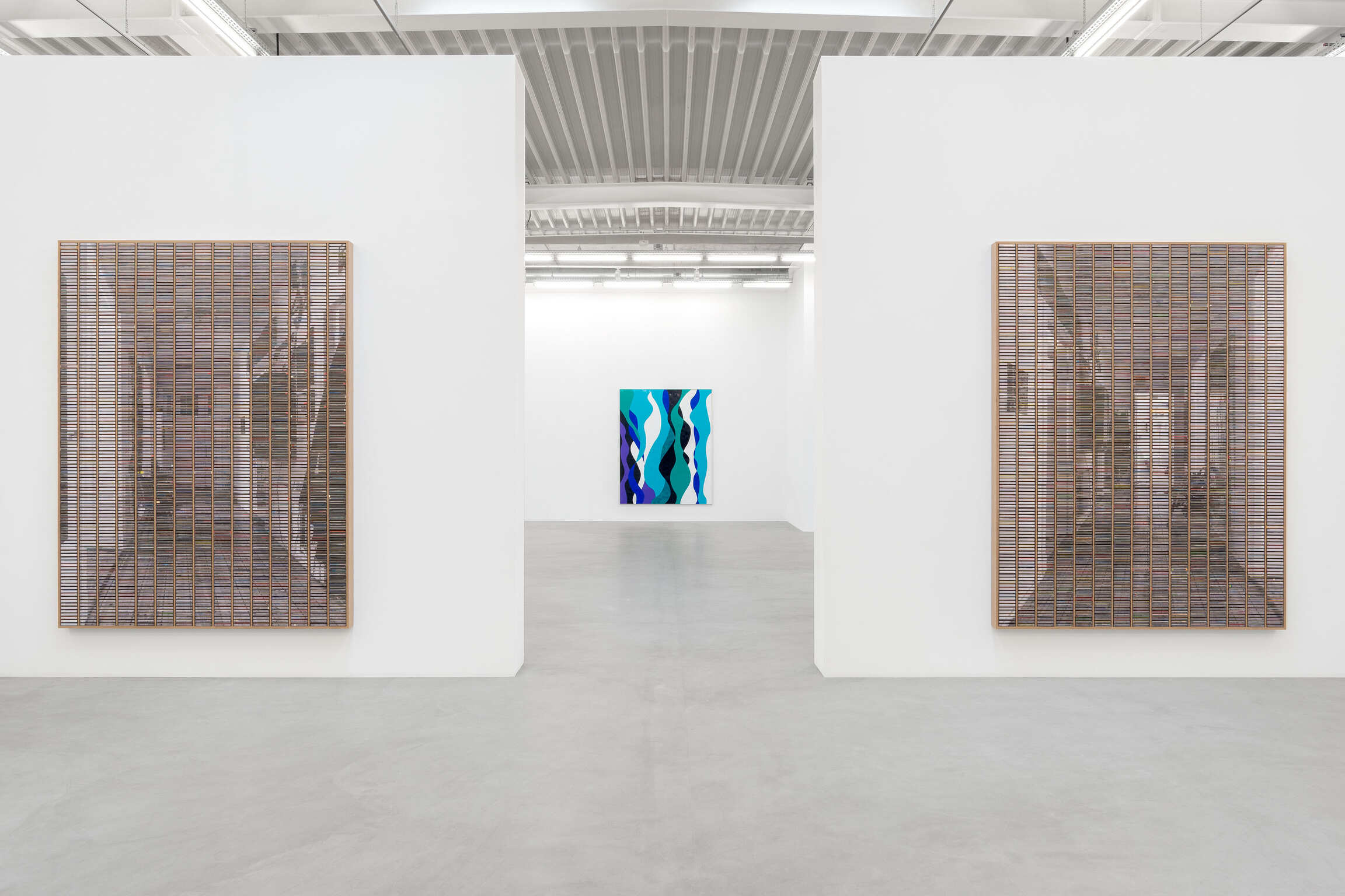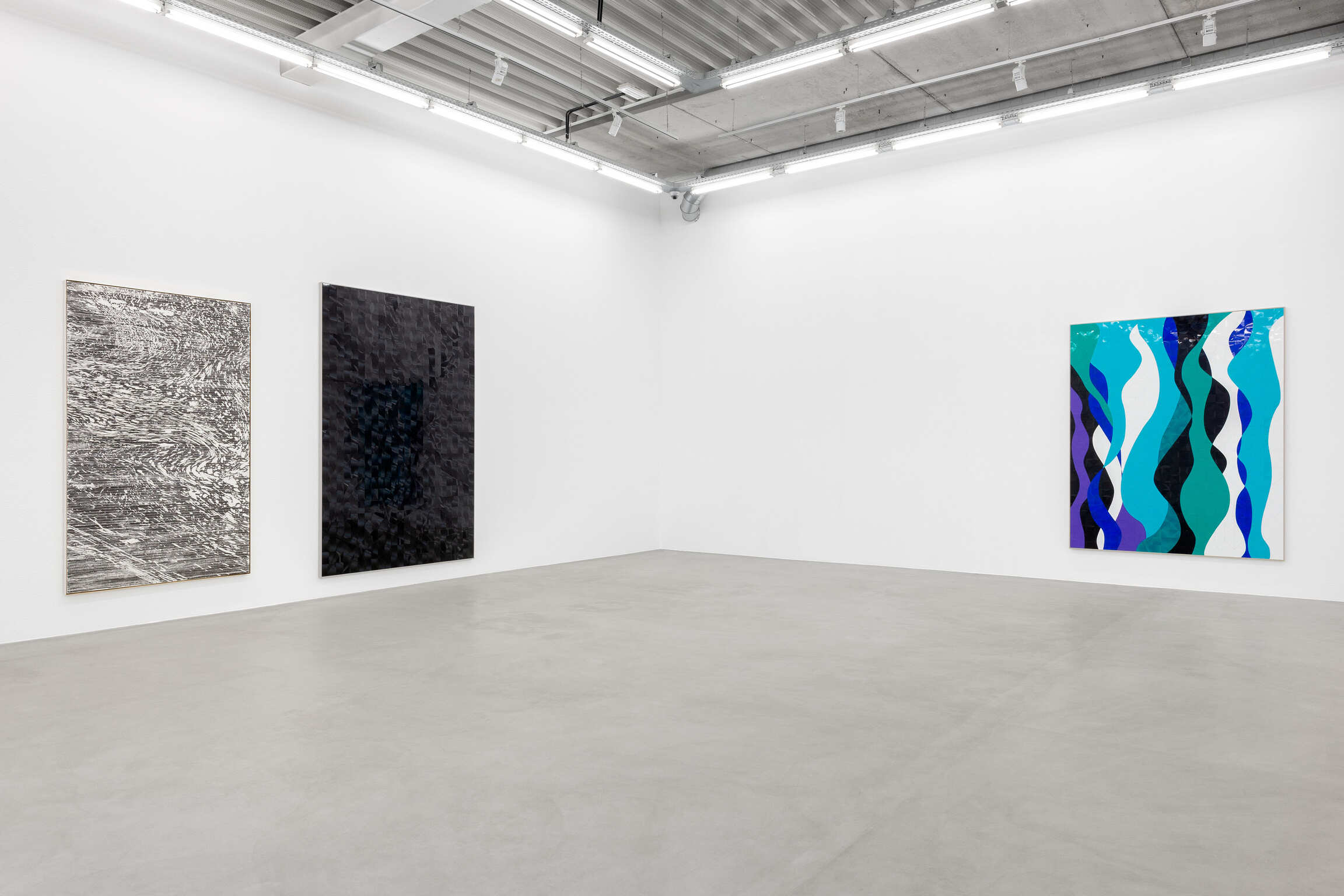 À travers ces deux tableaux, l’artiste déploie de nouveaux motifs: l’un, dans des tons mêlés de bleu, vert et violet ('Albion', 2019) est constitué du même album de Paar que l’installation au plafond, et comporte un motif ondulant abstrait; l’autre, en noir ('Midnight Oil', 2019), réalisé à partir de disques récupérés, comporte des lignes blanches qui serpentent et découpent une grille, en hommage à l’artiste Imi Knoebel. À ces deux œuvres s’ajoute un tableau presque entièrement blanc, avec une touche de couleur dans un coin, réalisé en recouvrant la toile d’entames de bandes de cassettes audio, qui sont toujours blanches, transparentes ou de couleurs vives, contrairement au brun foncé de la partie magnétique.