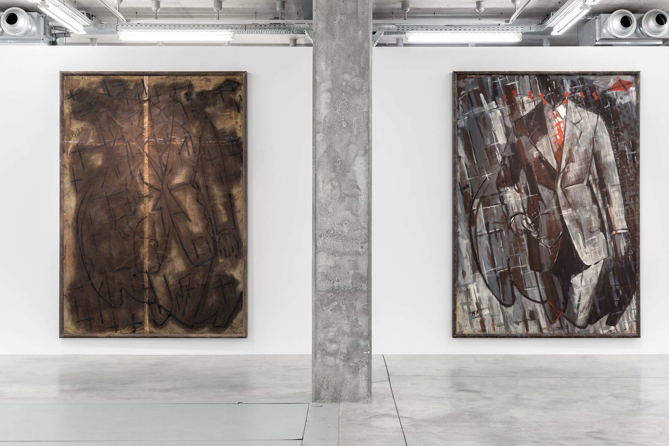 On pouvait également voir une sélection de sa série de ‘dos nus’. Lüpertz en a peint une centaine environ. Le travail sériel et l’approche cinématique de la conceptualisation visuelle sont caractéristiques de l’artiste. Ces travaux qui sont davantage que des concepts semblent n’émerger de nulle part. Une œuvre donne naissance à une autre dans un mouvement continu. Un flux véritable d’ingéniosité picturale. Les œuvres ne transcrivent pas la sensualité du nu. Il est même difficile de discerner si elles représentent des nus féminins ou masculins. Cependant, Lüpertz mène une étude du dos – motif régulièrement exploré depuis Rubens – questionnant la manière dont il peut aujourd’hui générer un sens pictural. Le dos est envisagé comme un paysage abstrait. Cette « distanciation » vis-à-vis de la sensualité n’implique en aucune manière qu’il soit coupé de ses sujets. Lüpertz tente toujours de trouver un équilibre entre l’engagement et l’éloignement, l’attachement émotionnel excessif étant, selon lui, démesurément narratif, déformant les images avec des « effets secondaires » excessifs qui leur font perdre leur dimension universelle.