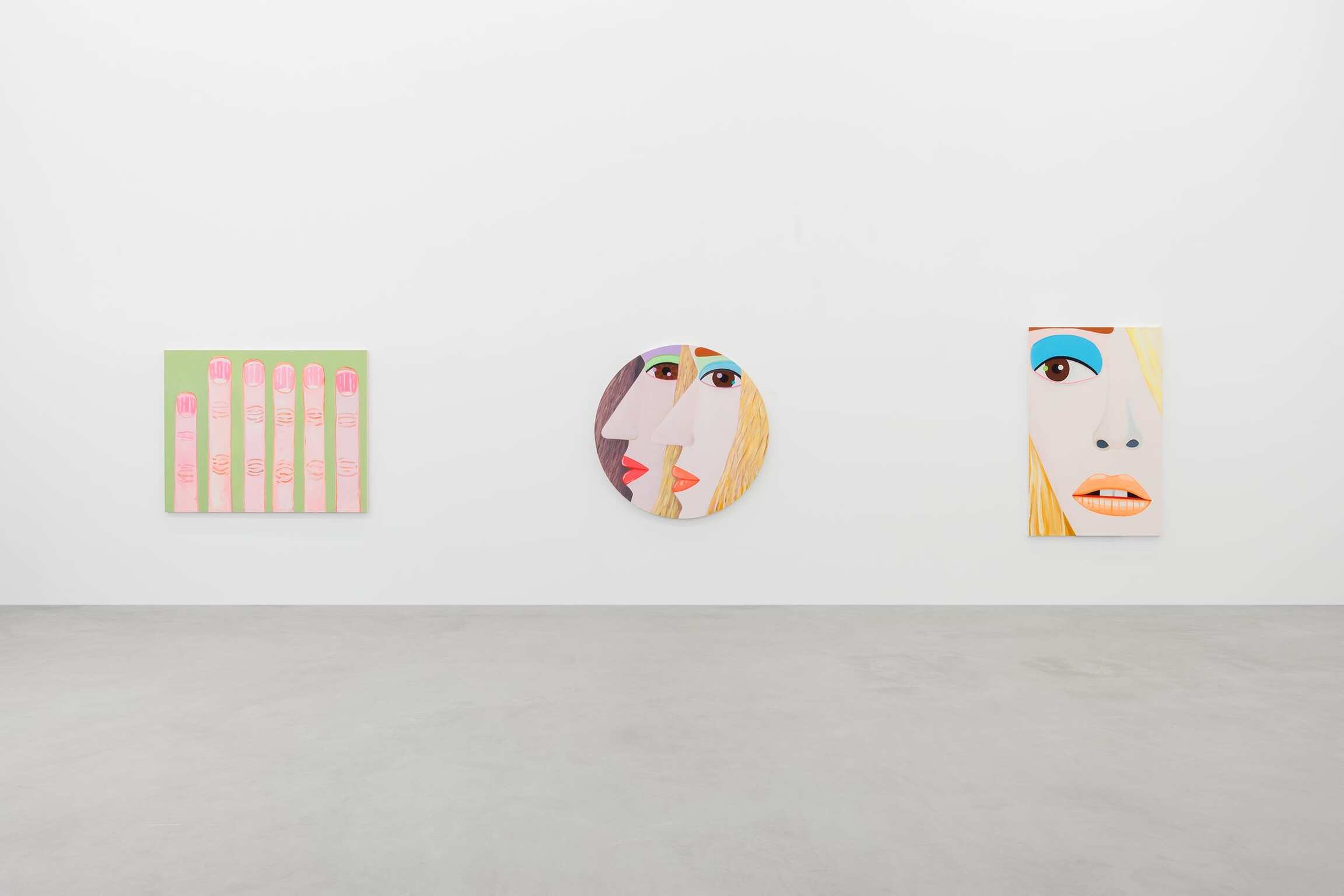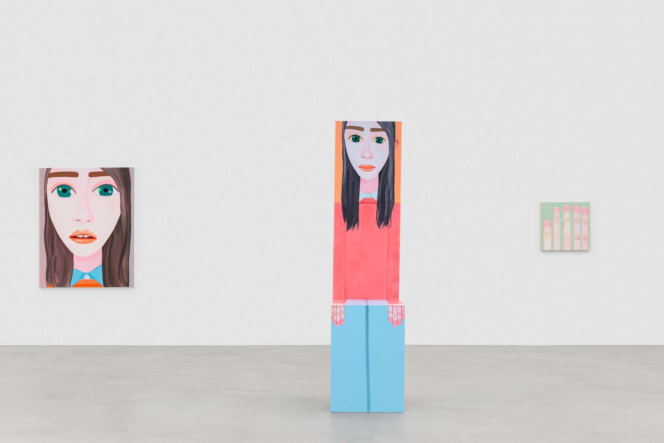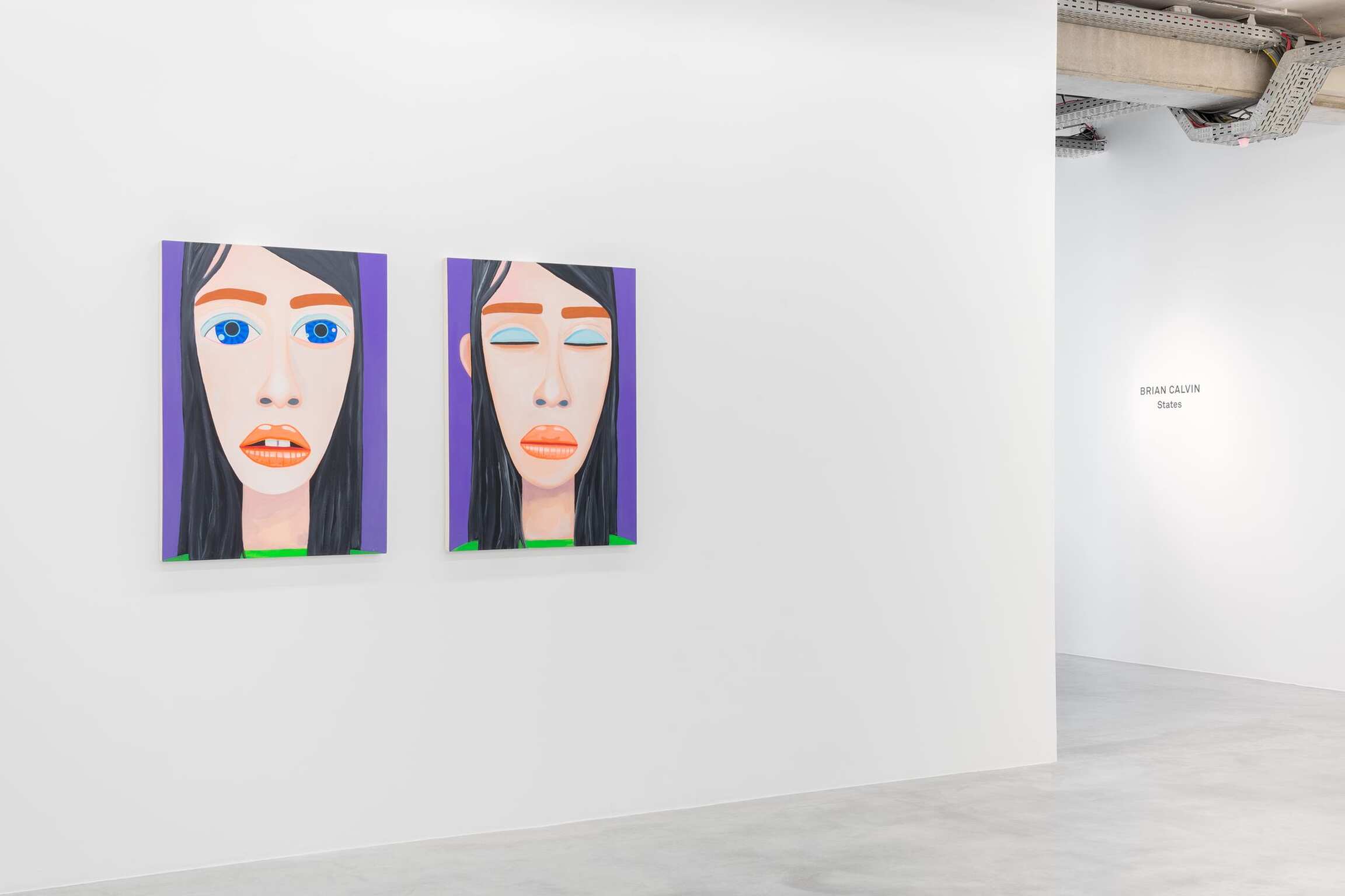 Mais qu’observe-t-on ? Beaucoup de portraits en gros-plan, des visages, des yeux, des bouches et des nez sur des fonds en aplat qui accompagnent des expressions placides et des gestuelles de main appuyées. Depuis les années 1990, cet artiste vivant en Californie s’inscrit dans la longue tradition du portrait en histoire de l’art. Brian Calvin ne nie pas une forme d’hommage et reconnaît que sa peinture s’est construite, même si elle le fait moins aujourd’hui, en dialogue avec certains artistes. Qu’ils soient de la Renaissance tel que Giotto, Fra Angelico, Pierro della Francesca, de la période romantique avec William Blake, parmi les modernes que sont Paul Cézanne, Edouard Manet, Henri Matisse, Pablo Picasso jusqu’à Andy Warhol et Alex Katz ou des plasticiens moins reconnus à l’exemple d’Alice Neel, Joan Broan ou Christina Ramberg. Dans la hiérarchie des genres, l’art du portrait seconde la peinture d’histoire mais s’est affiché, au cours des siècles, comme celui qui fascine d’autant plus et interpelle toujours l’œil du regardeur. Pour Brian Calvin demeure une sorte d’interrogation face à cet exercice. « Je vois la peinture d’images comme l’un des efforts humains les plus primitifs, témoignant des cultures les plus anciennes, et j’aime l’idée de faire partie de cette lignée qui semble inséparable de notre nature-même. En réalisant ma peinture, j’explore ma spécificité idiosyncratique par rapport à ces autres récits. » En parallèle, par leurs tons francs volontairement limités à un spectre assez défini et leurs traits qui renvoient à un caractère archétypal, les œuvres conduisent à discerner, dans un second temps, ce que l’artiste travaille réellement.