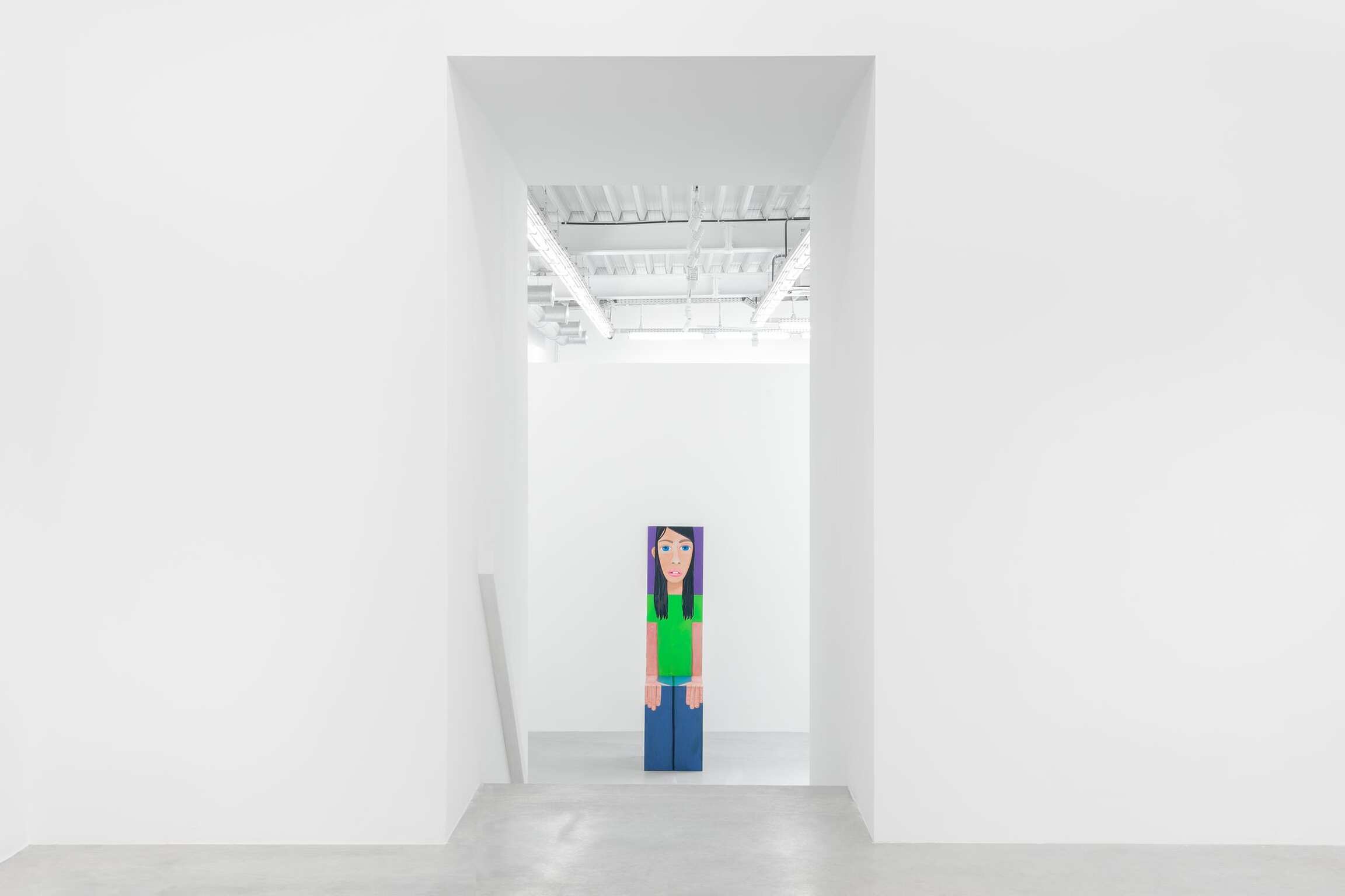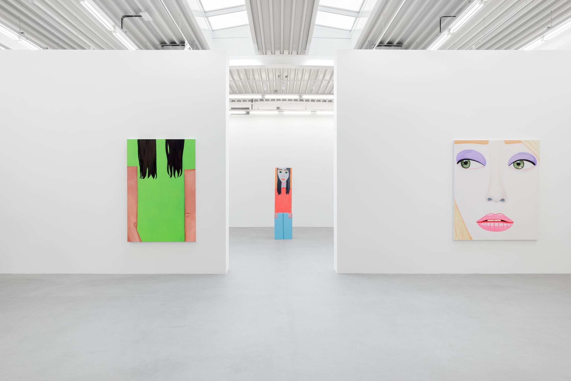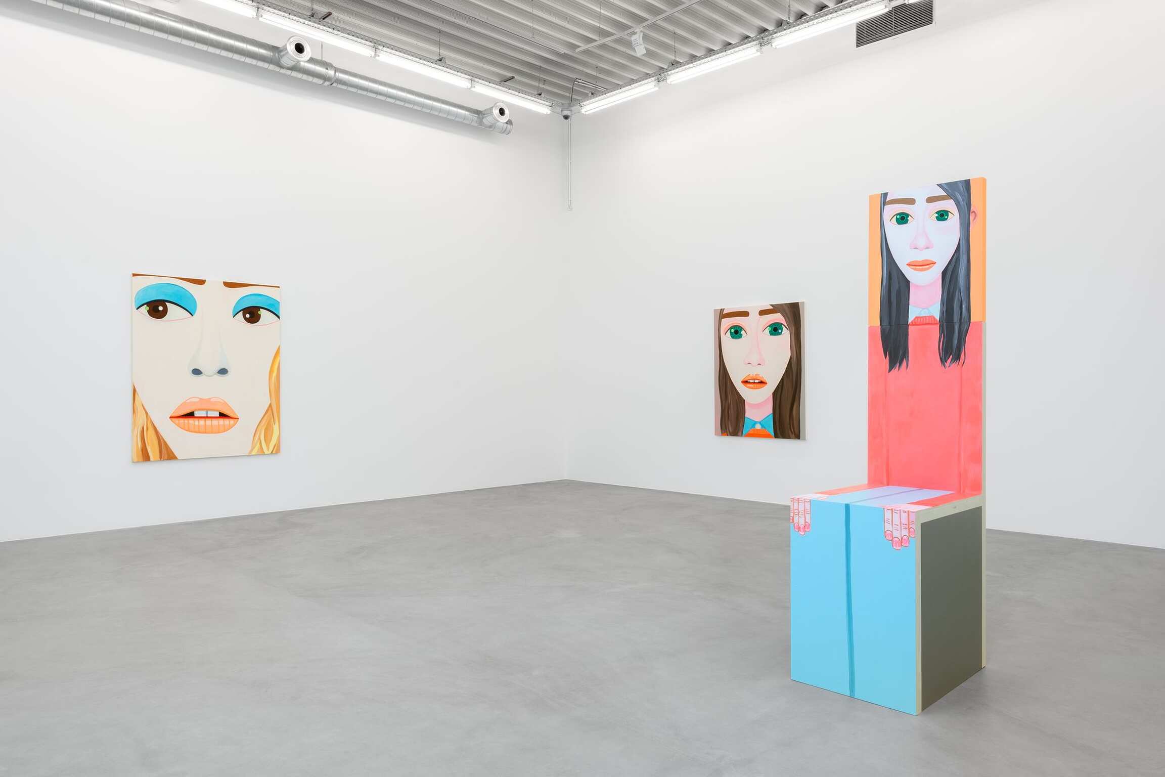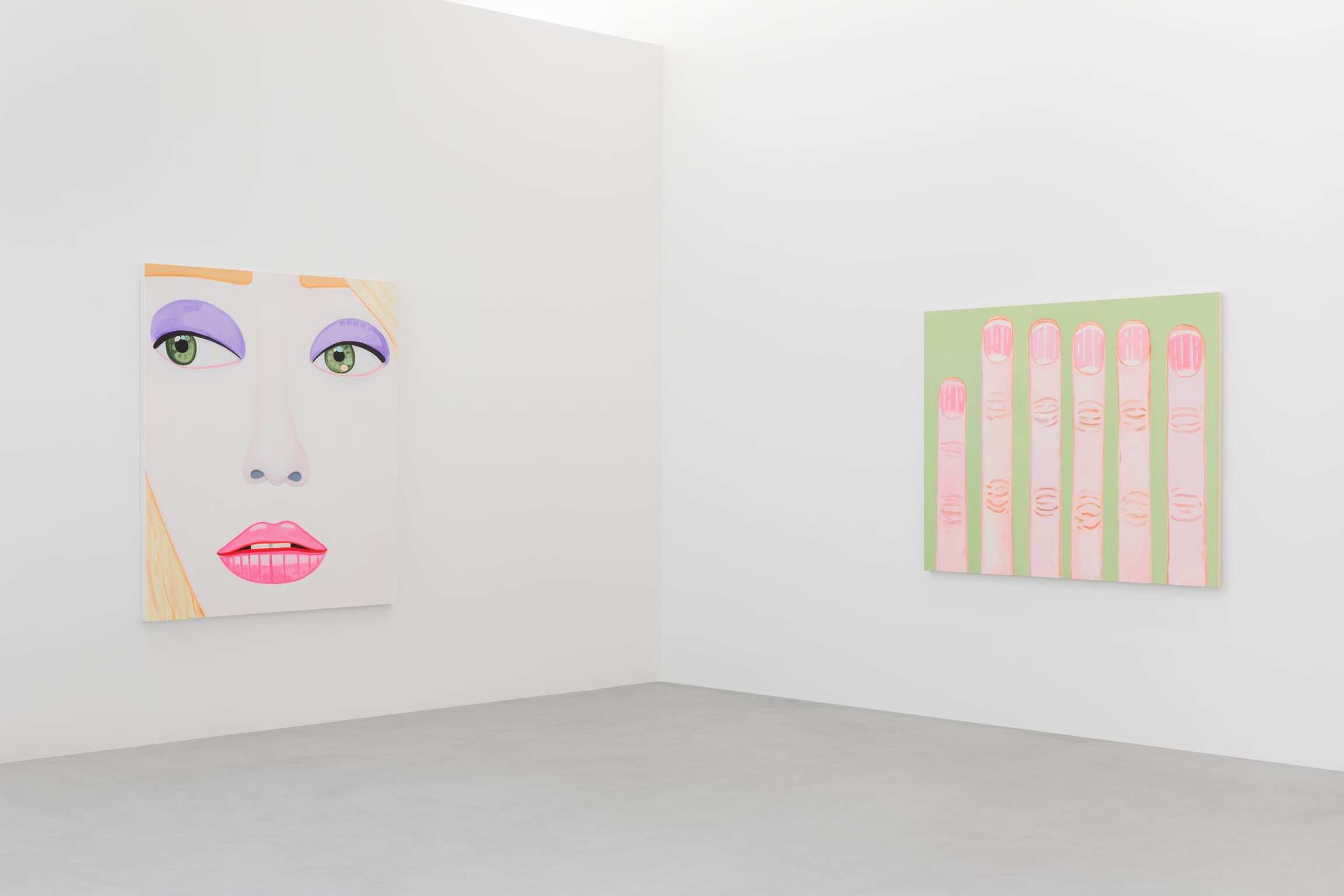Mais qu’observe-t-on ? Beaucoup de portraits en gros-plan, des visages, des yeux, des bouches et des nez sur des fonds en aplat qui accompagnent des expressions placides et des gestuelles de main appuyées. Depuis les années 1990, cet artiste vivant en Californie s’inscrit dans la longue tradition du portrait en histoire de l’art. Brian Calvin ne nie pas une forme d’hommage et reconnaît que sa peinture s’est construite, même si elle le fait moins aujourd’hui, en dialogue avec certains artistes. Qu’ils soient de la Renaissance tel que Giotto, Fra Angelico, Pierro della Francesca, de la période romantique avec William Blake, parmi les modernes que sont Paul Cézanne, Edouard Manet, Henri Matisse, Pablo Picasso jusqu’à Andy Warhol et Alex Katz ou des plasticiens moins reconnus à l’exemple d’Alice Neel, Joan Broan ou Christina Ramberg. Dans la hiérarchie des genres, l’art du portrait seconde la peinture d’histoire mais s’est affiché, au cours des siècles, comme celui qui fascine d’autant plus et interpelle toujours l’œil du regardeur. Pour Brian Calvin demeure une sorte d’interrogation face à cet exercice. « Je vois la peinture d’images comme l’un des efforts humains les plus primitifs, témoignant des cultures les plus anciennes, et j’aime l’idée de faire partie de cette lignée qui semble inséparable de notre nature-même. En réalisant ma peinture, j’explore ma spécificité idiosyncratique par rapport à ces autres récits. » En parallèle, par leurs tons francs volontairement limités à un spectre assez défini et leurs traits qui renvoient à un caractère archétypal, les œuvres conduisent à discerner, dans un second temps, ce que l’artiste travaille réellement.