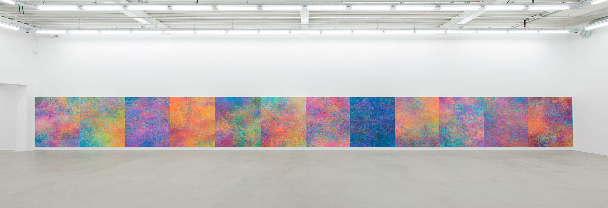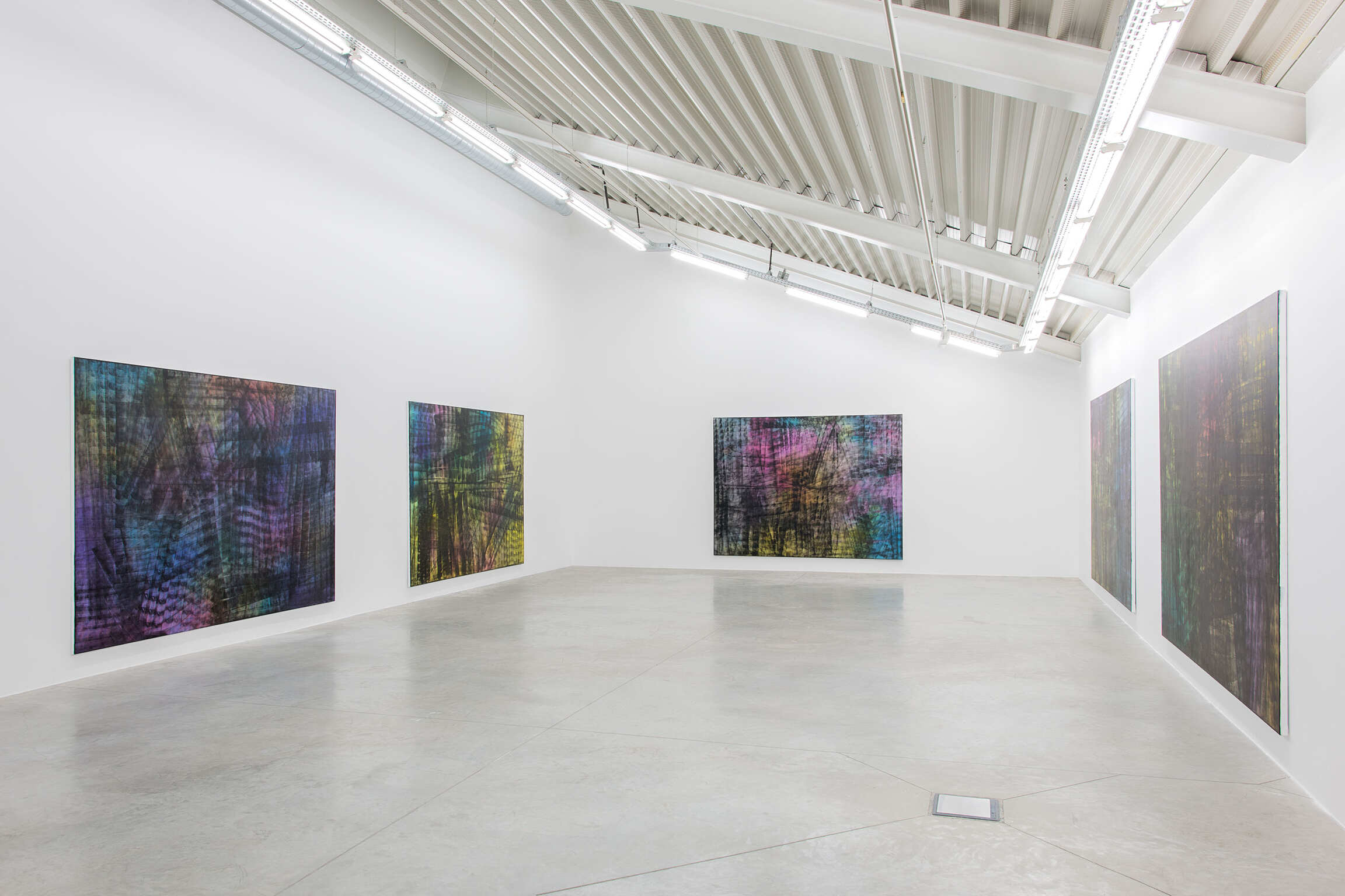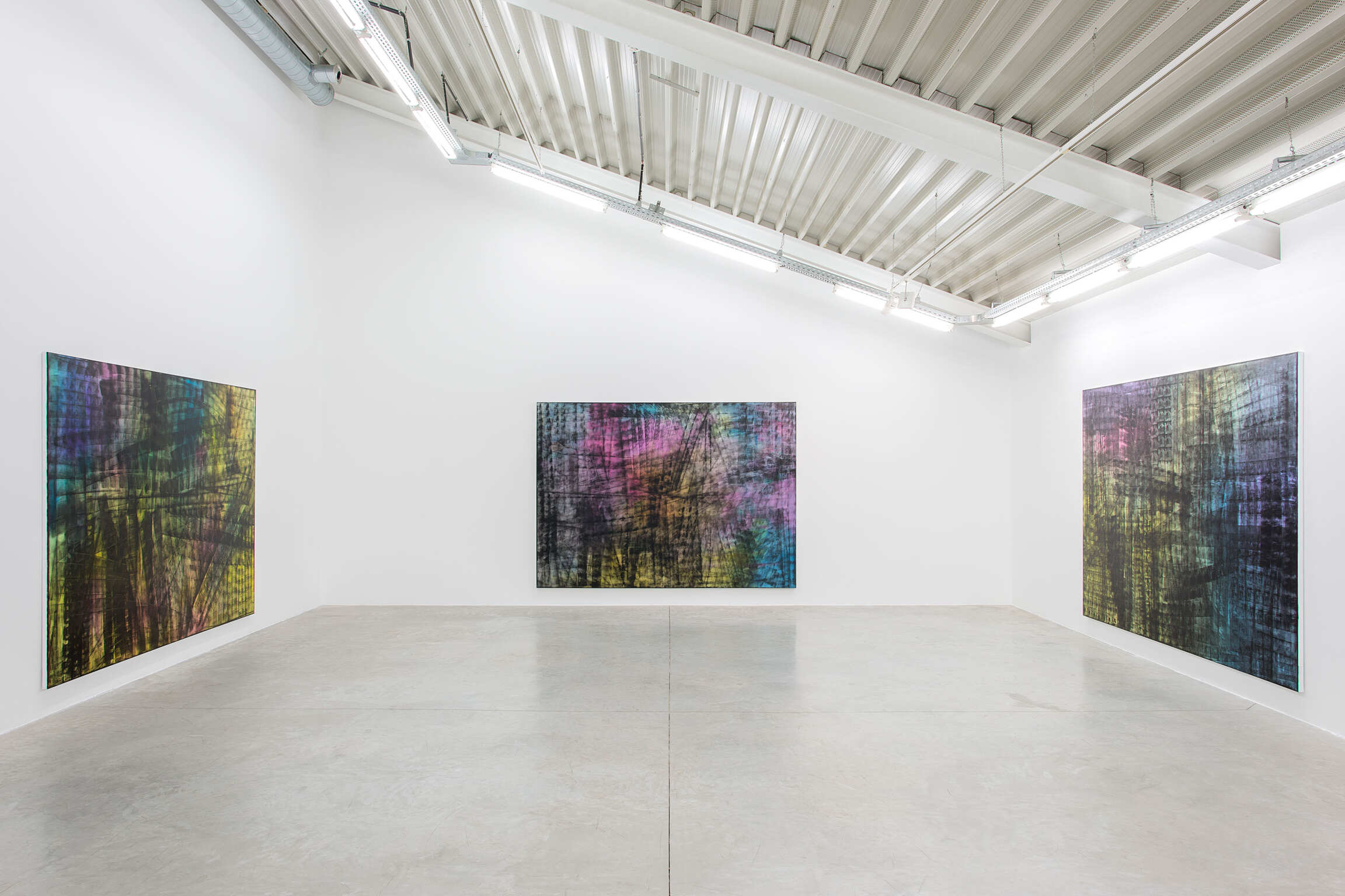 Ainsi, dans la nouvelle série d'œuvres présentées dans cette exposition aux côtés des Fugues, Bernadet peint d’abord un fond constitué d’aplats et de dégradés de couleur, comme lorsqu'il commence les Fugues, puis utilise un rouleau pour étaler de la peinture noire en bandes linéaires traversant toute la surface du tableau. La surface est fragmentée en facettes, ce qui révèle mais aussi oblitère les explosions de couleurs atmosphériques emblématiques de Bernadet, gênant notre vision à percevoir facilement ce qui semble exister derrière ces marques noires rendues de façon mécanique; tout en montrant comment peut évoluer le travail de Bernadet, par expansion et révision simultanées.
