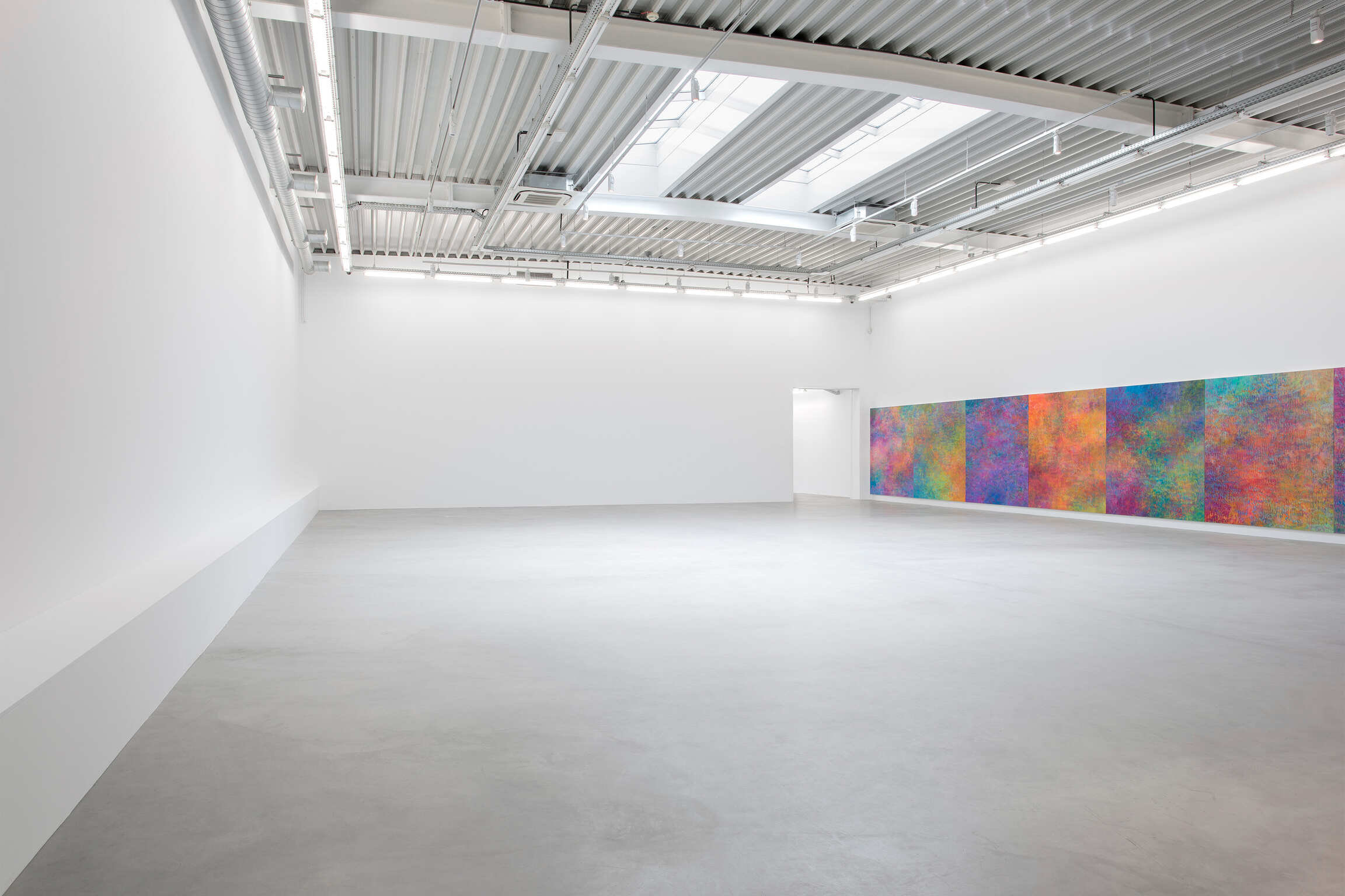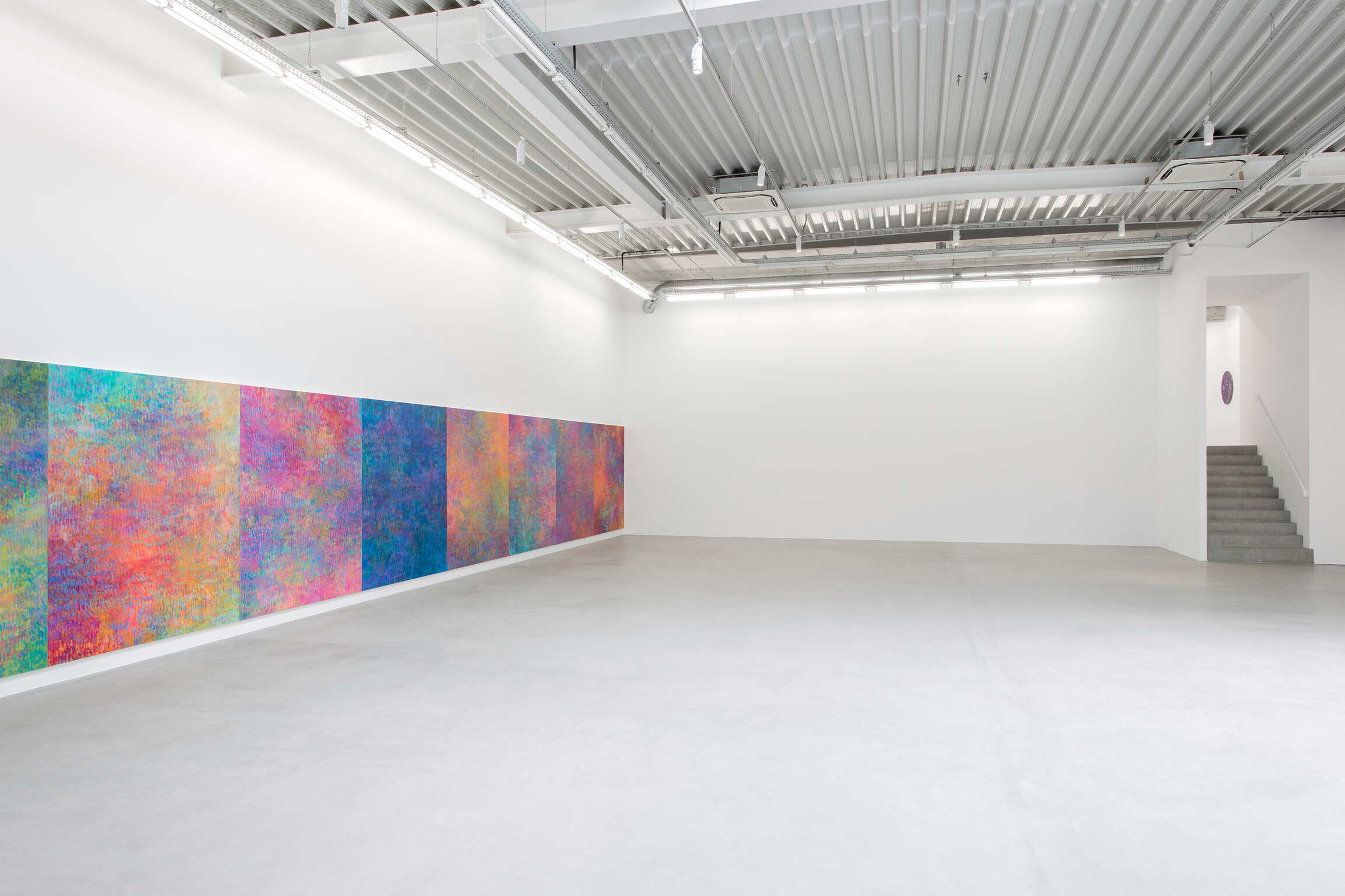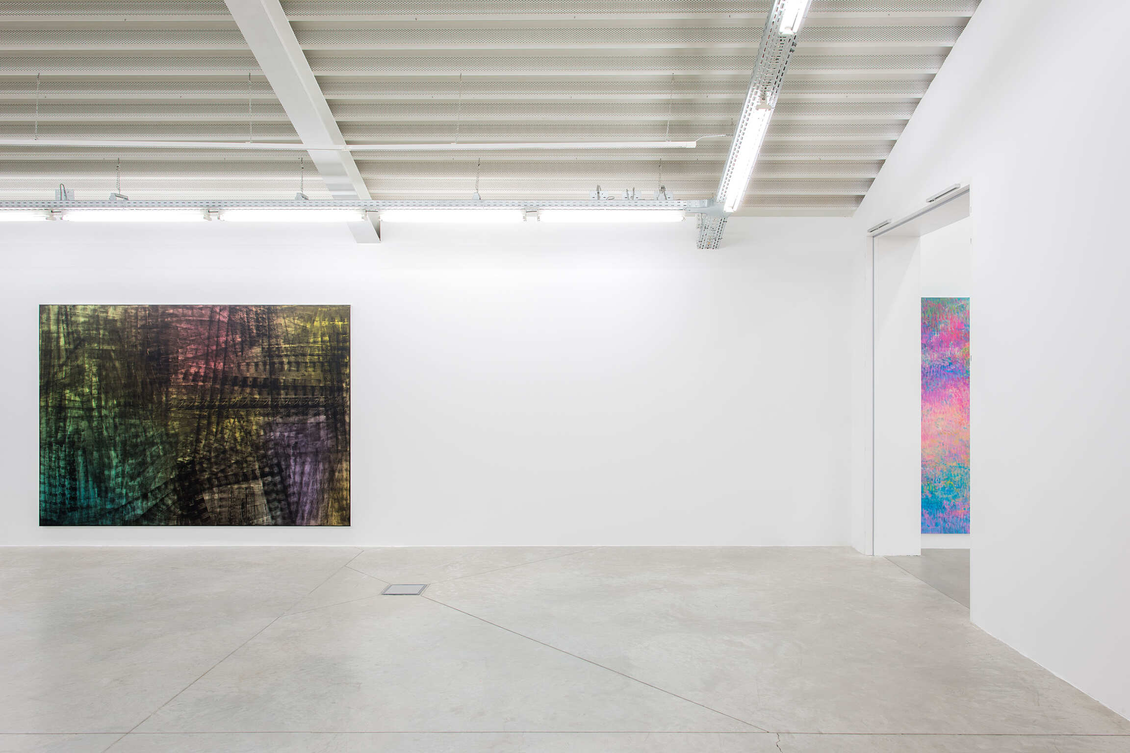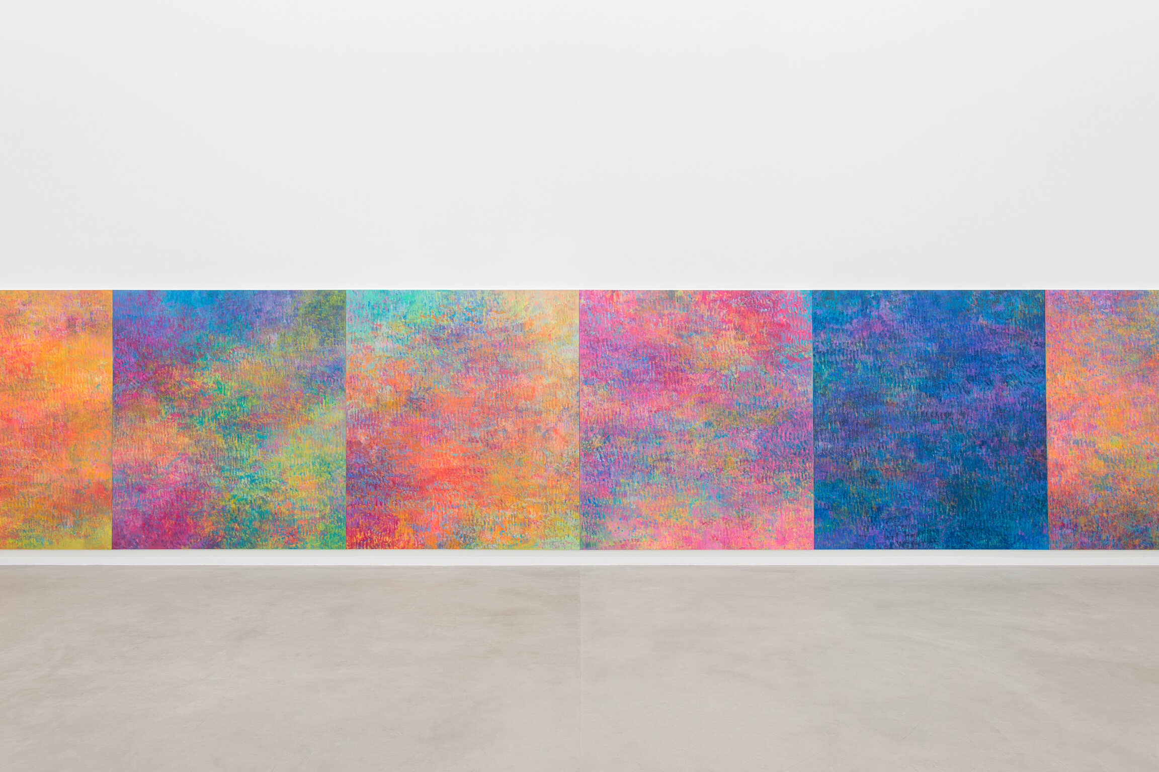 Ainsi, dans la nouvelle série d'œuvres présentées dans cette exposition aux côtés des Fugues, Bernadet peint d’abord un fond constitué d’aplats et de dégradés de couleur, comme lorsqu'il commence les Fugues, puis utilise un rouleau pour étaler de la peinture noire en bandes linéaires traversant toute la surface du tableau. La surface est fragmentée en facettes, ce qui révèle mais aussi oblitère les explosions de couleurs atmosphériques emblématiques de Bernadet, gênant notre vision à percevoir facilement ce qui semble exister derrière ces marques noires rendues de façon mécanique; tout en montrant comment peut évoluer le travail de Bernadet, par expansion et révision simultanées.