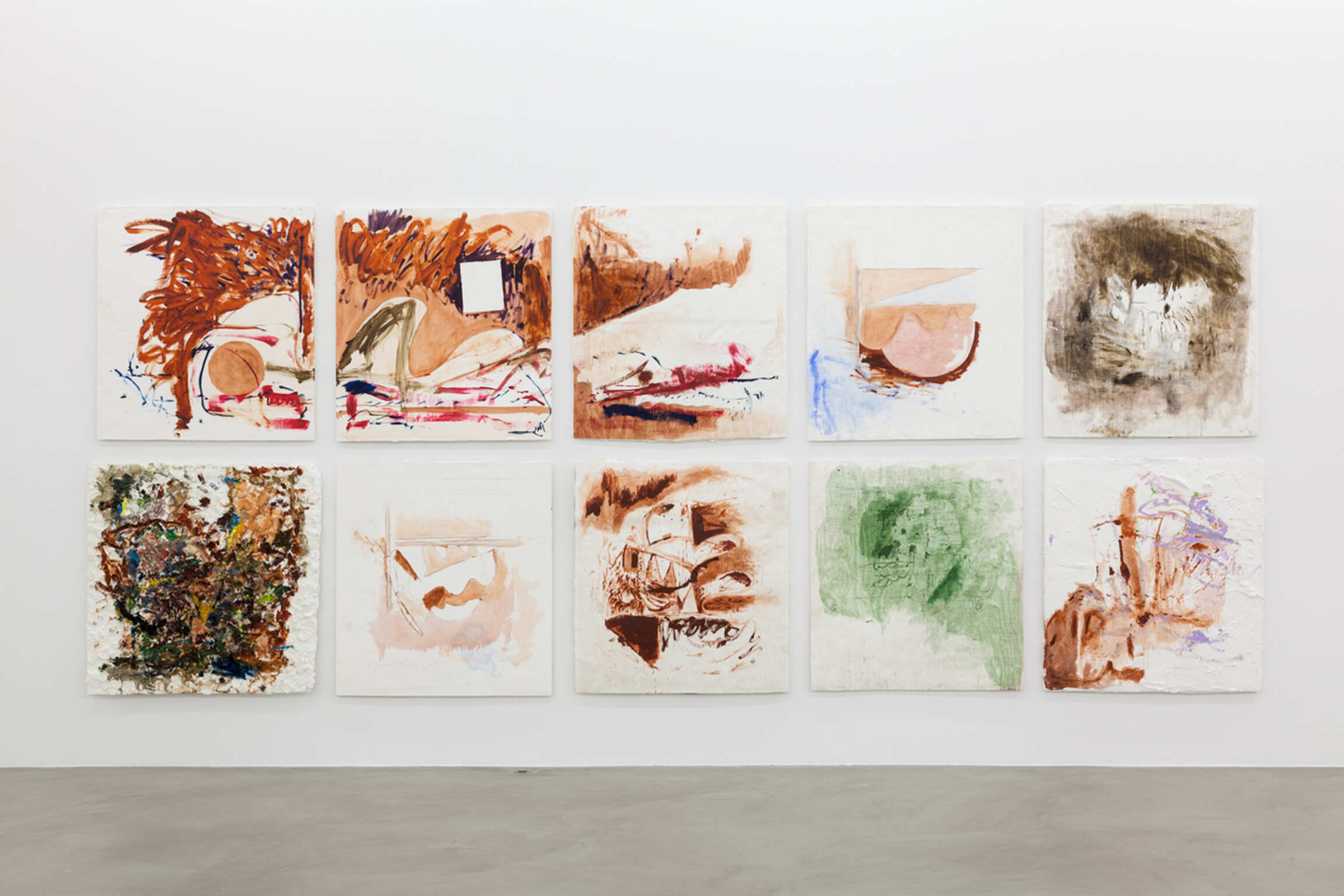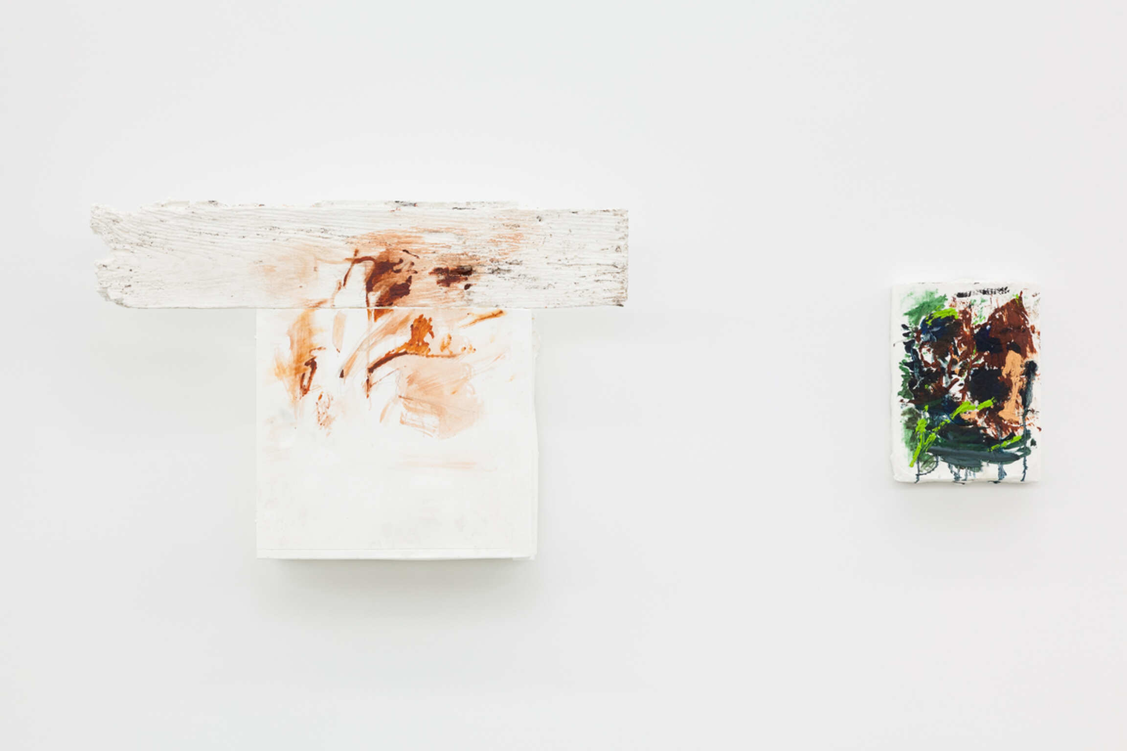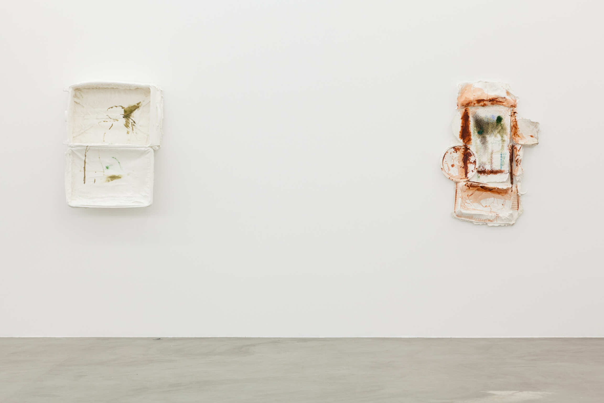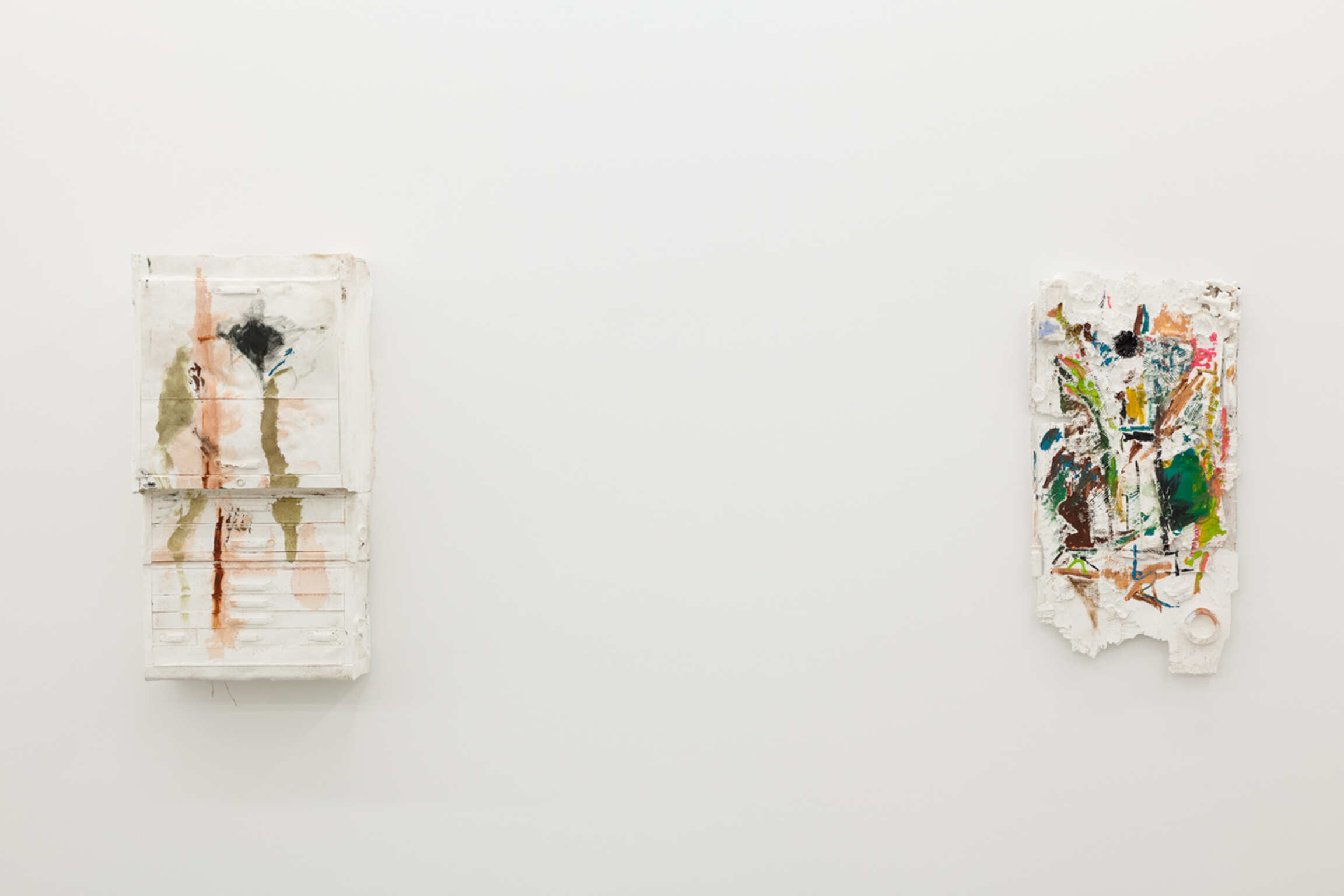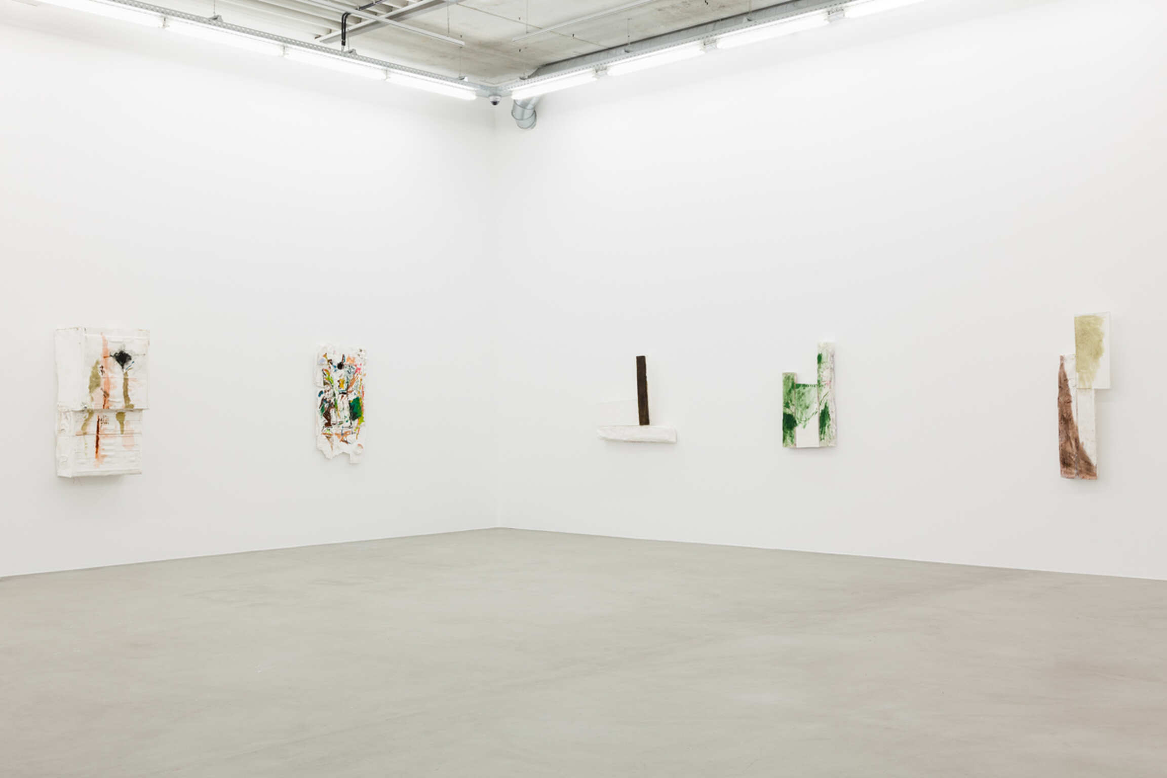 Deze nieuwe serie schilderijen is een uitbreiding op Collins verkenning van de status en de context van de schilderkunstige handeling. In elk van deze schilderijen wordt het conventionele opgespannen doek verdrongen door gipsen afgietsels van een veelheid van objecten – schroevendraaiers, kasten, paraplu's, pakketten ondergoed – die een eenvormige samenhang ontkennen. Het mysterie van de inclusie van deze geesten van parafernalia gaat in tegen de voorrang en het aanzien die meestal in de schilderkunstige handeling geboden wordt. Het schilderen, echter, blijft ook hier aanwezig, en wordt op een nieuwe manier inhoud gegeven: het wordt gedwongen de strijd om prominentie aan te gaan met de veelheid aan ondersteunende spullen. De gebrande sienna en groene verf refereren terloops naar de stijlfiguren van het abstract expressionisme, zonder echter in totemische strakheid te vervallen. Het gaat over de aarde tegenover de grond en de bloem die eruit voortkomt.