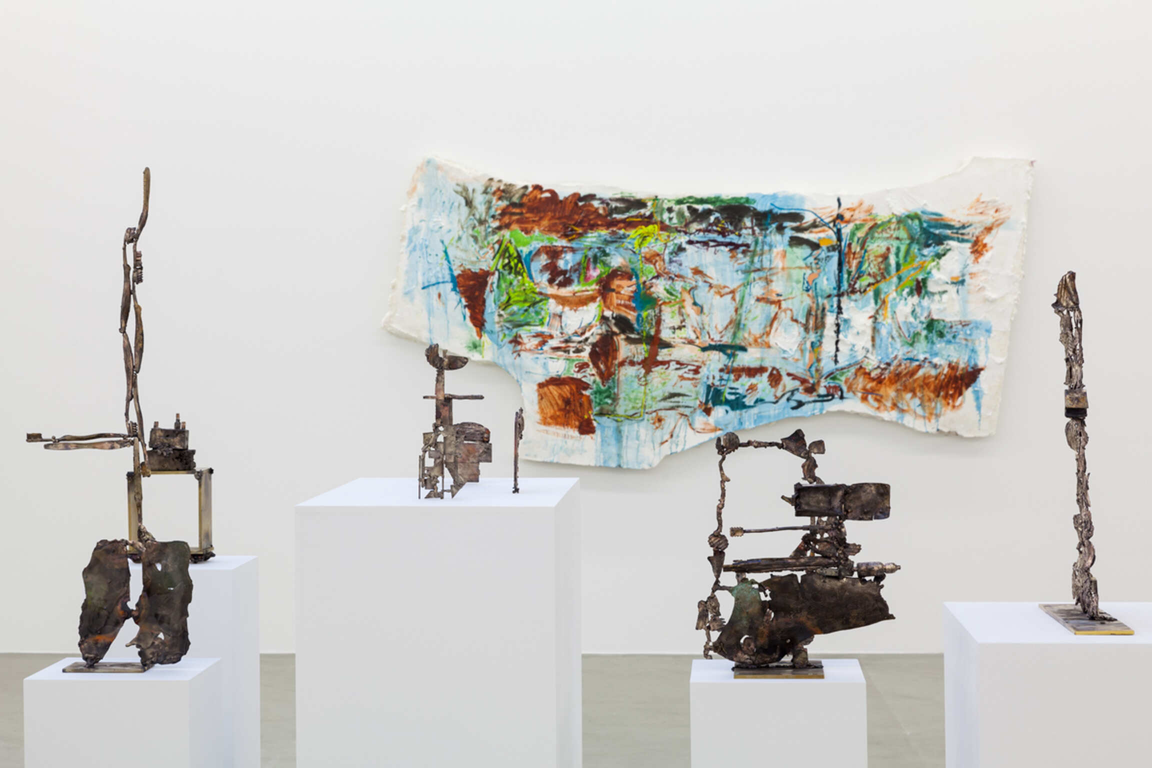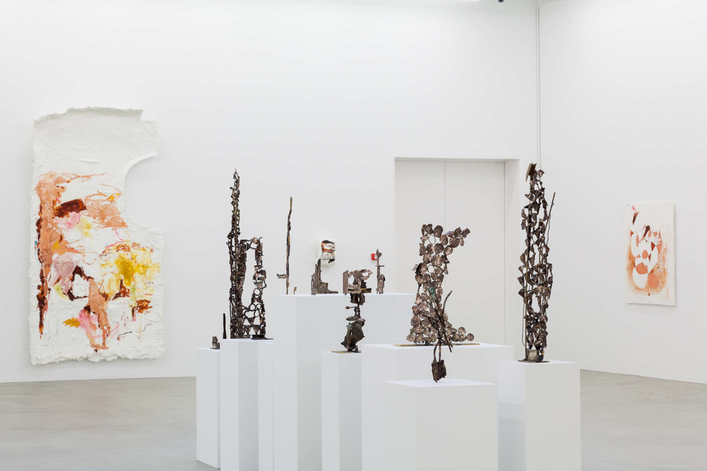 De beelden in deze tentoonstelling onderzoeken gelijkaardige thema’s met verschillende middelen. De sculpturen, onwaarschijnlijk rechtopstaande bronzen afgietsels van tortillachips, tandenborstels, haarbanden – een veelheid omhoog gegooide kanten rommel –tarten elk dimensionaal imperatief, als elegante maaksels ontstaan uit het prille instinct om te stapelen en uit ons vermogen om op te staan te bewijzen.