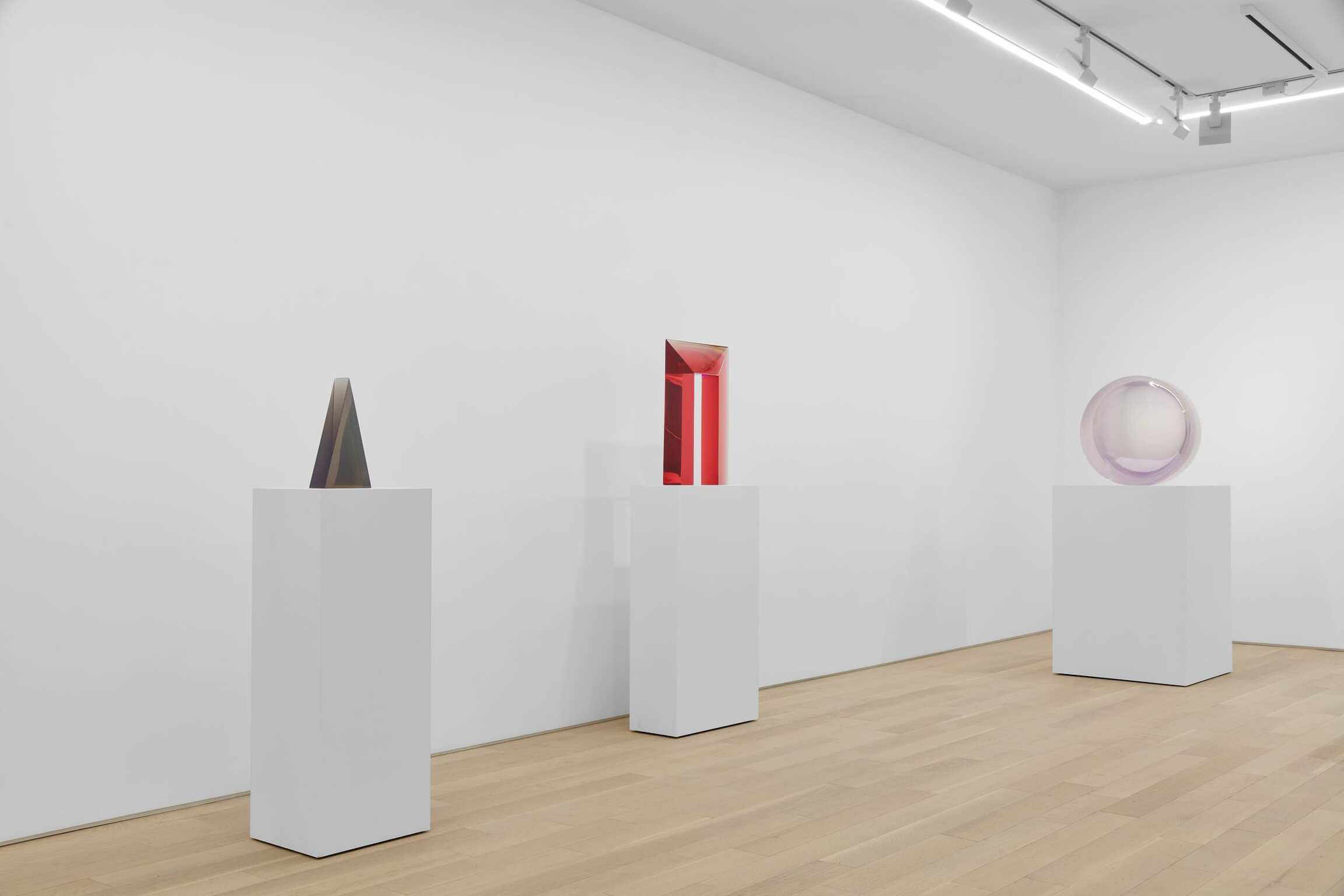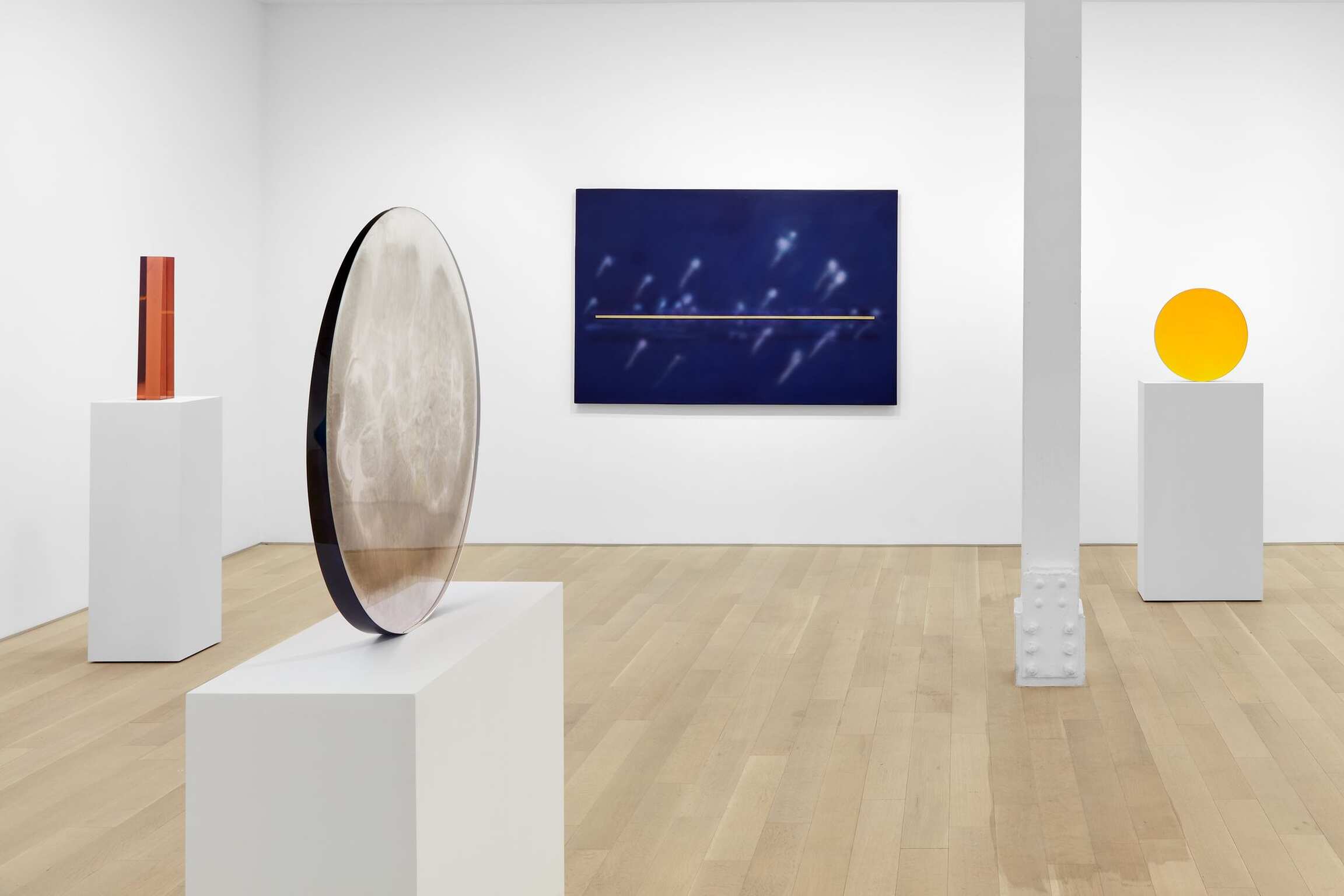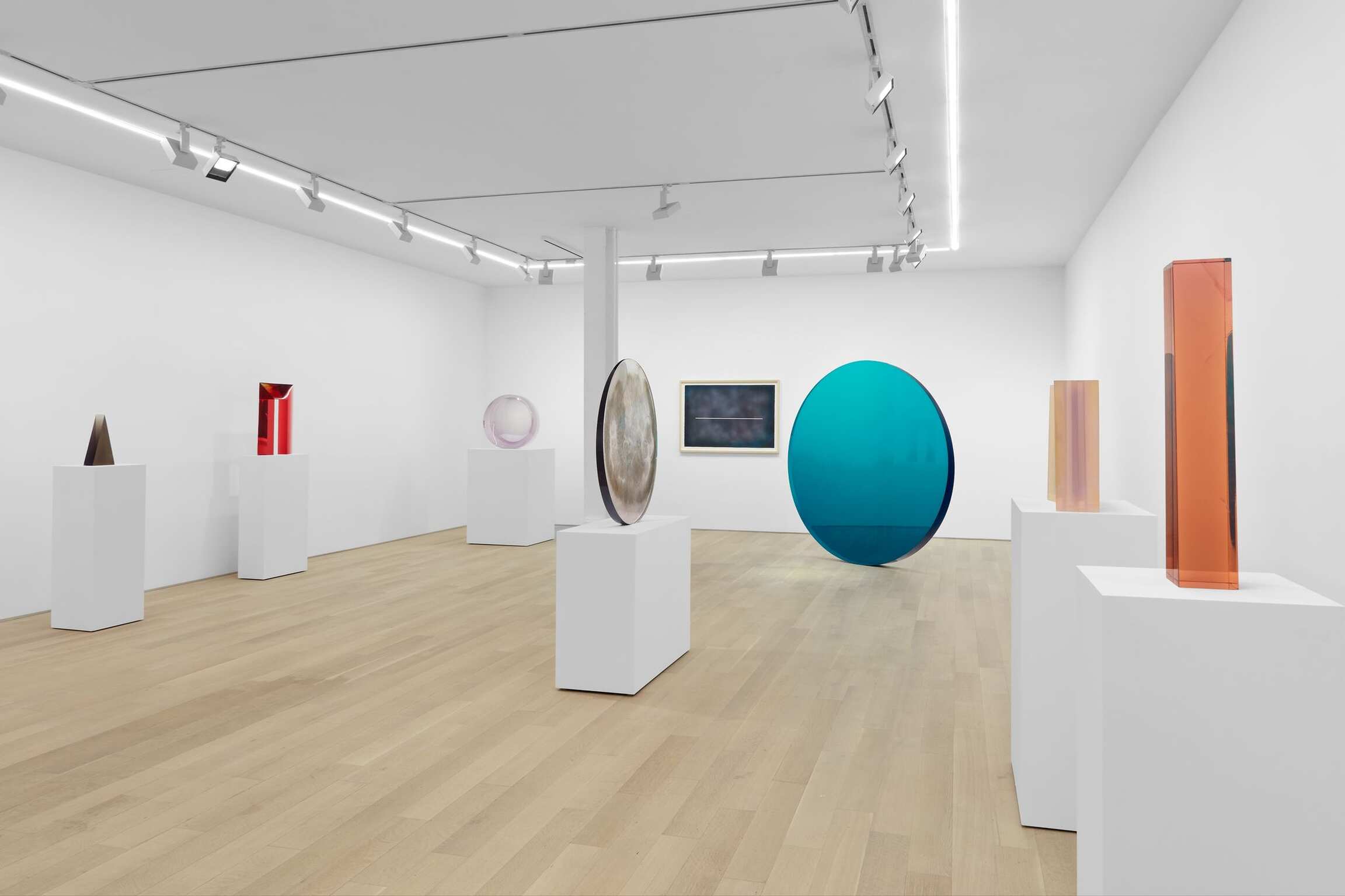 Valentine has been working through a fairly contained vocabulary of geometric shapes and volumes (discs, trapezoidal volumes, pyramidical or rhombus-shaped stelae). These stelae made out of translucent, at times hazy-looking resin, differed considerably from the geometric vocabulary developed by minimalist artists during the same years in New York. While the latter group focused on questions of objecthood, immediacy, and conceptual clarity, Valentine and the Light and Space artists forged a new language, inextricably tied to a harmonious reflection that drew upon the visual spectrum produced by the West Coast climes: sun and clouds, fog and clarity, ocean and sand.