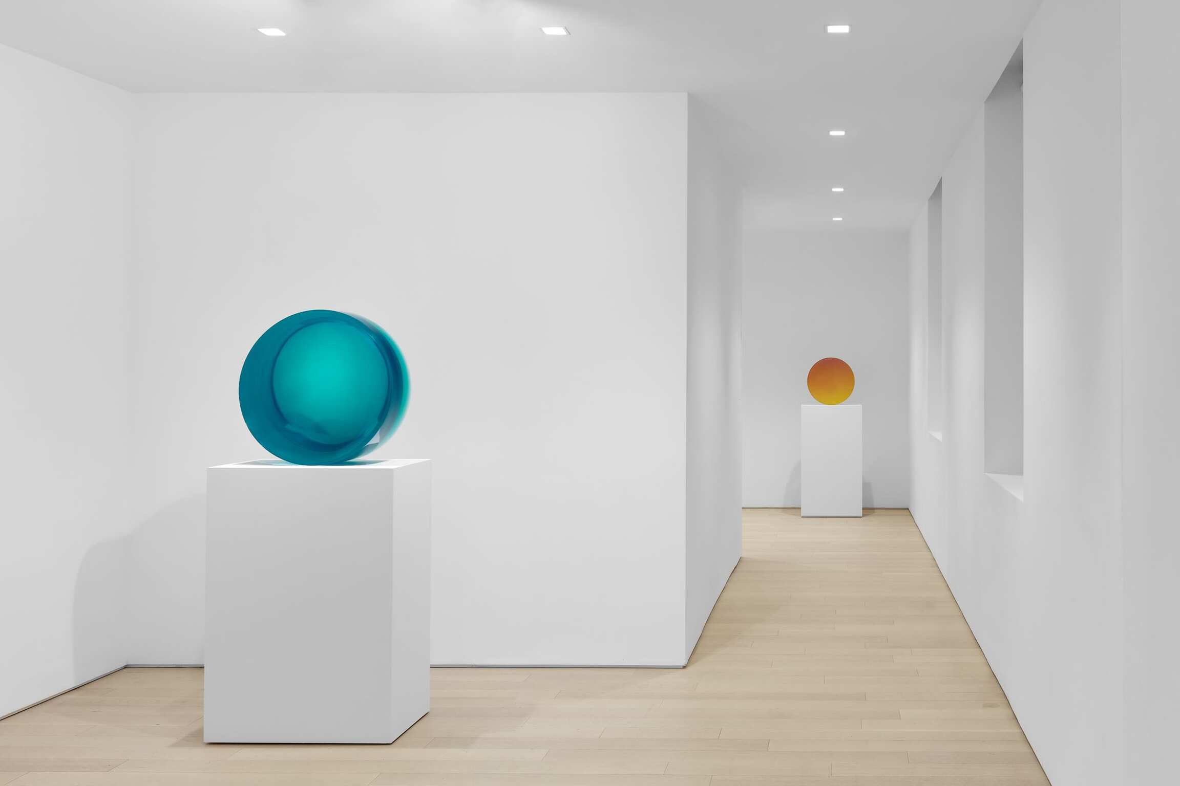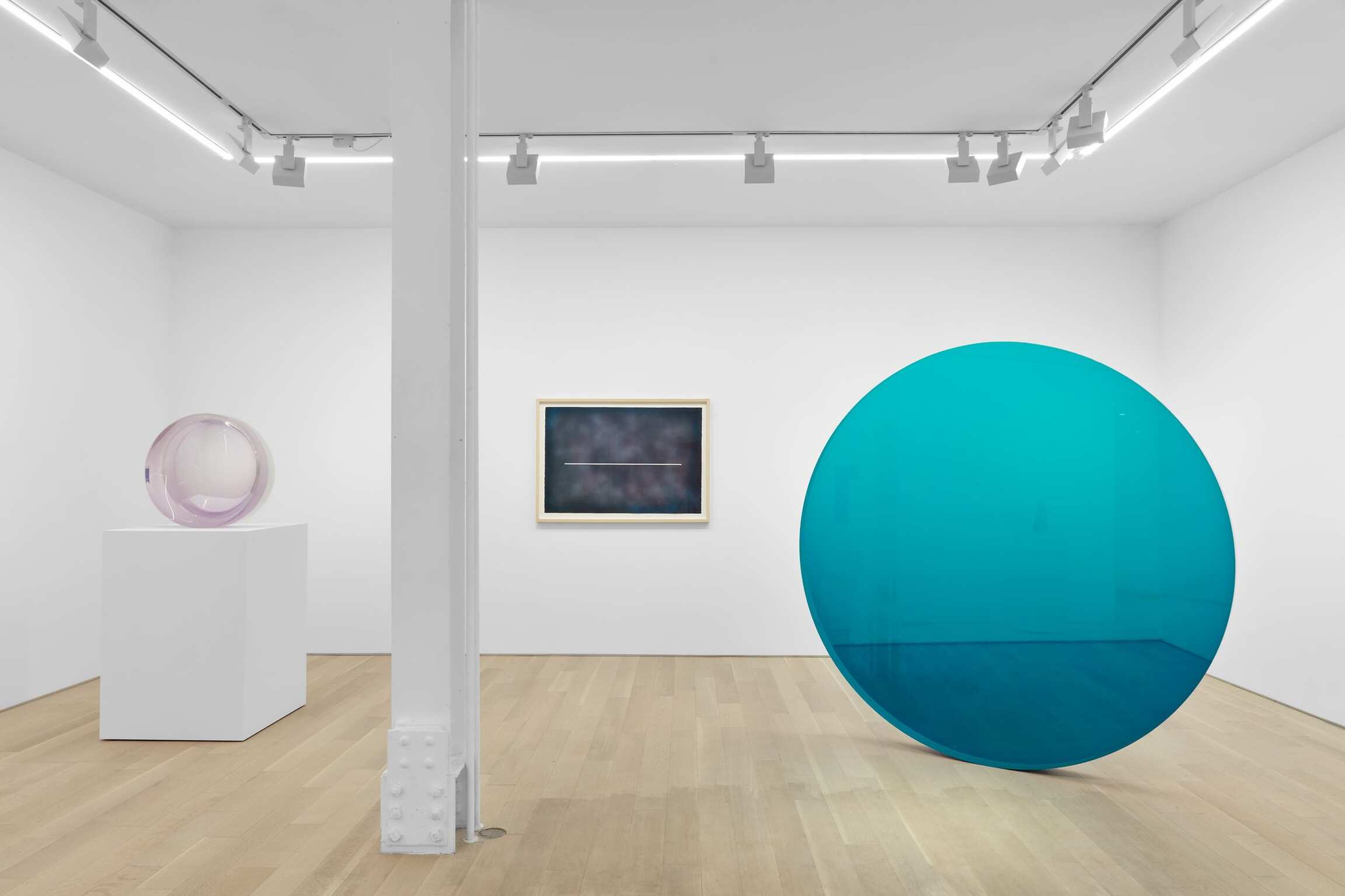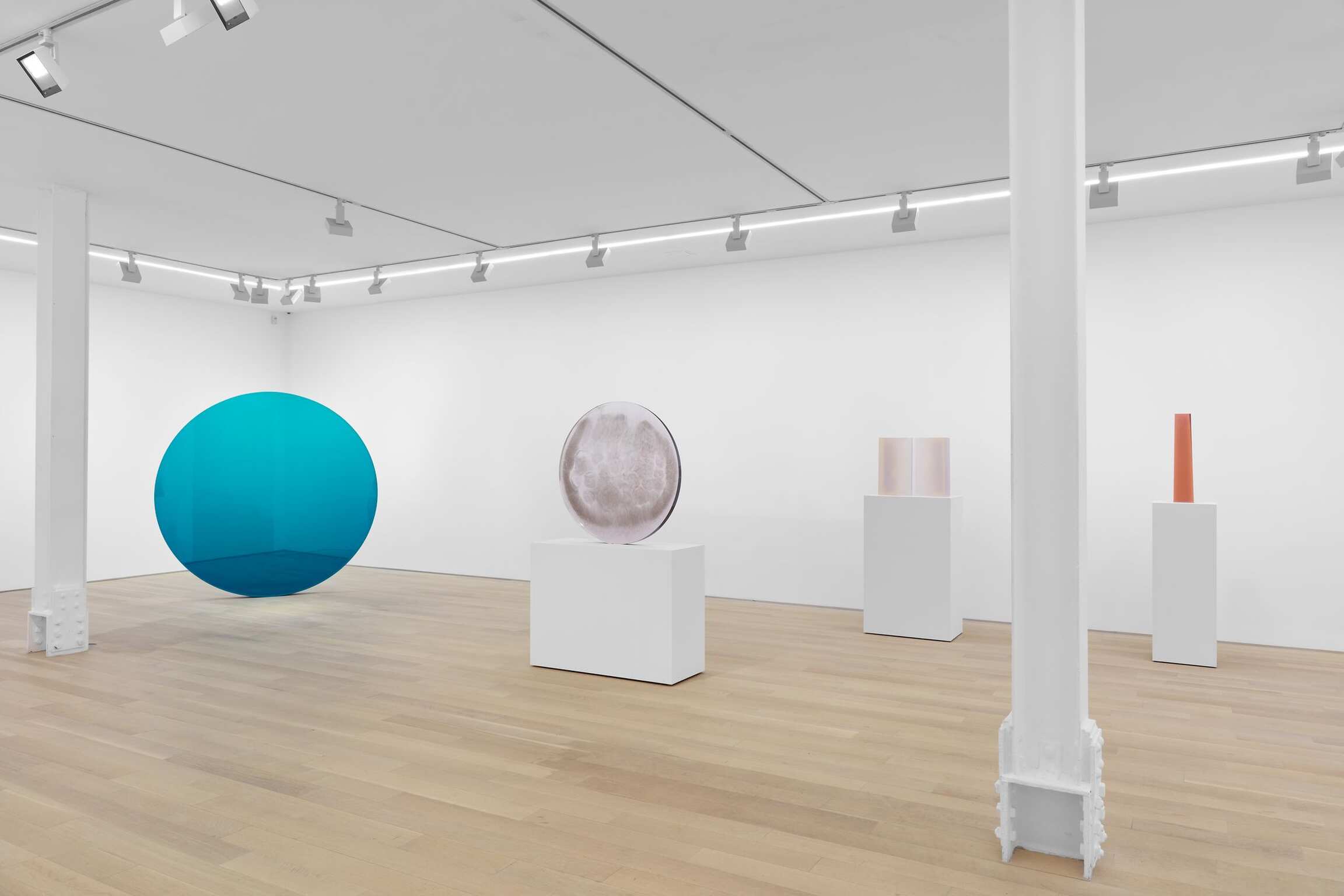 Valentine has been working through a fairly contained vocabulary of geometric shapes and volumes (discs, trapezoidal volumes, pyramidical or rhombus-shaped stelae). These stelae made out of translucent, at times hazy-looking resin, differed considerably from the geometric vocabulary developed by minimalist artists during the same years in New York. While the latter group focused on questions of objecthood, immediacy, and conceptual clarity, Valentine and the Light and Space artists forged a new language, inextricably tied to a harmonious reflection that drew upon the visual spectrum produced by the West Coast climes: sun and clouds, fog and clarity, ocean and sand.