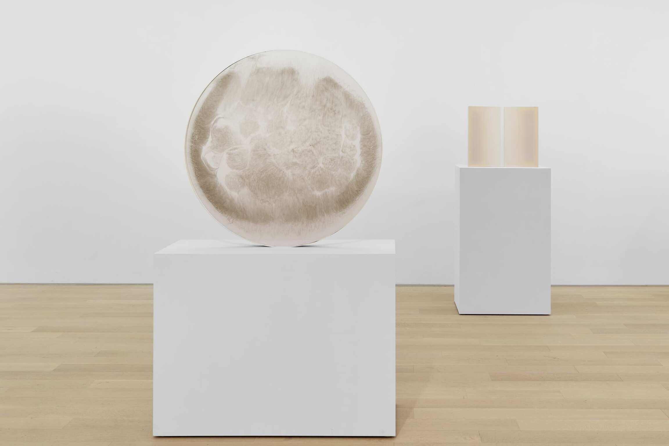 In his own inimitable voice, Valentine is fond of emphasizing what these works are about: “I always wanted a big magic saw I could cut up big hunks of L.A. smog or hunks of ocean and say: ‘Look at this!’ The polyester was the only way to objectify that love of it.”2 Circle Smoke Grey (1970), presented today, precisely embodies the artist’s vision: it appears to have trapped in resin “a hunk of L.A. smog”—a transliteration of the dense and complex Californian atmosphere into a clear, translucent sculptural form.