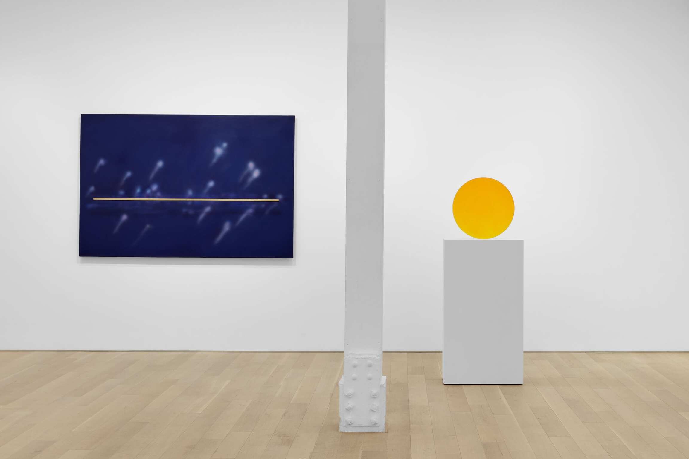 Even though other artists (Robert Irwin, Helen Pashgian, and others) have shared in this fascination for the disk as an artistic form, in various iterations, Valentine pioneered the invention of a free-standing concave disk, and, through his own patented invention of a new genre of synthetic resin, was able to endow these disks (his “big circles”) with unforeseeable dimensions. The exhibition at Almine Rech presents us with a rare opportunity to view and discover the diverse and rich spectrum of Valentine’s artistic practice. It is rare to be able to see a selection of sculptures together with his paintings (a lesser known facet of his practice); yet, for Valentine, both constitute two sides of the same coin. His pictorial practice, with a different medium, and on a two-dimensional format, also aim at capturing the magical alluring aspects of the qualities of the atmosphere in the Pacific. Indeed, some of his most extraordinary paintings were executed in Hawaii and display an almost gem-like quality. In fact, referencing jewelry with respect to Valentine’s paintings is no mere metaphor. Often proudly referring to one of his ancestors who was a gold miner in Colorado during the Gold Rush, Valentine discussed in a recent conversation his own fascination for gold. Valentine’s fascination for gold and gems goes along with his long-held admiration for medieval manuscript illumination. In an analogous way, he resorted to applying pure gold leaves on his canvas before applying the rich layers of bright blue and purple pigments. Valentine’s painting Purple Illuminated Skyline (1998) clearly carries a clear allegiance to the medieval genre of illuminations, also executed through a careful application of gold leaves on parchment. The scene depicted in the illustration below shows a distribution of gifts during New Year’s Eve. This is one of the sumptuous pages in the Très riches heures du Duc de Berry, by the Limbourg brothers. A couple of features directly relevant to Valentine’s own painting: the application of fine gold leaves on the surface, of course, but also the choice of a particularly rich blue/purplish pigment used to depict the firmament—the firmament also echoing Valentine’s continued interest in “skylines”: (found in the titles of many of his works). Both works, the Très riches heures, and DeWain Valentine’s paintings are animated with a certain cosmological dimension. These layers of interests and references, unexpected from any artist in the late 20th and early 21st centuries, confer a unique place to Valentine within the art historical world. This exhibition offers a rare opportunity to engage freshly with Valentine’s ever surprising creative practices.