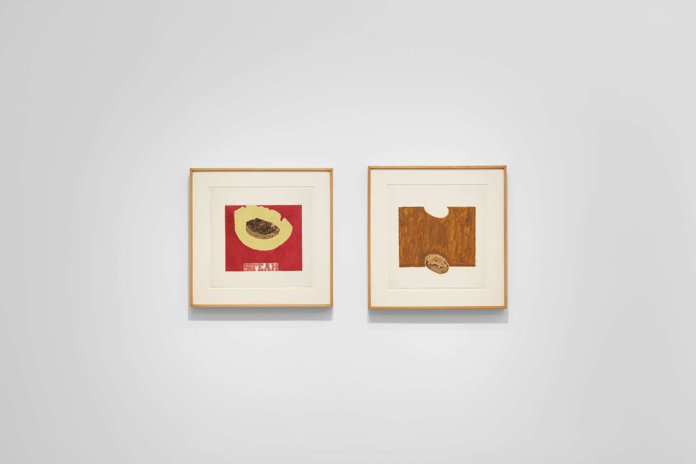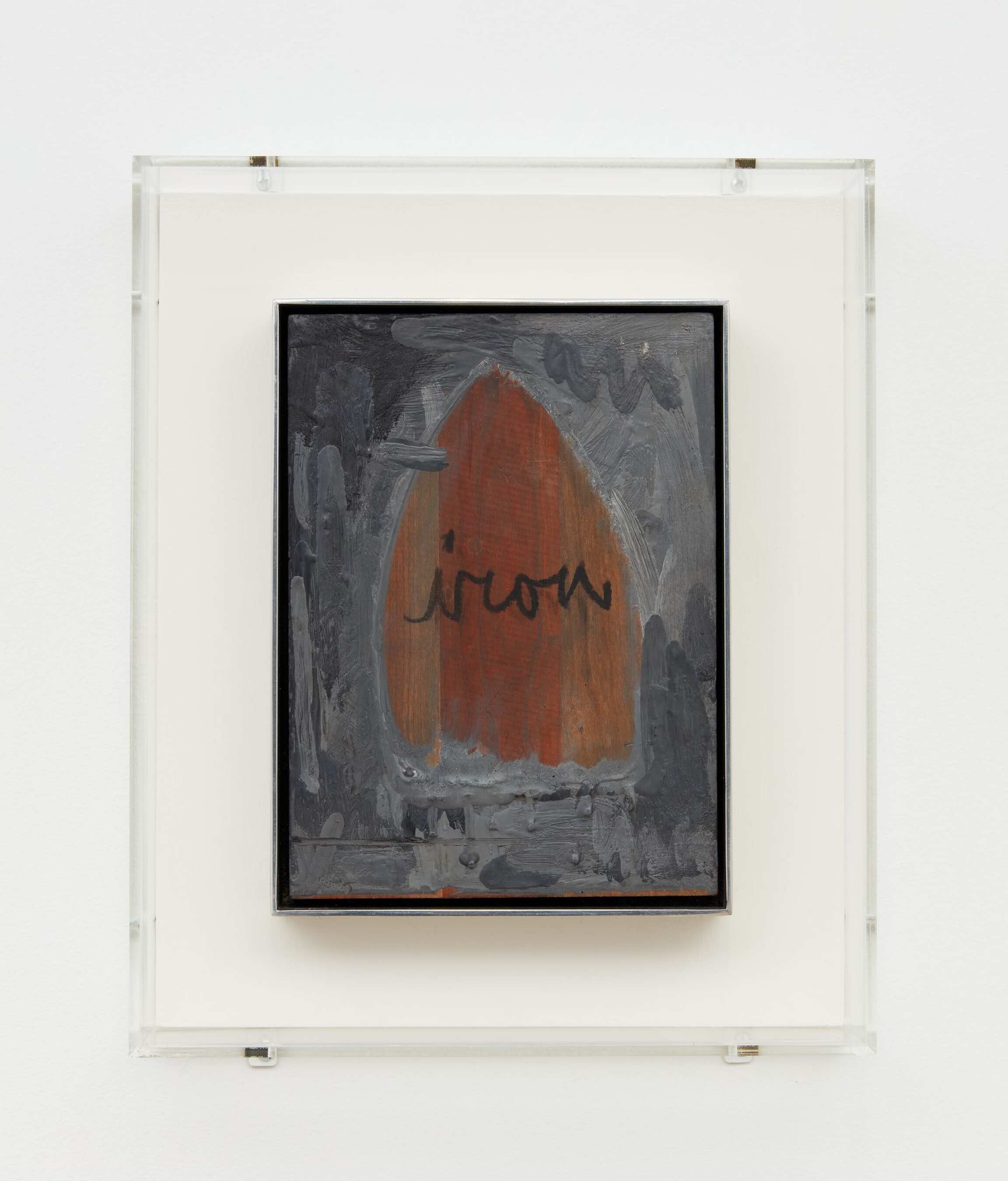After the Second World War, artists like Jasper Johns, Ed Ruscha, and Joseph Kosuth made words their main subjects and resources, as Ruscha explains: “I just happened to paint words like someone else flowers.”9 The word "STEAK", in the eponymous work from 1962, thus represents a steak as well as the image of it. In this way, letters, numbers, words, and phrases became artistic motifs, objects, and part of artistic practice. In Johns' 1962 painting Iron, the artist melted away the encaustic paint with an iron and created the depiction and imprint of itself. The added word “iron” in cursive writing, referring both to the substance and the household appliance has a contiguous relationship to the imprint and to the iron itself.
