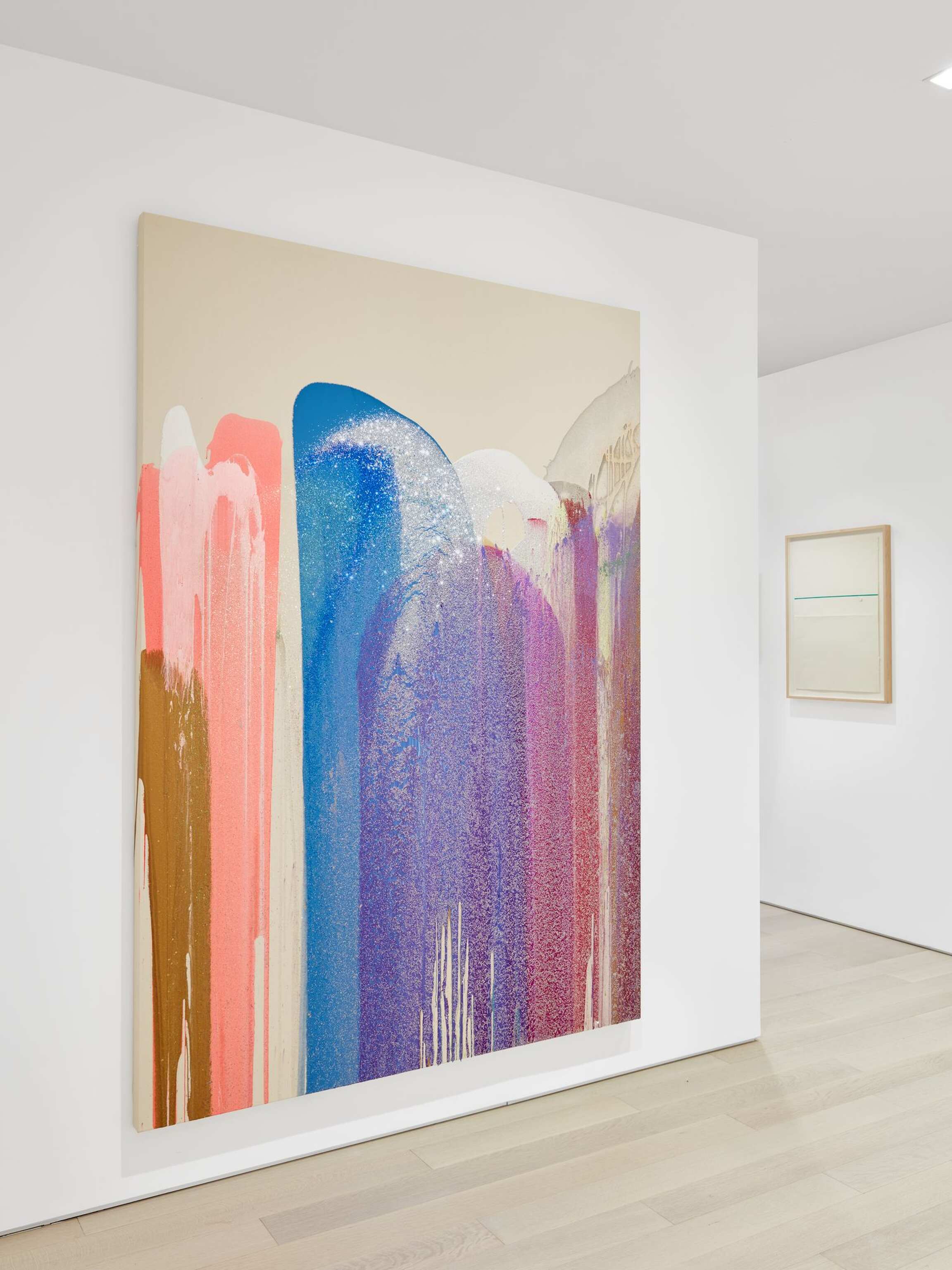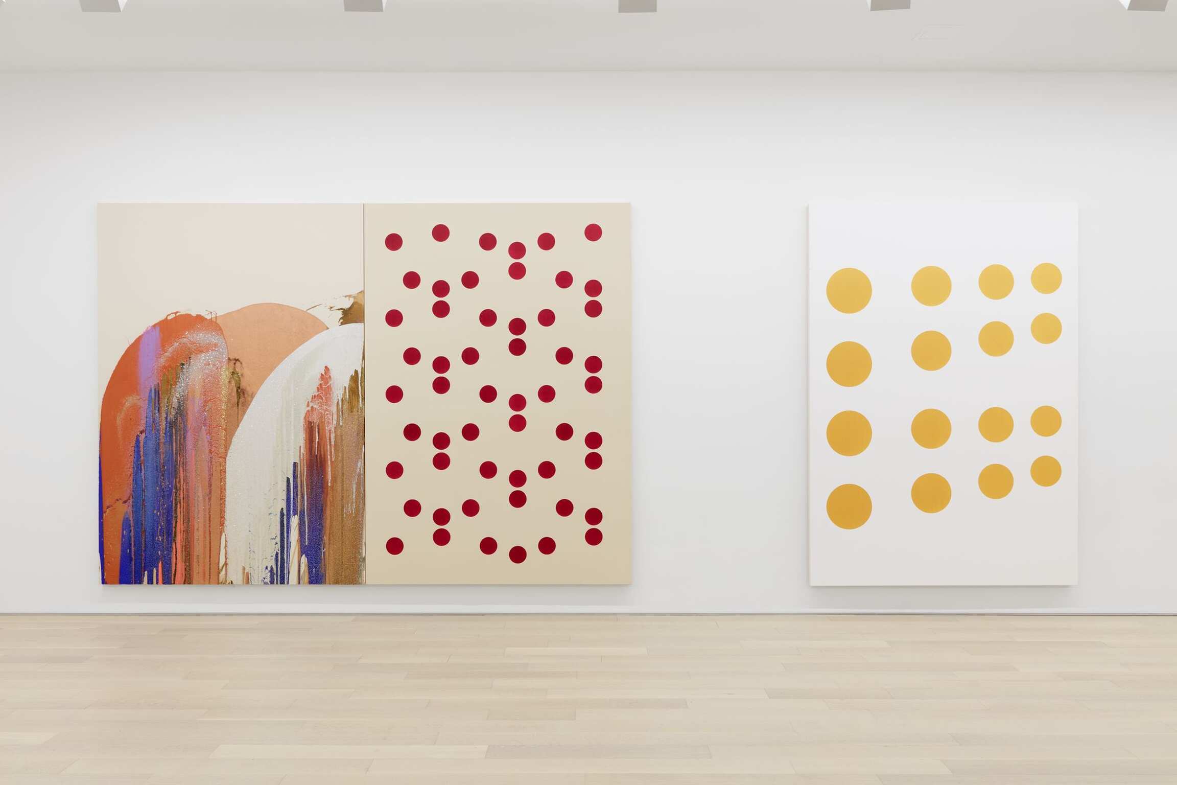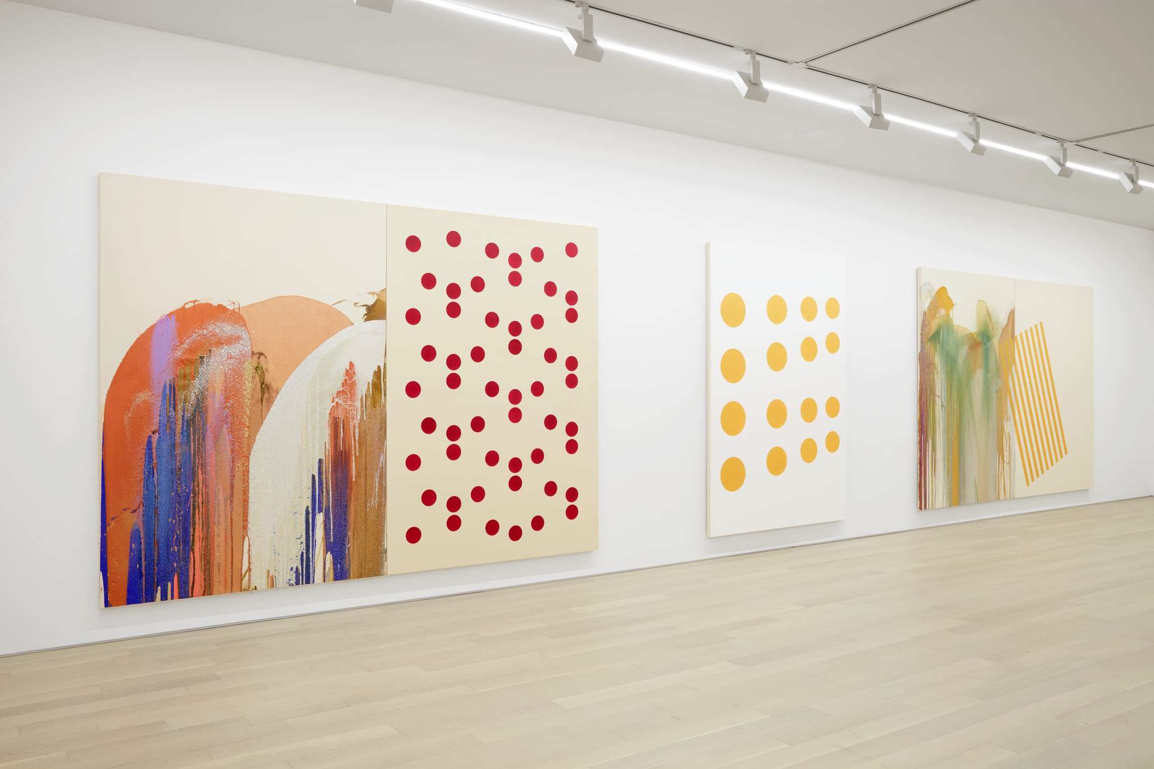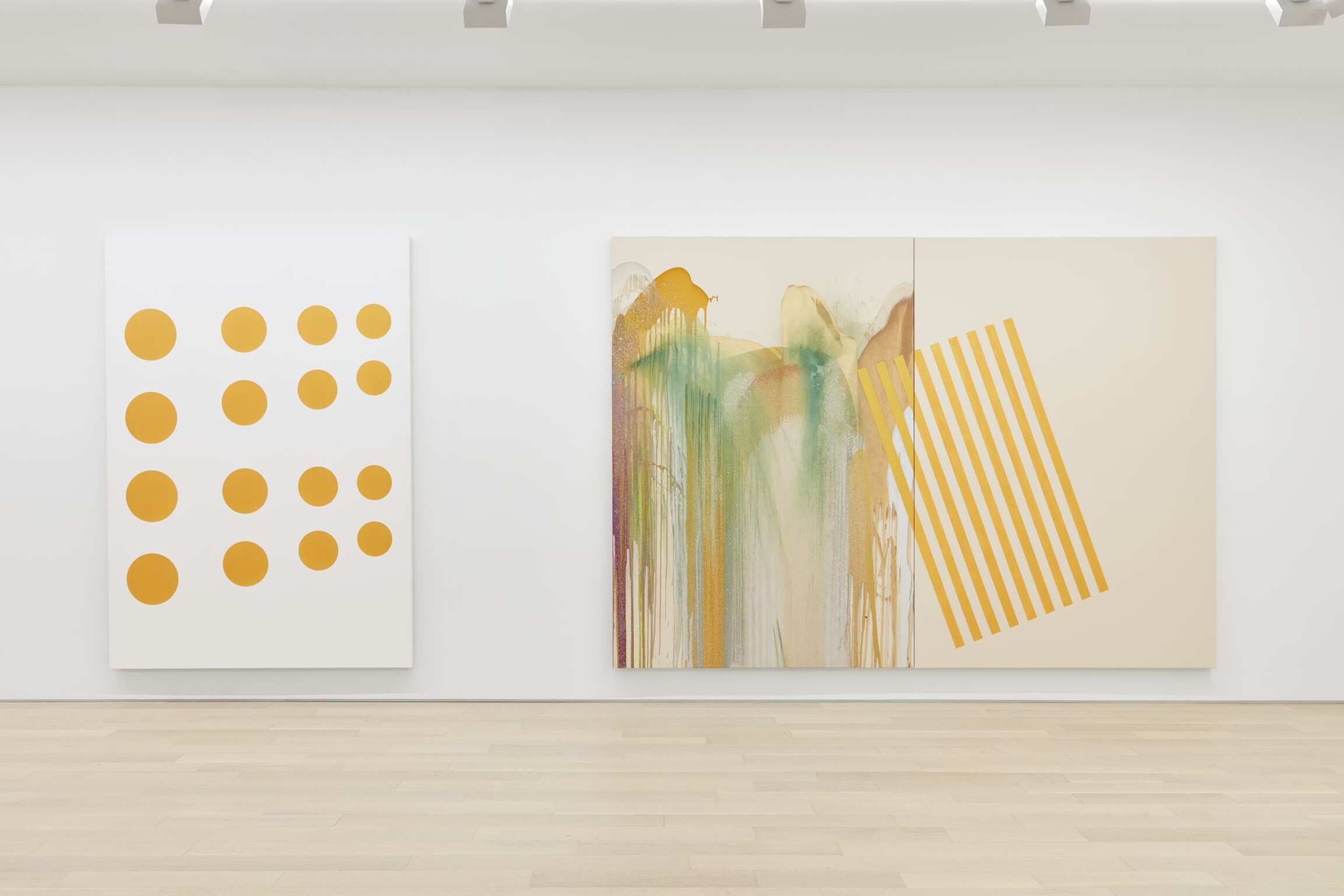 A series of new paintings produced in New York last summer will round out the exhibition. These new diptychs blend the artist’s modernist distinctive stripe and polka-dot paintings, with a fluorescent, pop influenced aesthetic. These works are also associated with the now famous Puddle and Pour Paintings, which were created by randomly pouring paint on a vertical canvas or a canvas placed on the floor and gesturally mixing in a diverse range of experimental materials such as glitter or automotive lacquer.