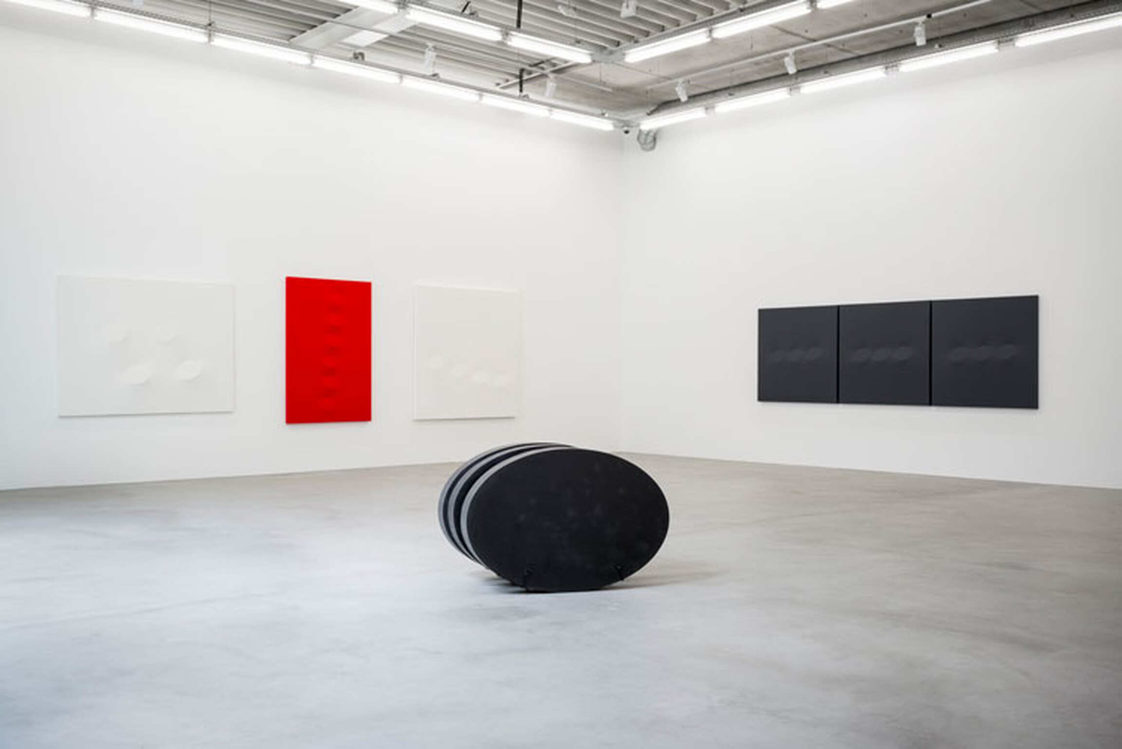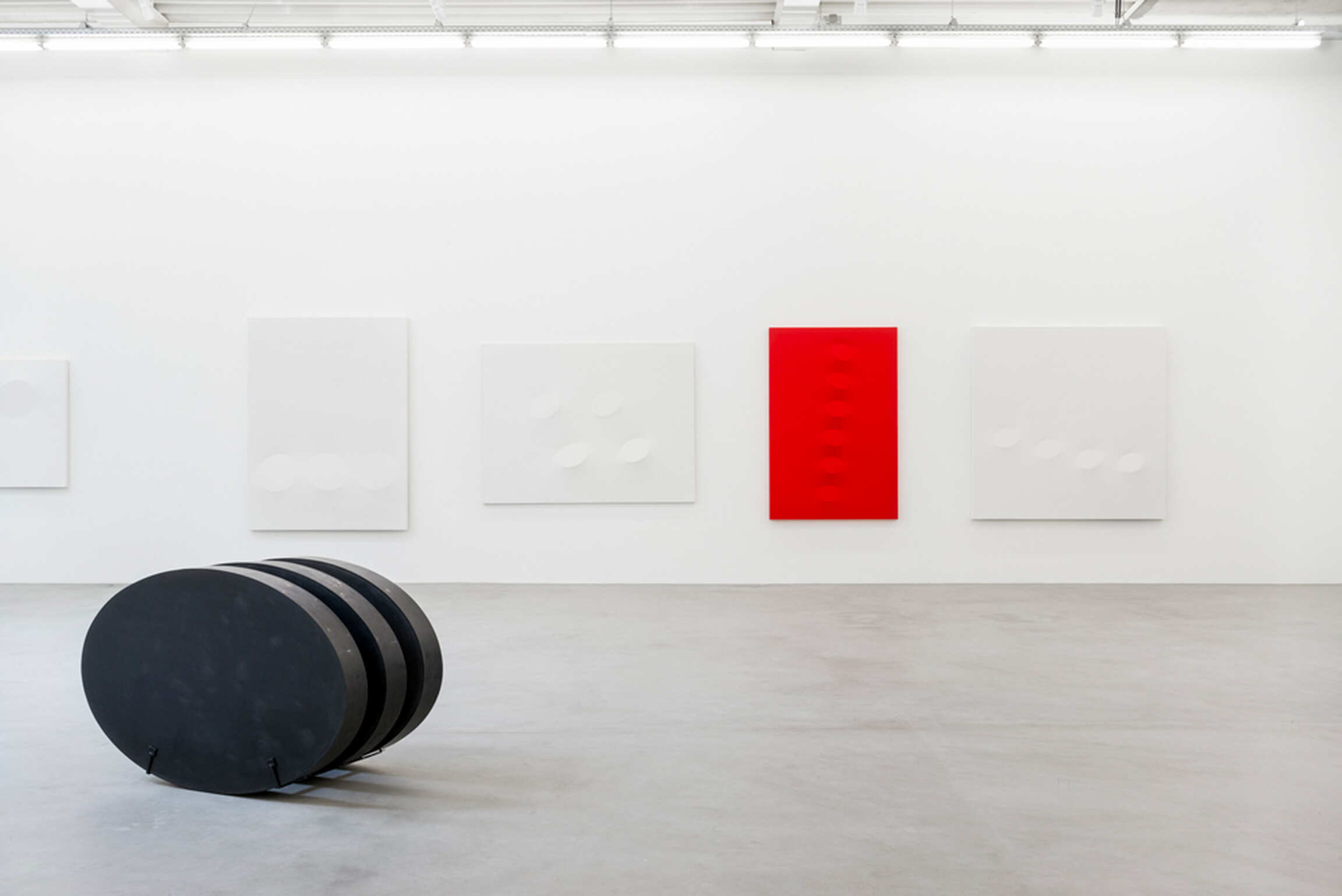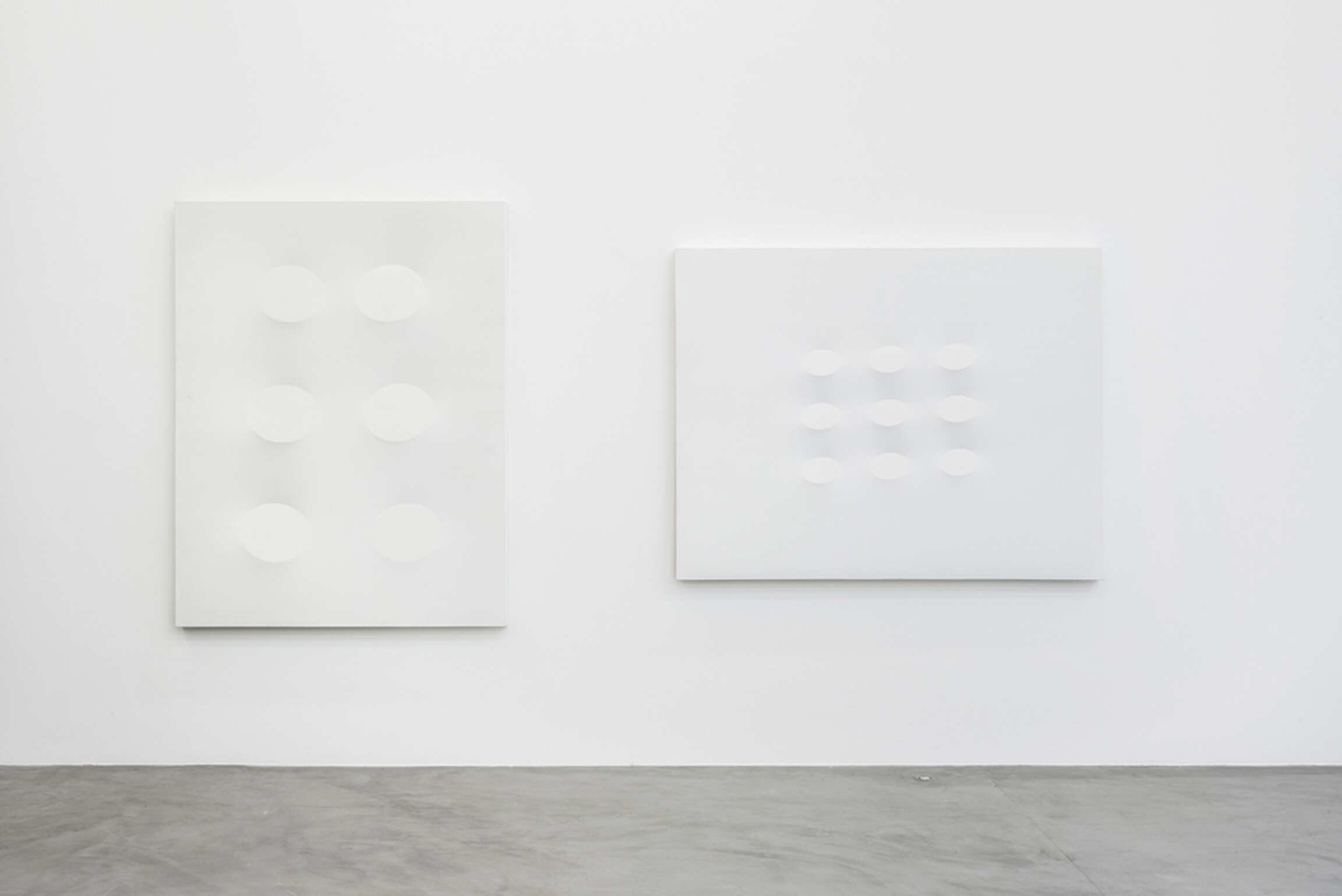 The exhibition is however centered on the disappearance of the oval. As Milan artists searched the opposites and the absence, Simeti joined them and overthrew the oval, causing it to “disappear”. Nevertheless, the shape re-emerges on the back of the canvas. The tension created by the oval is the defining element of the spatial experiment in the exhibition.
