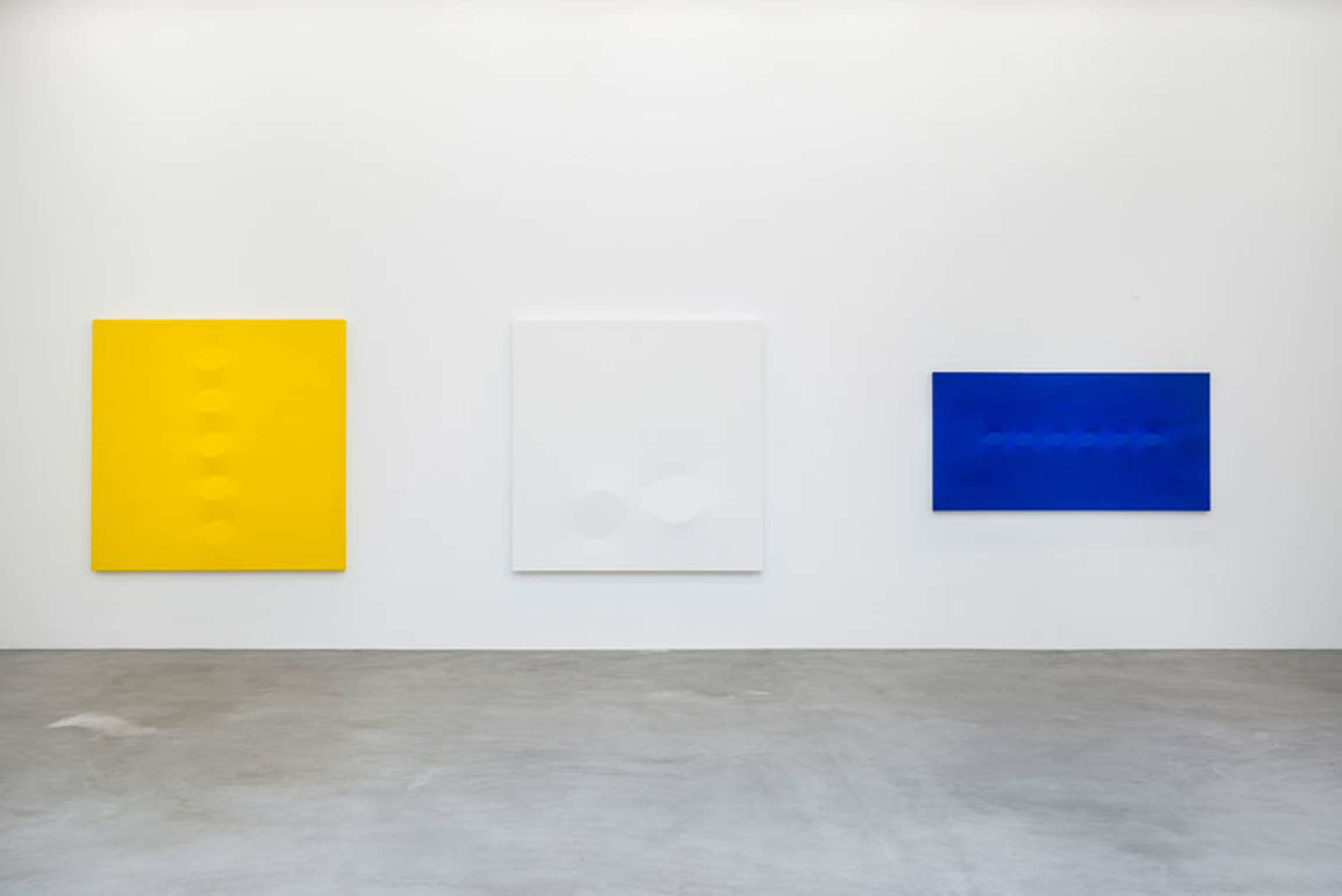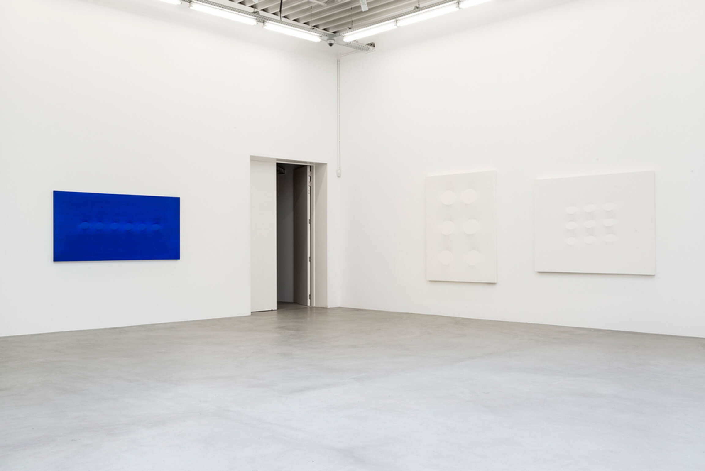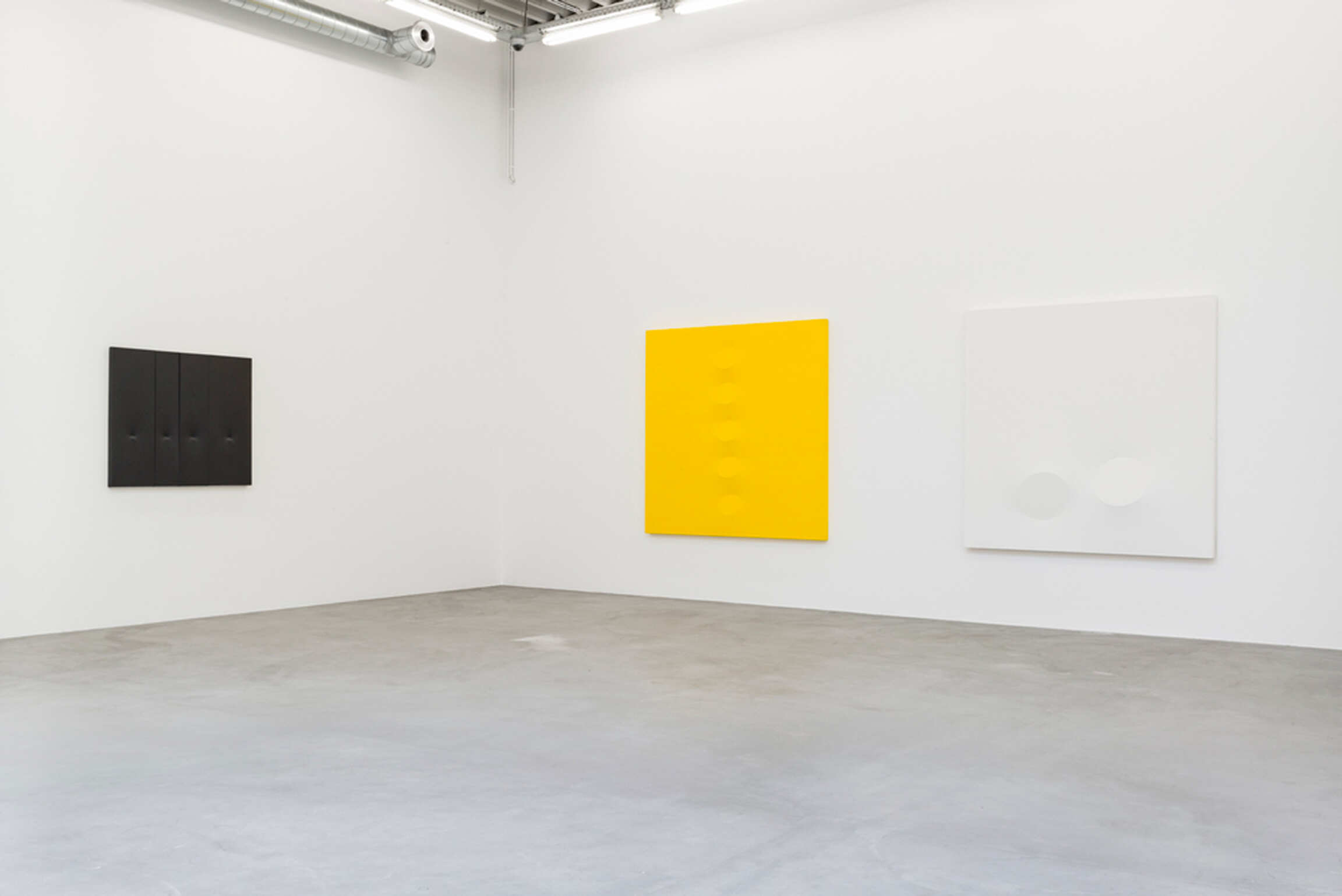 The exhibition is however centered on the disappearance of the oval. As Milan artists searched the opposites and the absence, Simeti joined them and overthrew the oval, causing it to “disappear”. Nevertheless, the shape re-emerges on the back of the canvas. The tension created by the oval is the defining element of the spatial experiment in the exhibition.